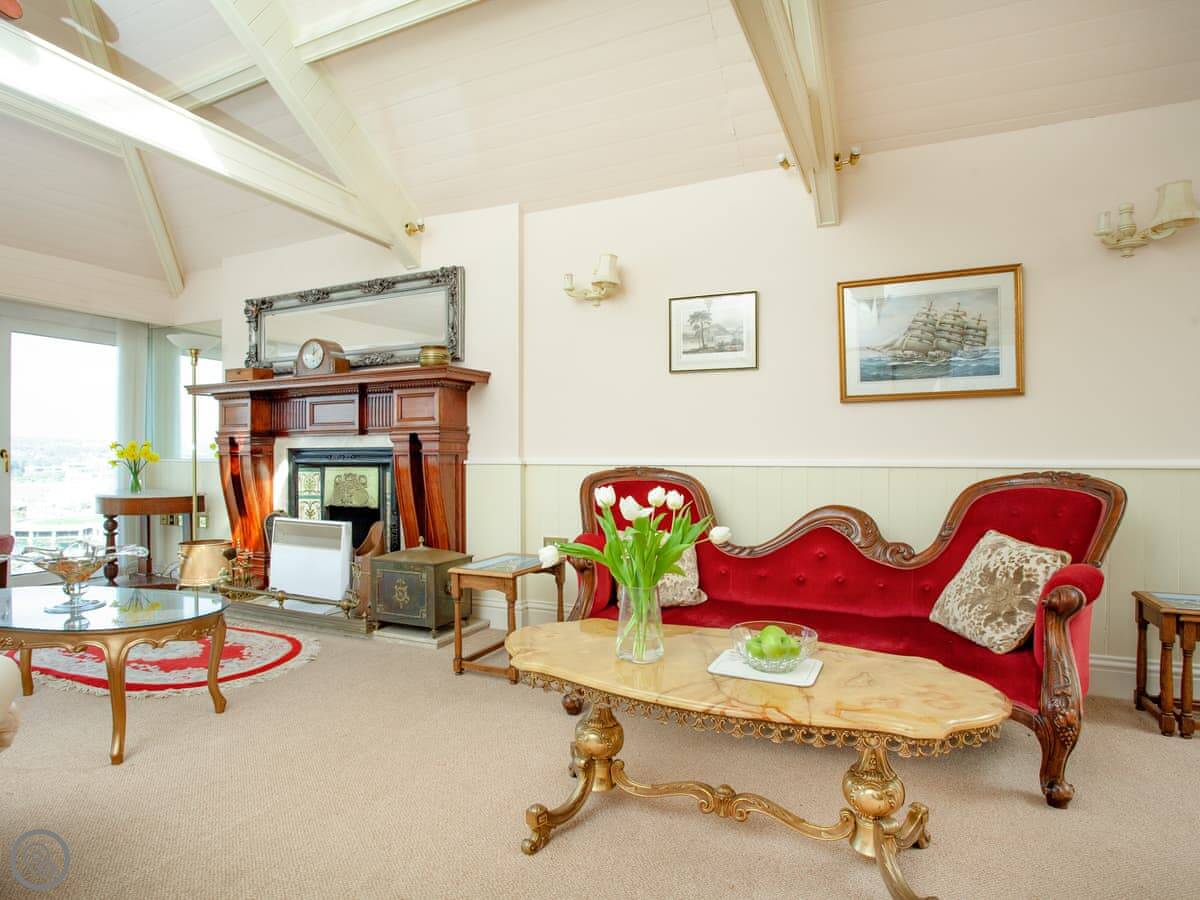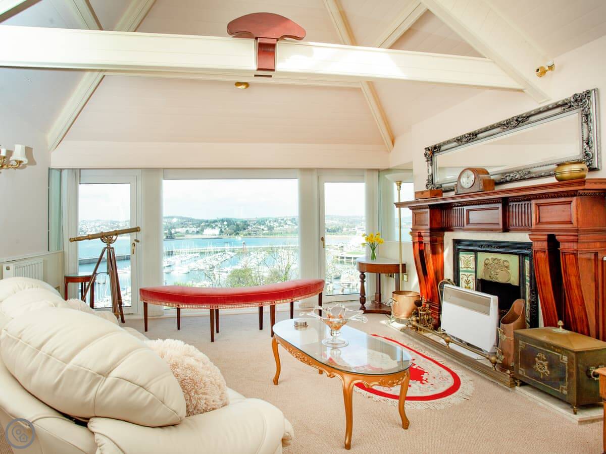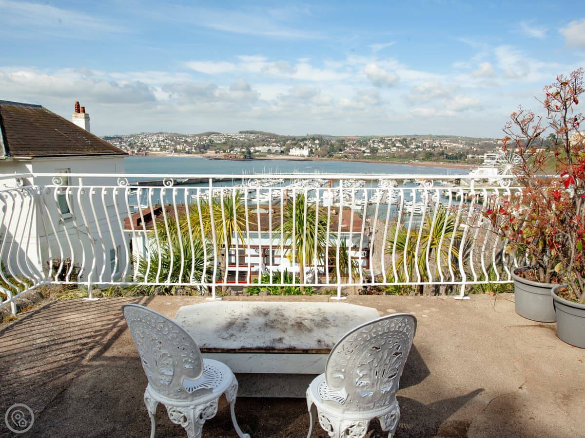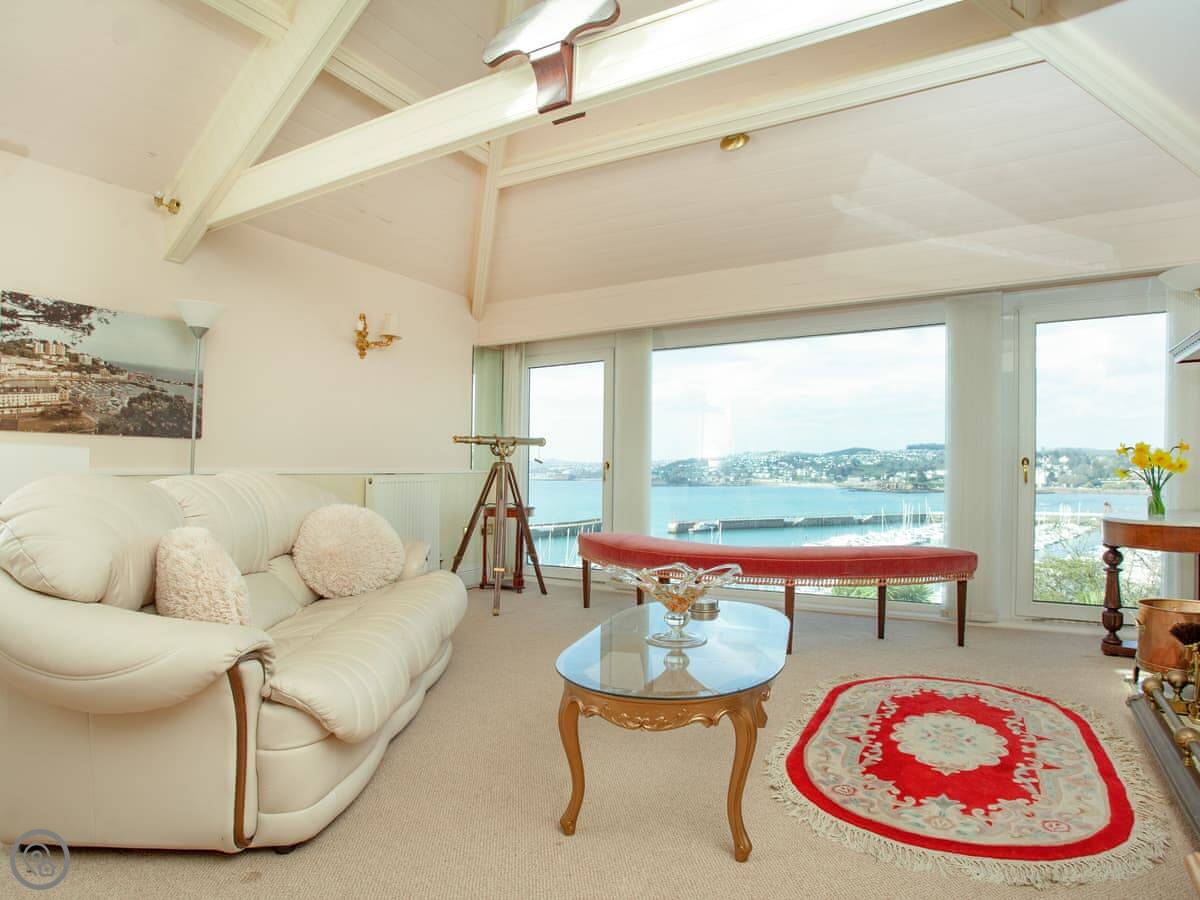 Riviera View is a one-bedroom flat on the first and second floor of a small building. It sleeps two. The main thing is the view. You get a full, wide view of Tor Bay from the main living space and the bedroom. It's on a quiet road, but you can walk to the harbour in five minutes and into town centre in about ten.