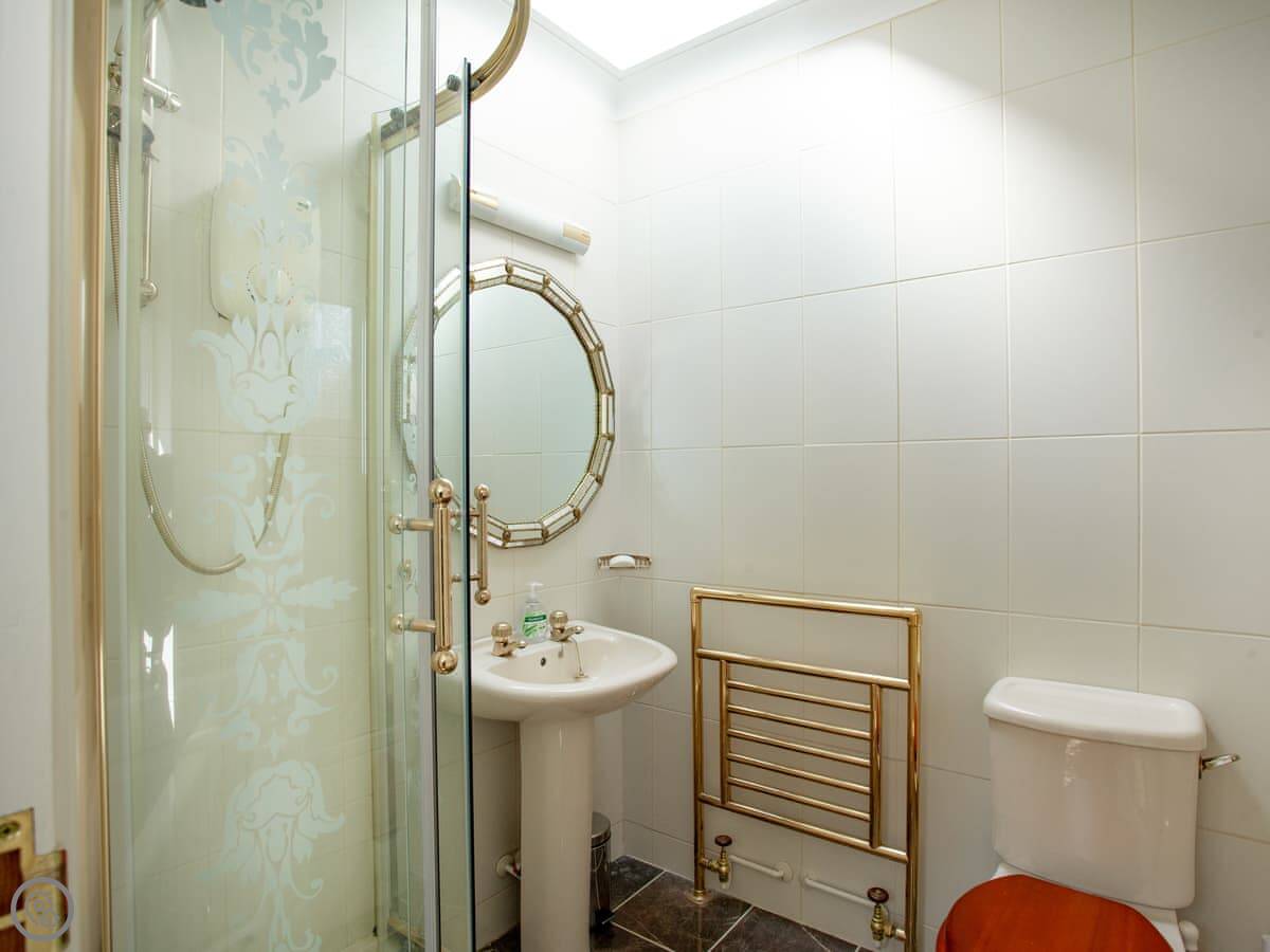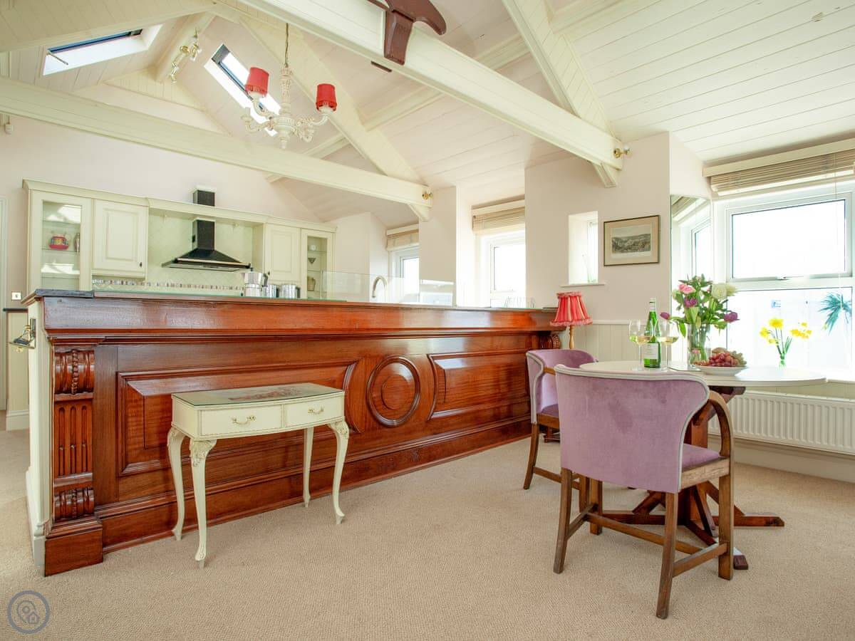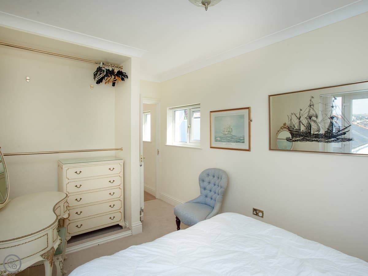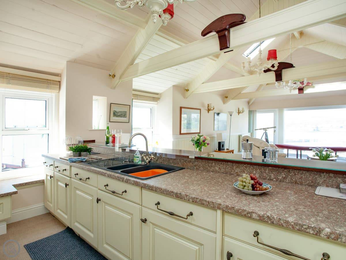 It's got a 4 Star rating. That means it's well looked after and comfortable. You enter on the second floor. That's where the bedroom and bathroom are. The bathroom has a bath with a shower over it. Then you go down a half flight of stairs to the main living area. It's all open plan, kitchen, dining, and sitting area. The kitchen has a dishwasher and a big island. There's a TV. I've left a telescope up there too, for looking at the boats.