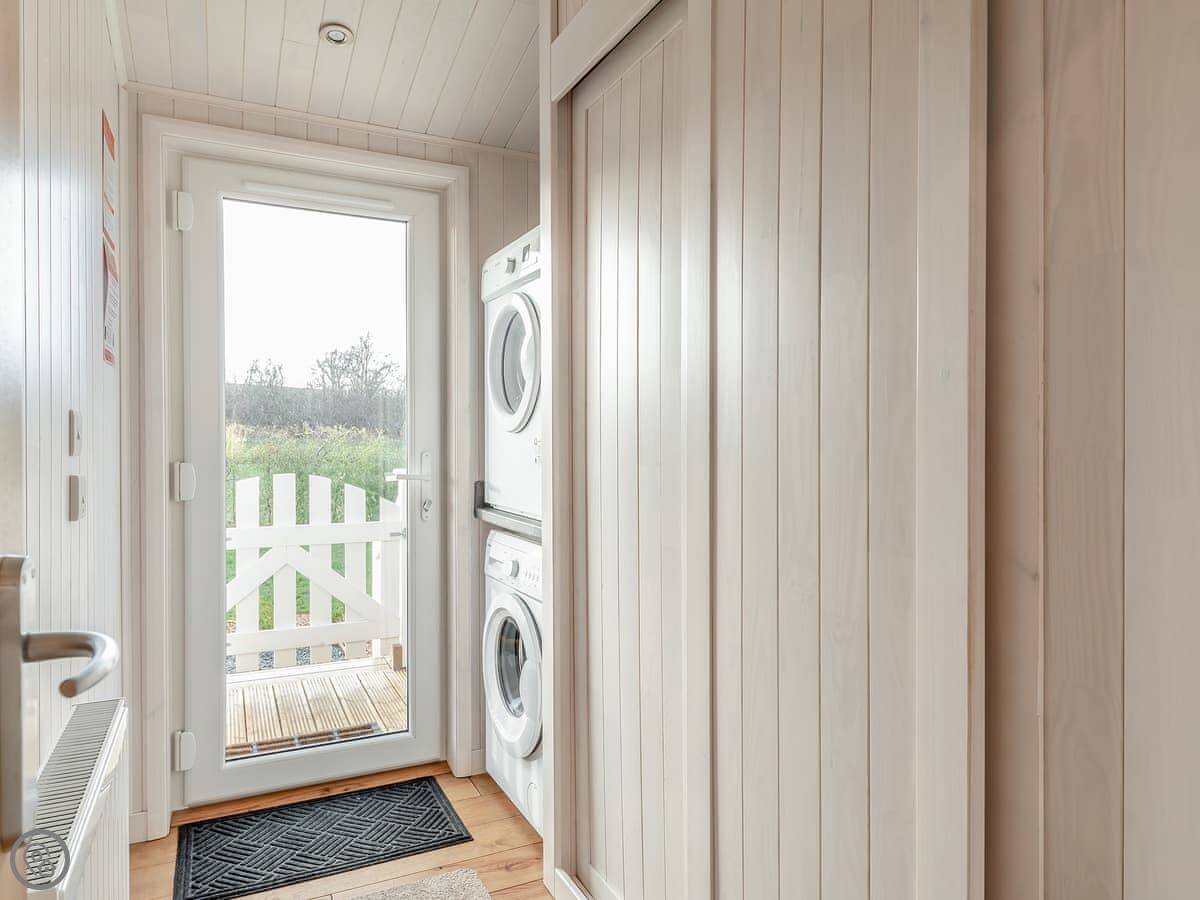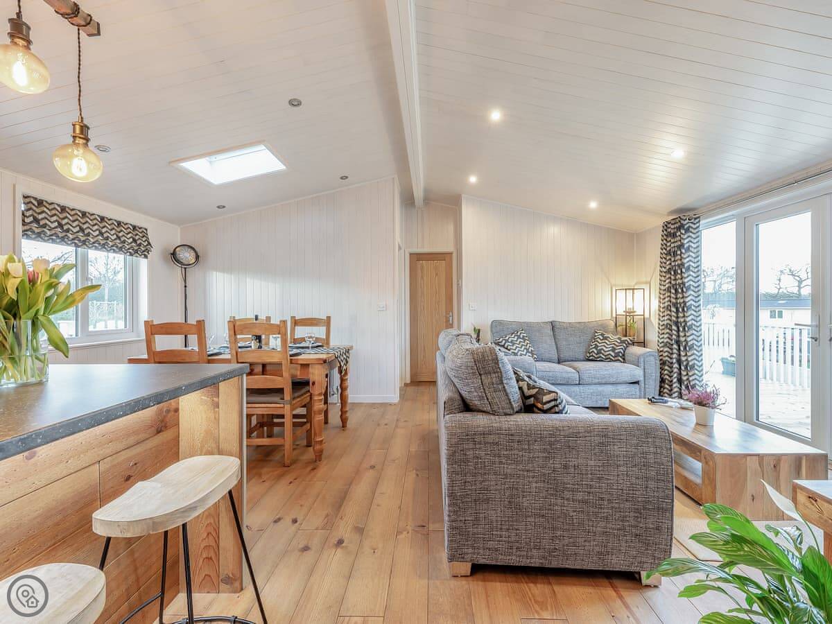 The main room is open plan, with the kitchen, living area, and dining all together. Big French windows open onto a large raised deck overlooking the lake. There's a small grassy area at the back too. The place has smart TVs, a washing machine, dishwasher, and Wi-Fi included. Bedding and towels are provided.