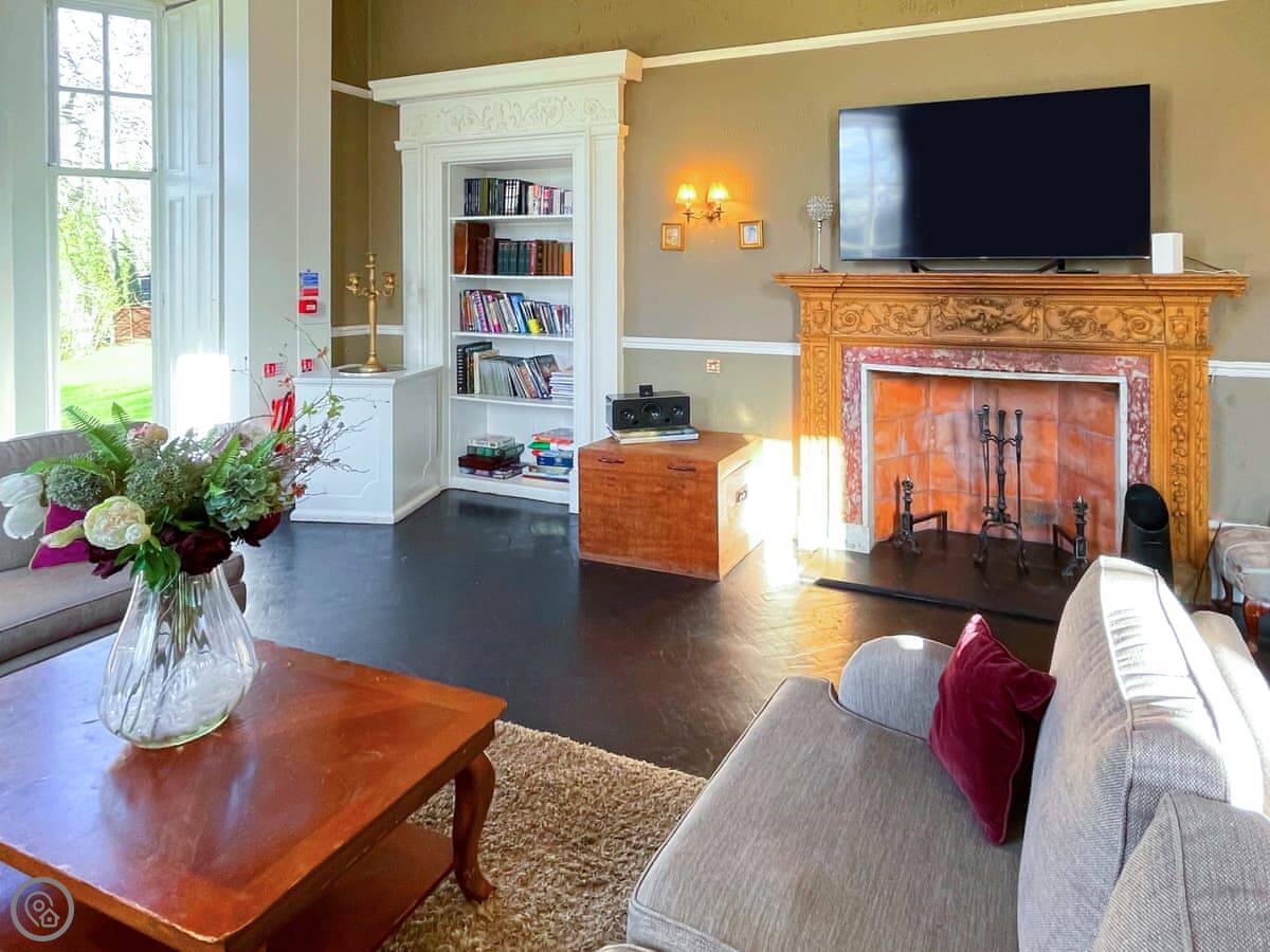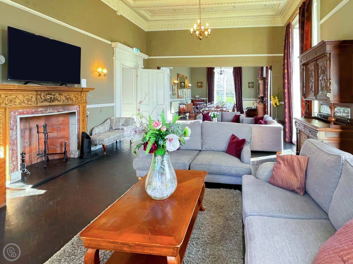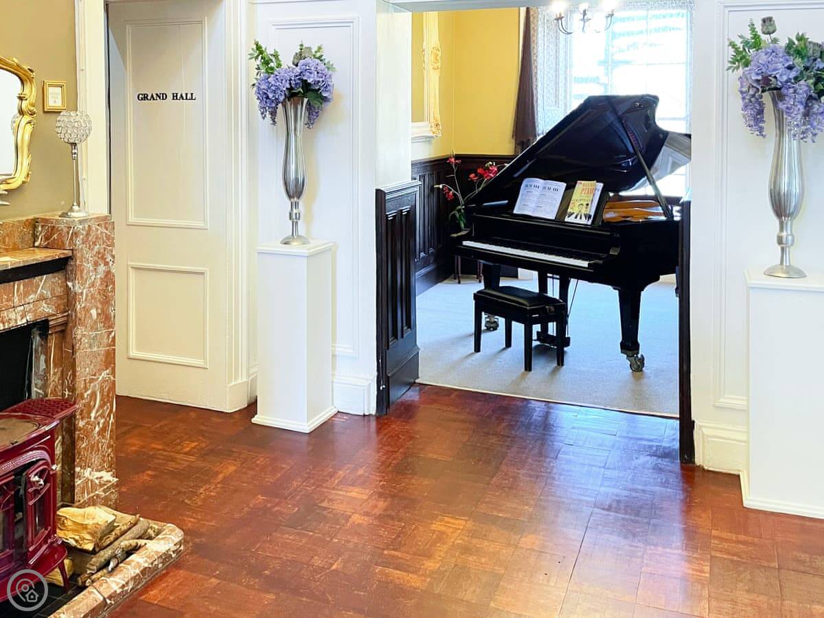 It's an 18th century building, so the rooms are tall. High ceilings, big windows. The main hall has a large fireplace and doors out to the garden. There's a piano in there if anyone plays.