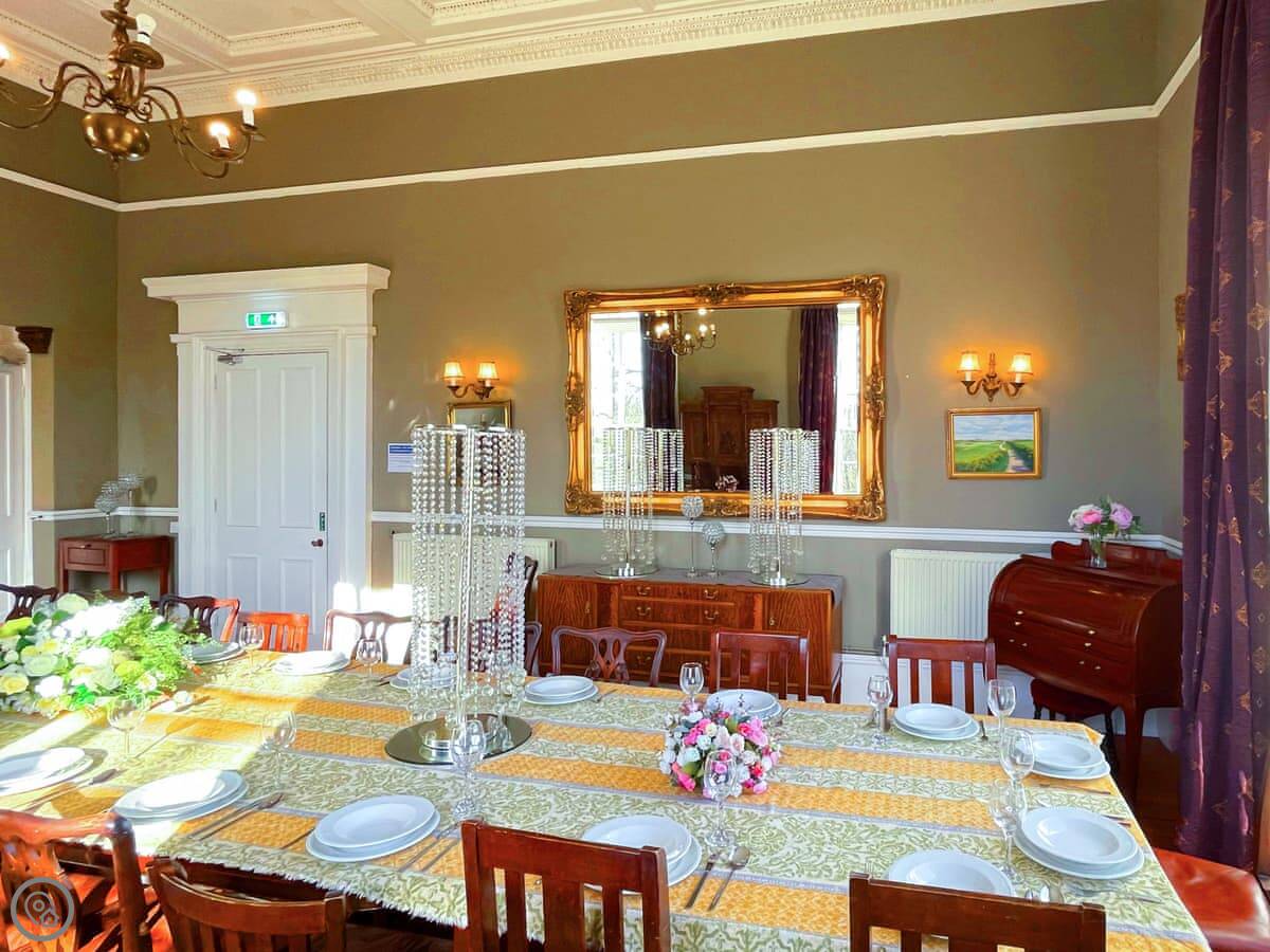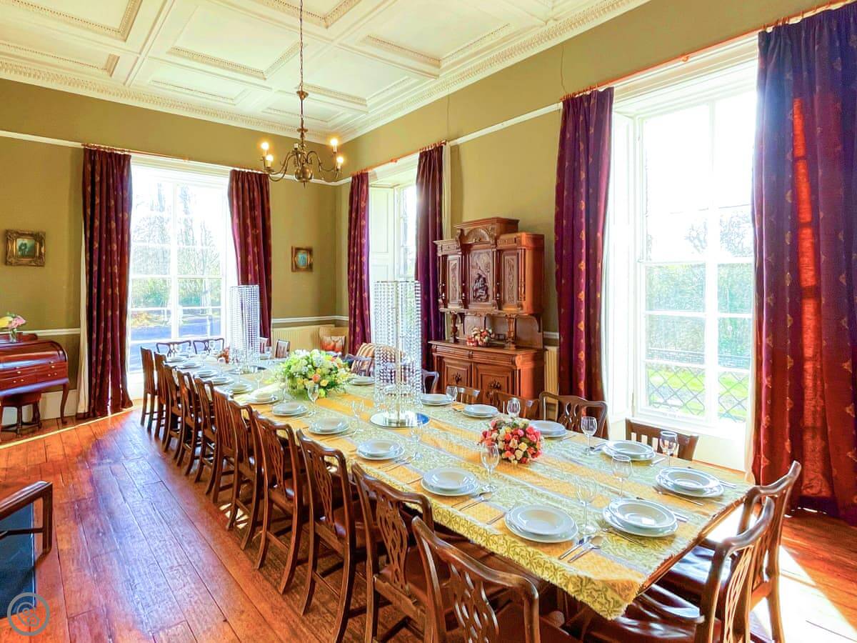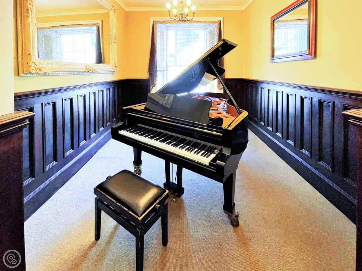 It's an 18th century building, so the rooms are tall. High ceilings, big windows. The main hall has a large fireplace and doors out to the garden. There's a piano in there if anyone plays.