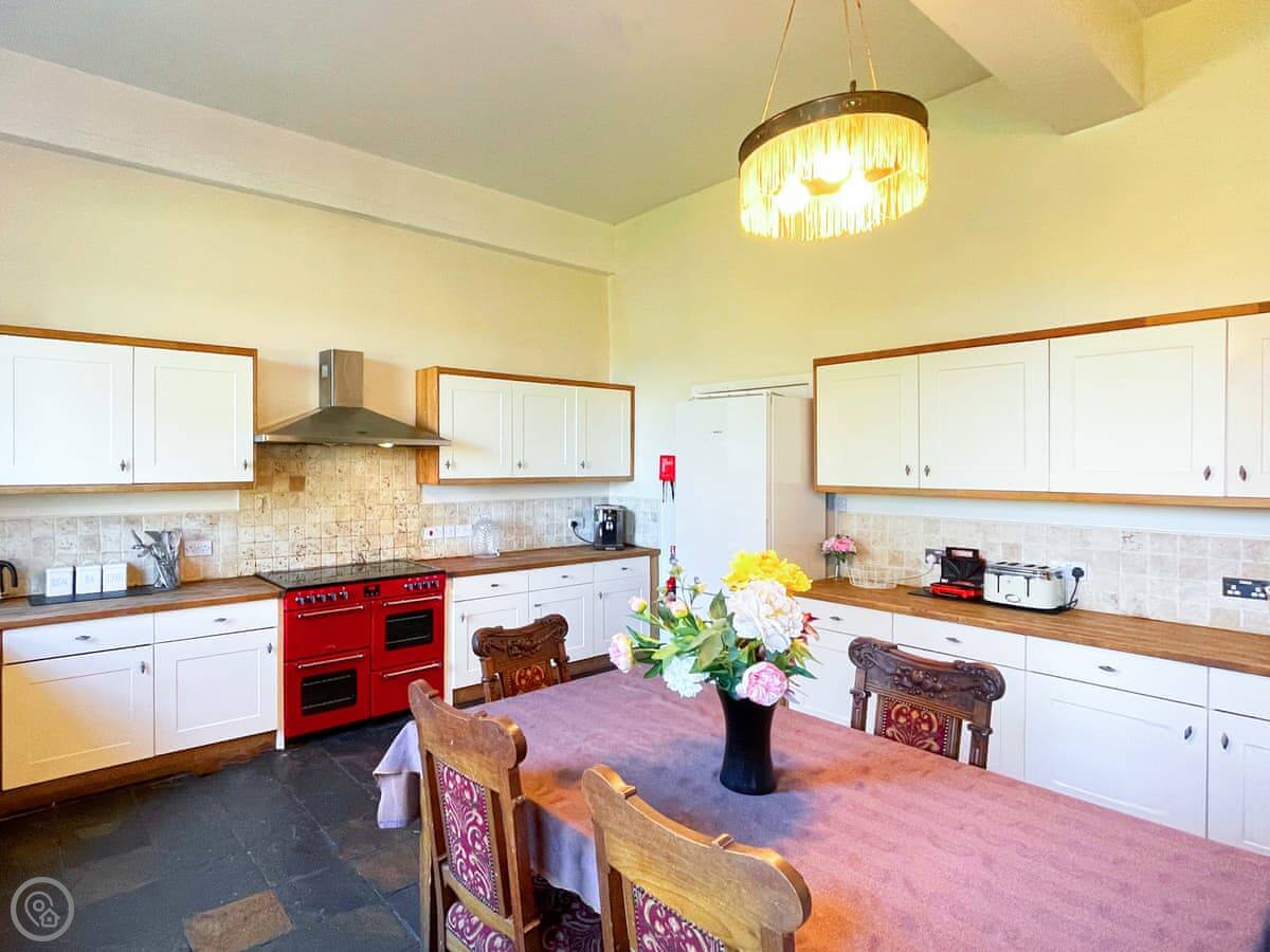 The facilities are what you'd need for a big group: plenty of showers, washing machines, dishwashers. There's a wood burning stove. WiFi works. Bedding and towels are included. You can bring up to three dogs.