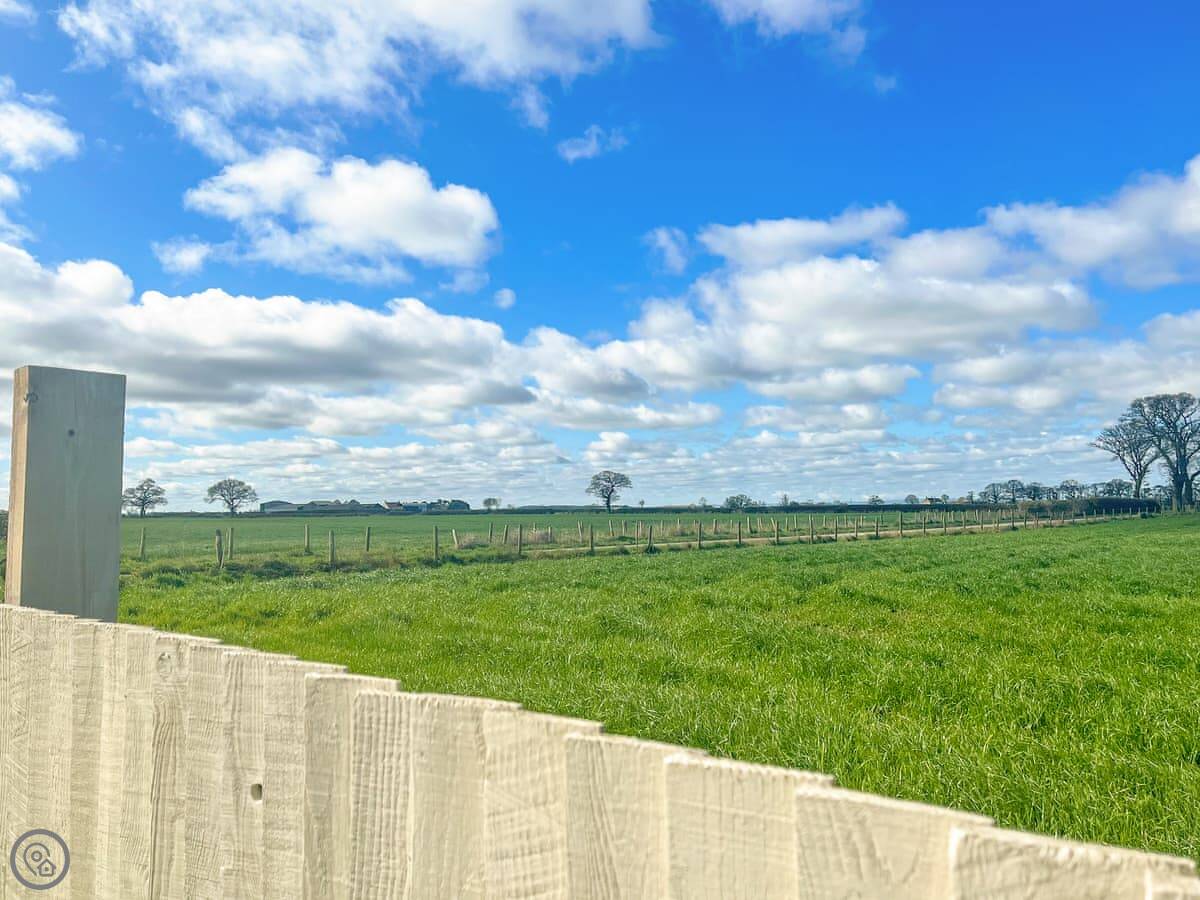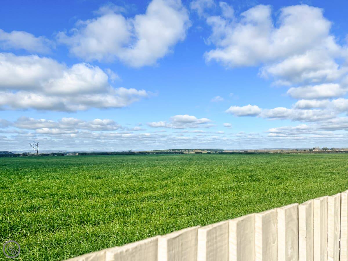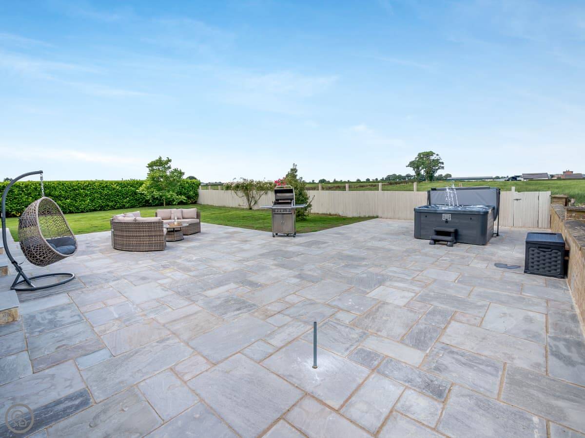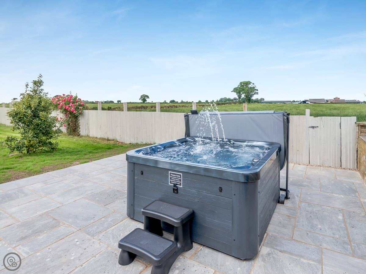The cottage looks out over fields. The garden has a patio with a table and chairs, and a BBQ. There's also a hot tub at the bottom of the garden. The views are across Yorkshire farmland.