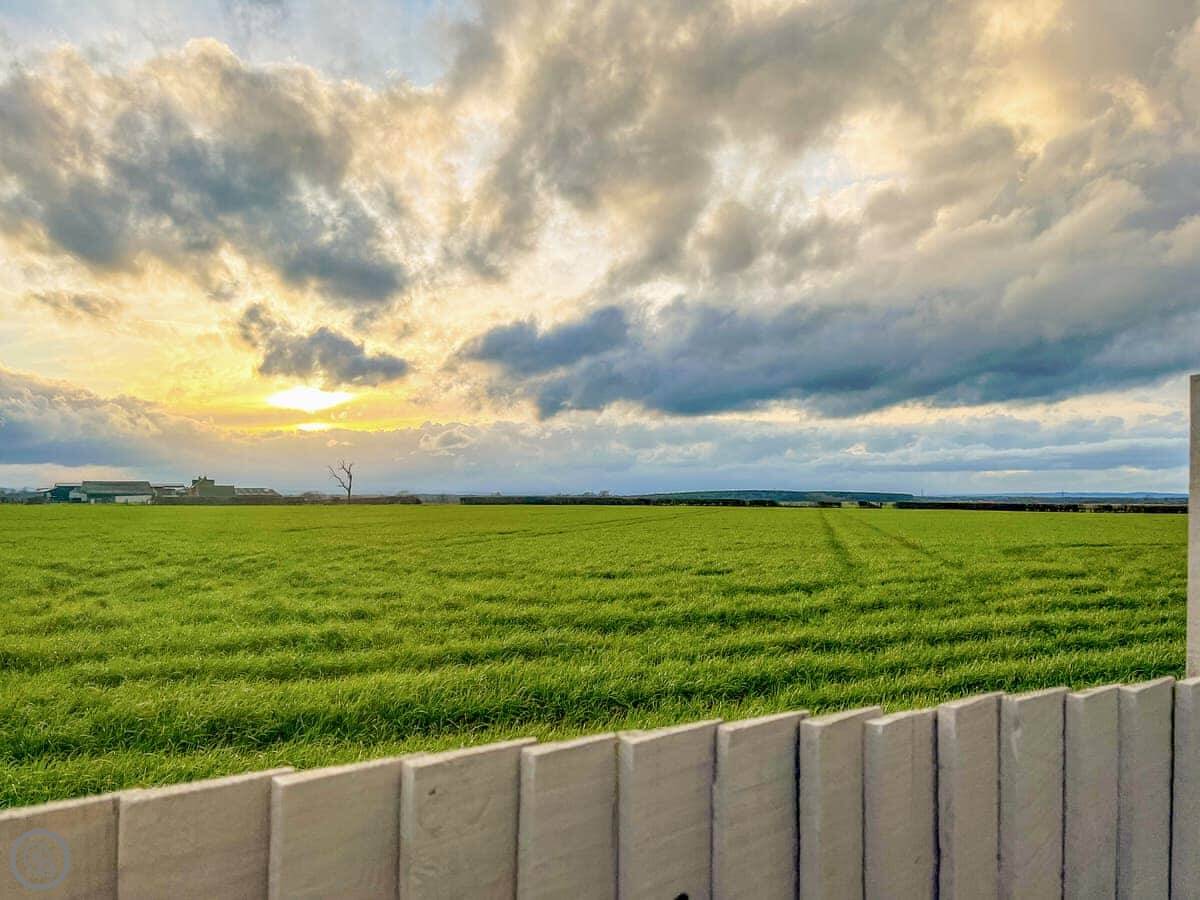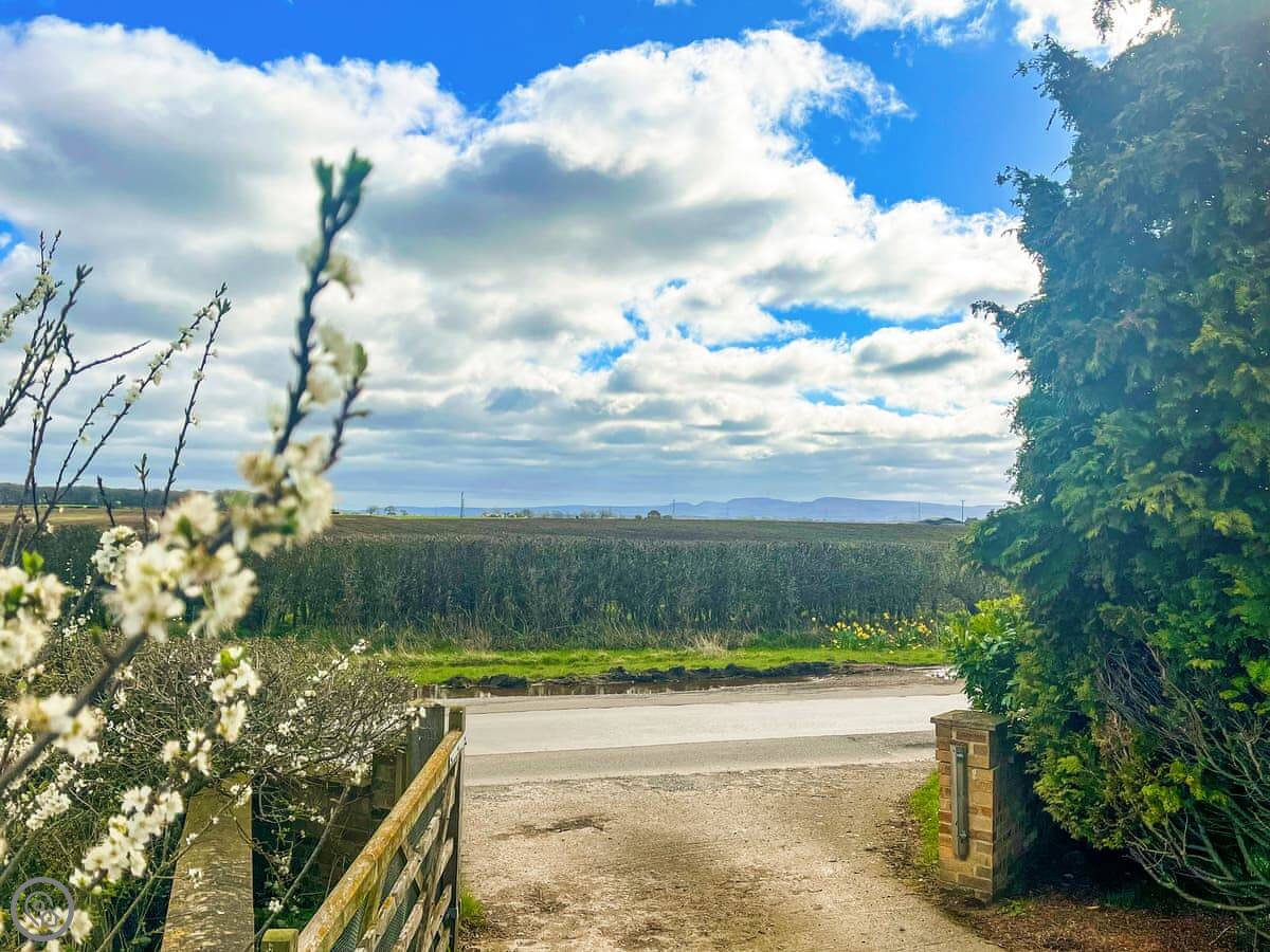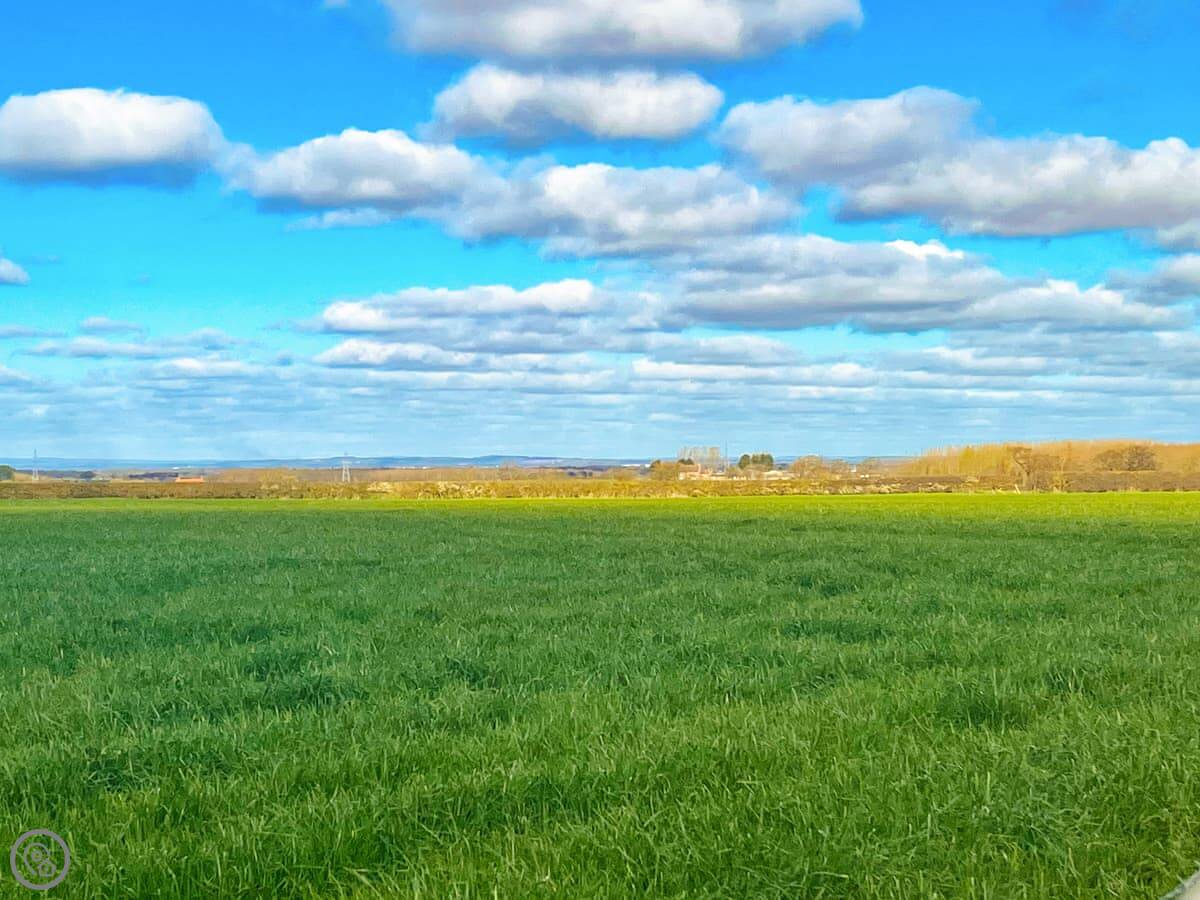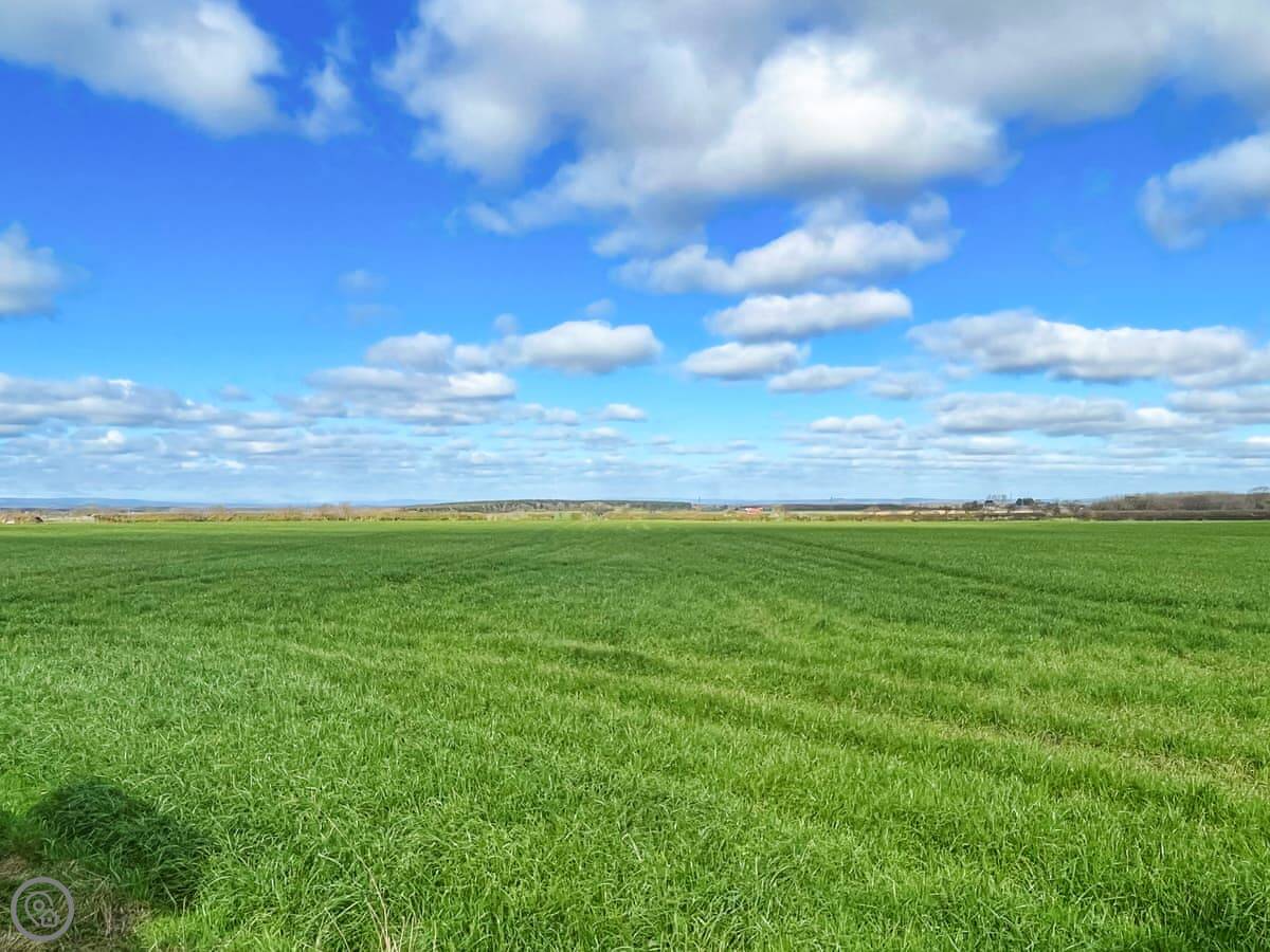 The cottage looks out over fields. The garden has a patio with a table and chairs, and a BBQ. There's also a hot tub at the bottom of the garden. The views are across Yorkshire farmland.