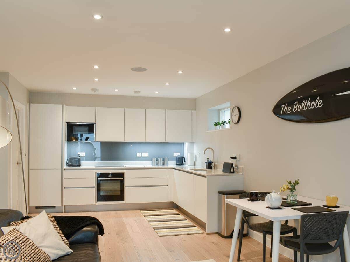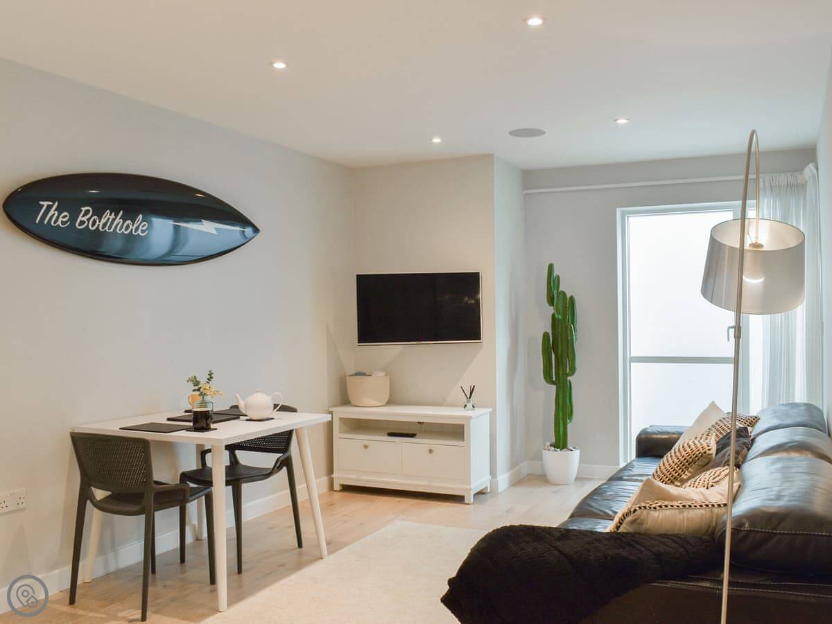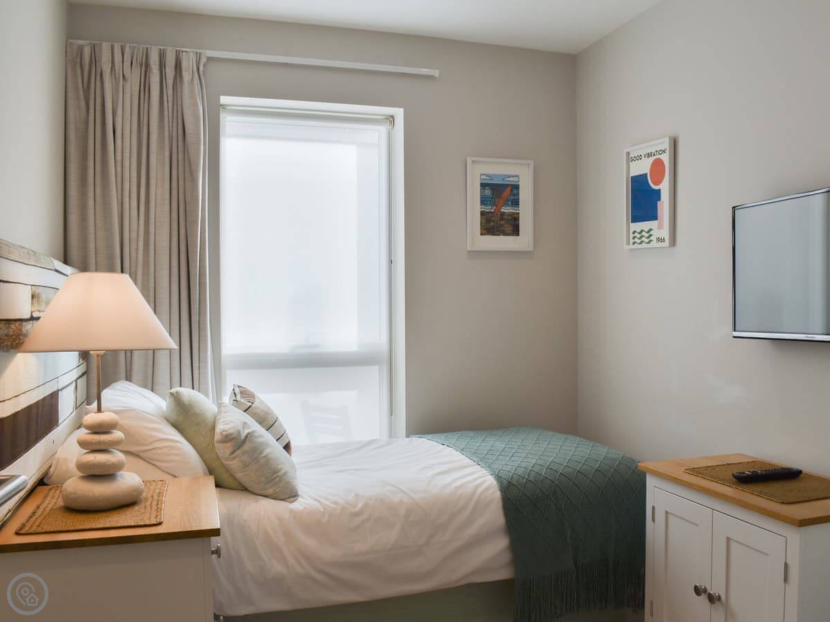 Welcome to The Bolthole, a fabulous ground floor apartment designed to offer both a relaxing getaway or the ideal base to set forth and explore the many delights this area possesses. The Bolthole is set within Seascape, a modern apartment complex a short distance from some of Newquay’s most amazing beaches and attractions, including the iconic Fistral Beach and Newquay Zoo amongst them. Your holiday home comprises a welcoming open plan living space. The kitchen area has an excellent array of equipment, storage space and all you need for preparing your favourite meal. The living space has super-comfy seating, ideal for settling down for that movie or to immerse yourself in that novel you brought with you. Doors lead to a small private outdoor space with seating, so you can enjoy morning coffee before you depart for the day, or glass of bubbly to celebrate your holiday. The master bedroom is delightful with a kingsize bed and a subtle nautical theme, also with doors leading to the outside space. The second bedroom accommodates one guest in superb comfort and makes a tranquil, peaceful space. The family bathroom has a shower over a bath, so long, leisurely soaks can be enjoyed to the full.