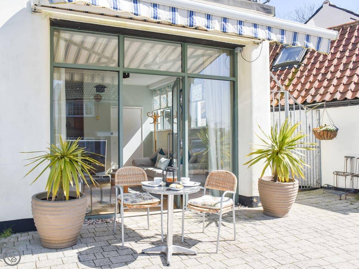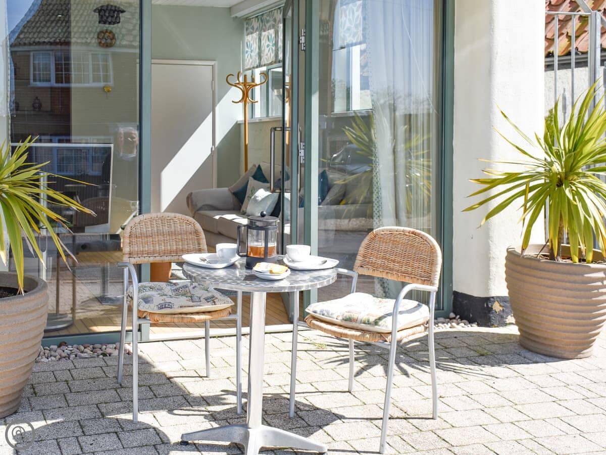 Outside there's a little paved area with a bistro table and chairs. It gets the sun, which is nice. It's right next to the road though, so there's some village traffic going past to the river. Nothing major, just so you know.