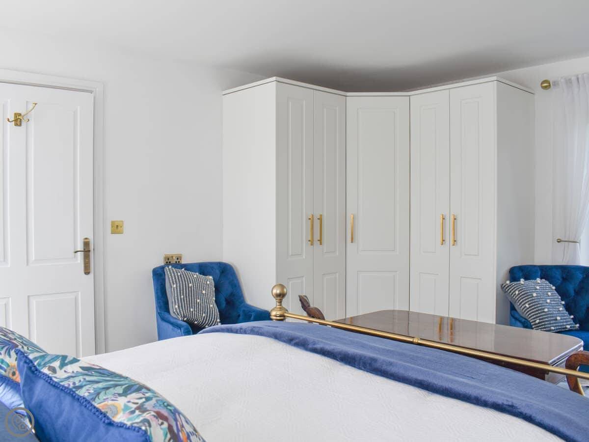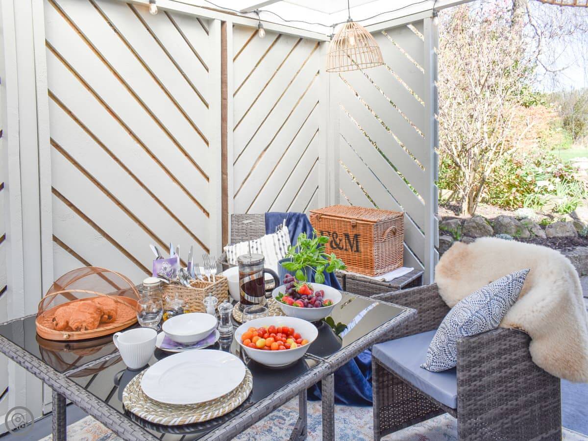 Enter a neatly designed kitchenette equipped with everything you need for cooking a meal for two. Head through into the main room where you will find a large kingsized bed topped with a luxury mattress and fit with Egyptian cotton bedding for an exquisite night’s sleep. Fitted wardrobes offering plenty of storage, comfortable chairs, a Smart TV, and a small table suitable for dining complete this lovely room. The fabulous spa-like en-suite bathroom complete with a rainfall shower is perfect for a quick freshen up in the morning. The outdoor area offers a covered carpeted pergola leading to the sunny aspect garden. From here you can sit and admire the ever-changing views over to the Clwydian range in the day or gaze at the skies while sitting around the firepit in the evening.