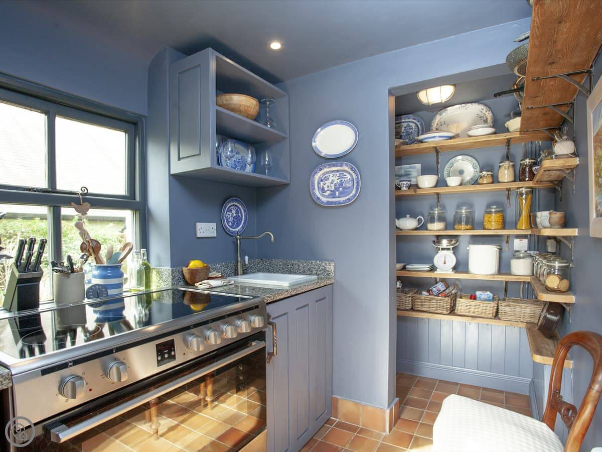 Downstairs is a bit of an odd layout, which is normal for these places. You come into the main living area with a wood burner and a TV. Through an archway is the main kitchen and a walk-in pantry, which is handy. There's a door out to the garden from there. The garden has a patio and lawn.