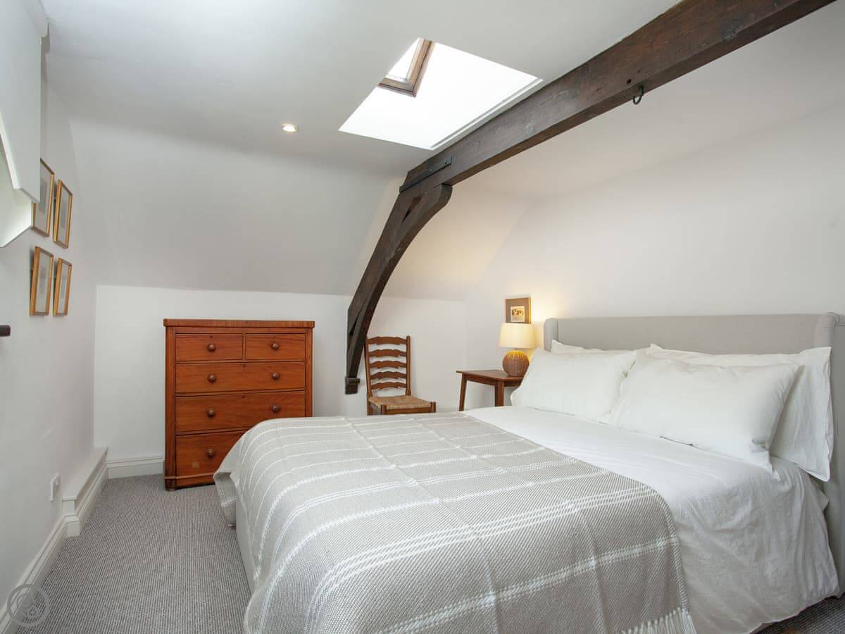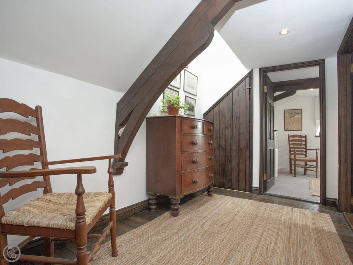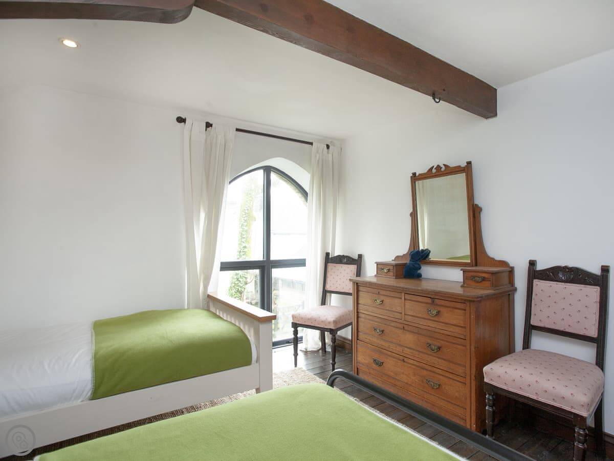 It sleeps five. Two bedrooms and one bathroom upstairs. The bedrooms are a decent size. One has a king-size bed, the other has a double and a single together. The shower room is a good size too.