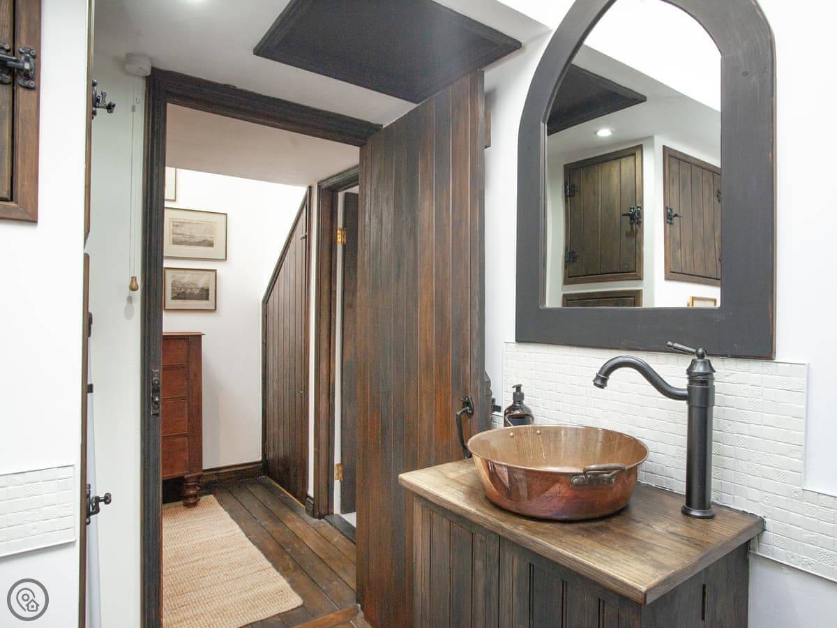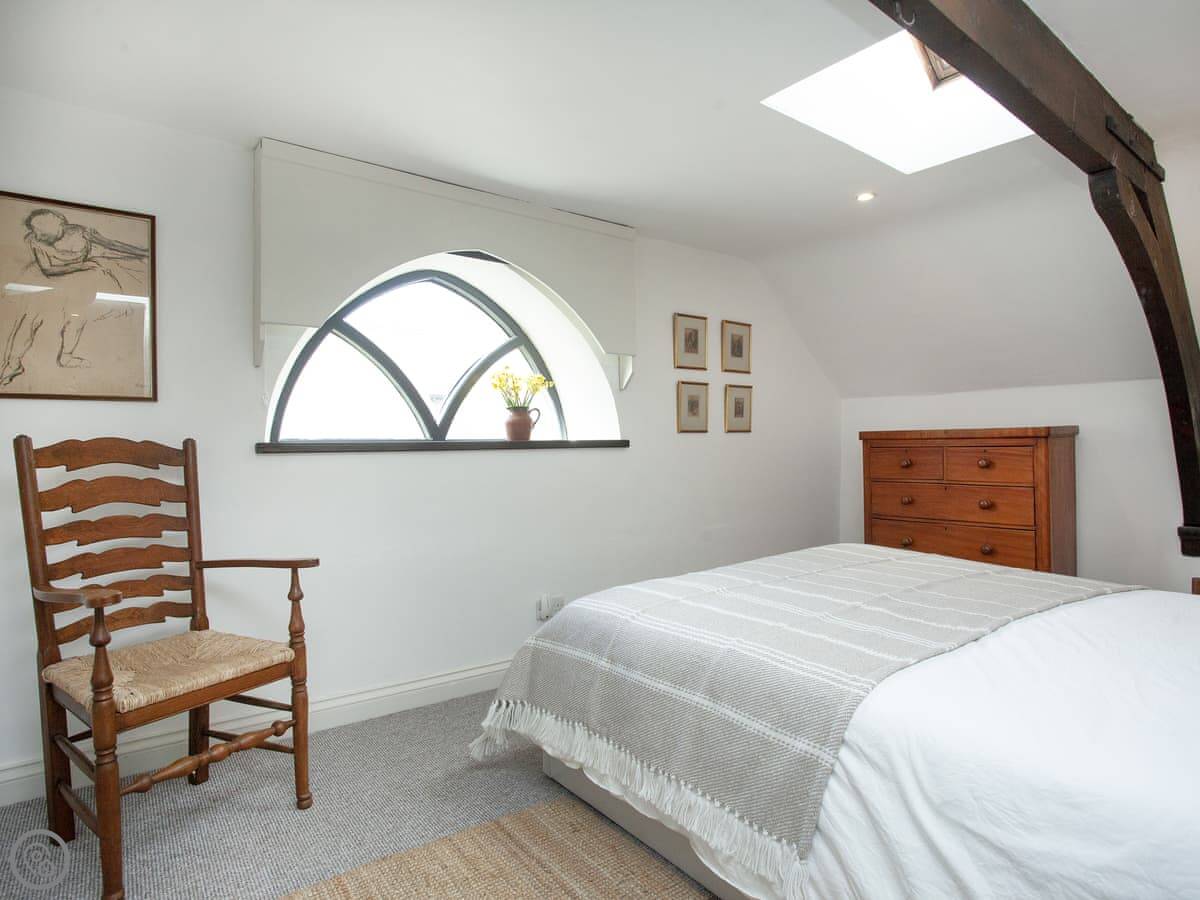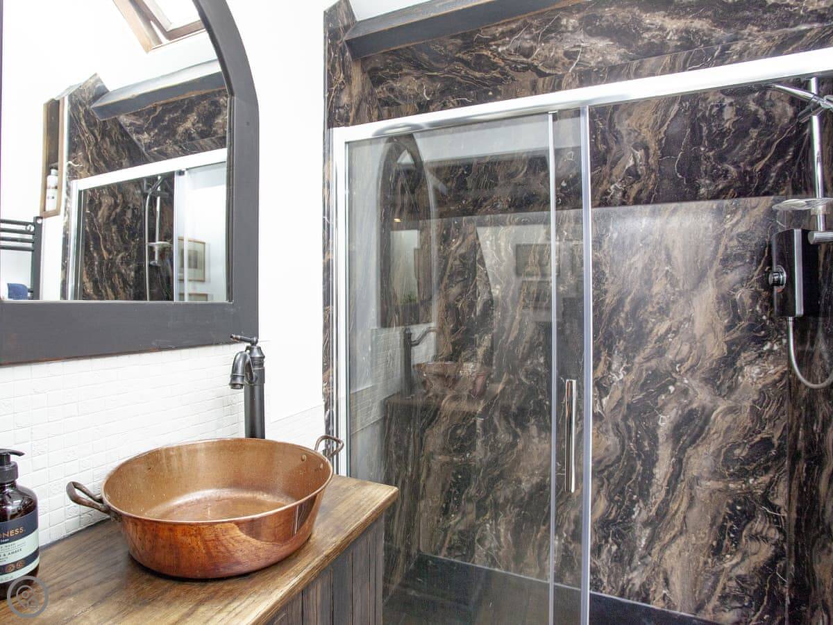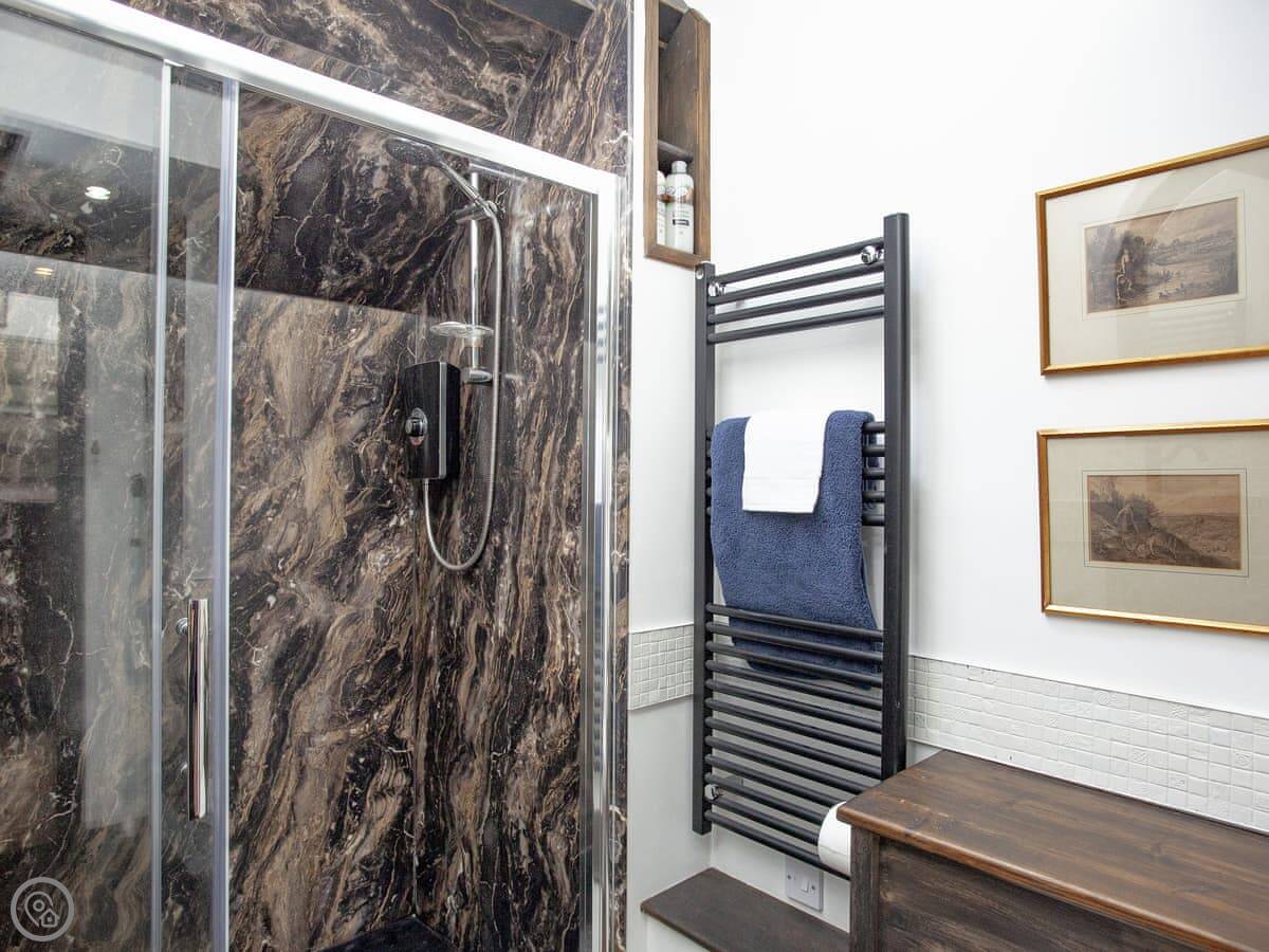 It sleeps five. Two bedrooms and one bathroom upstairs. The bedrooms are a decent size. One has a king-size bed, the other has a double and a single together. The shower room is a good size too.