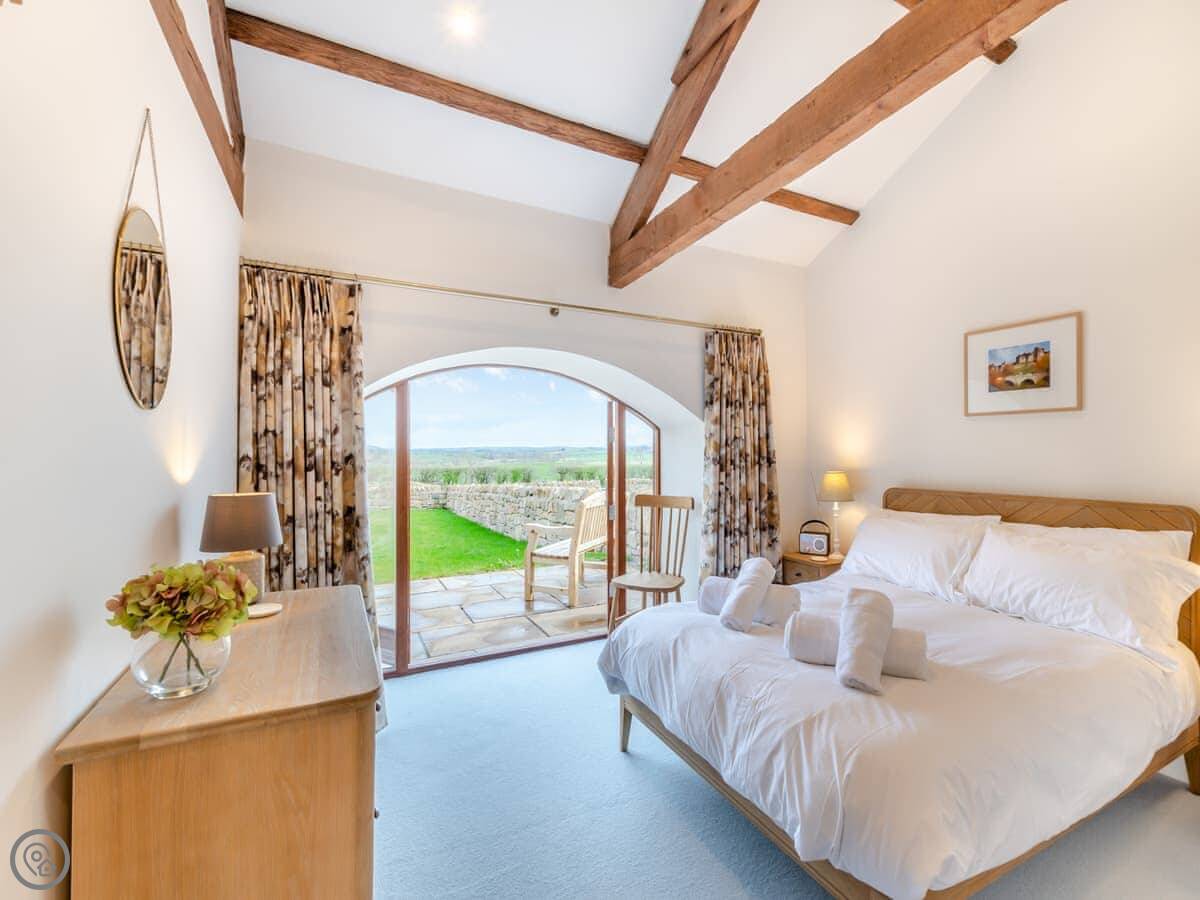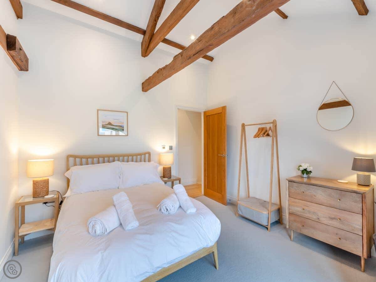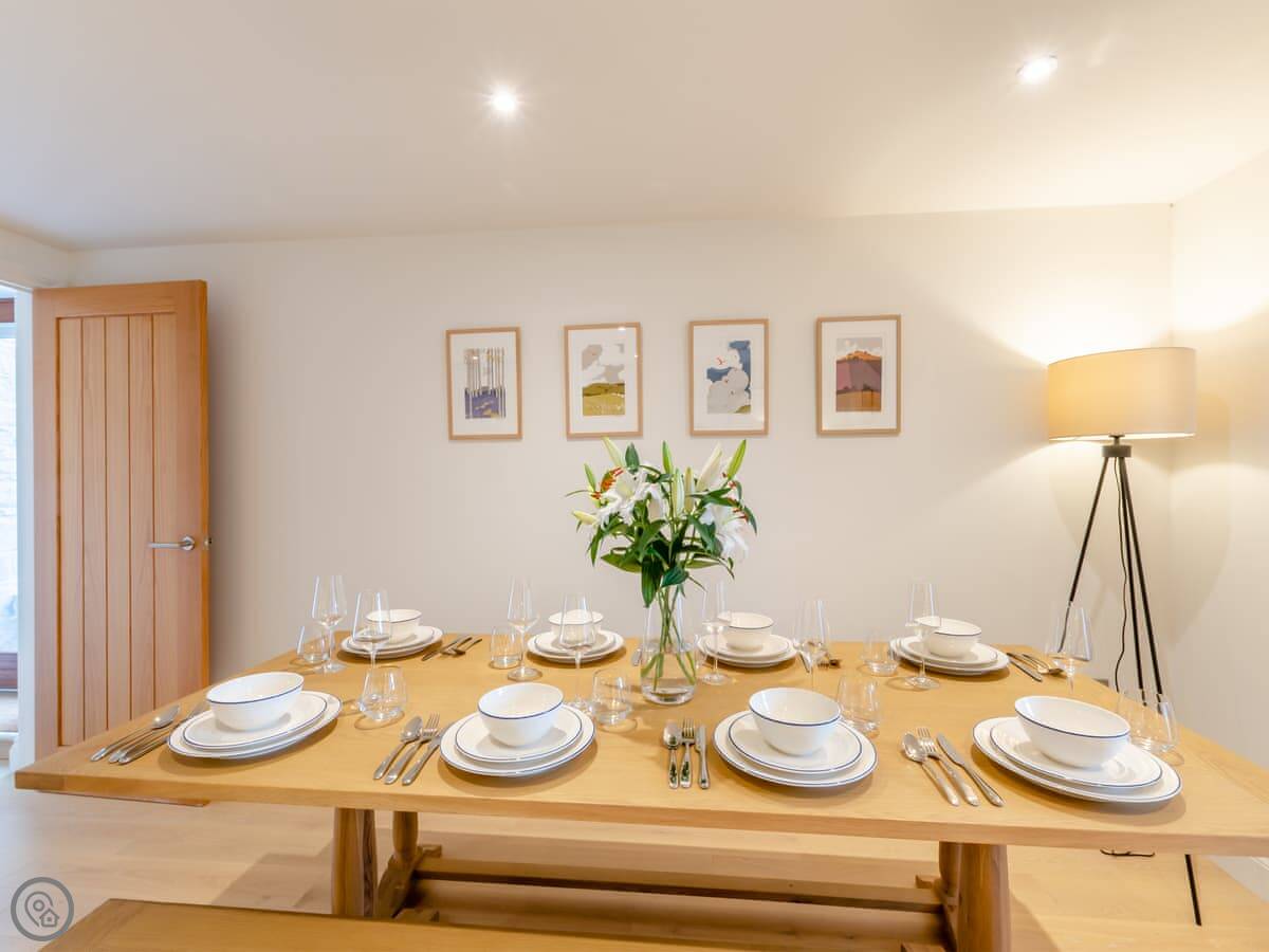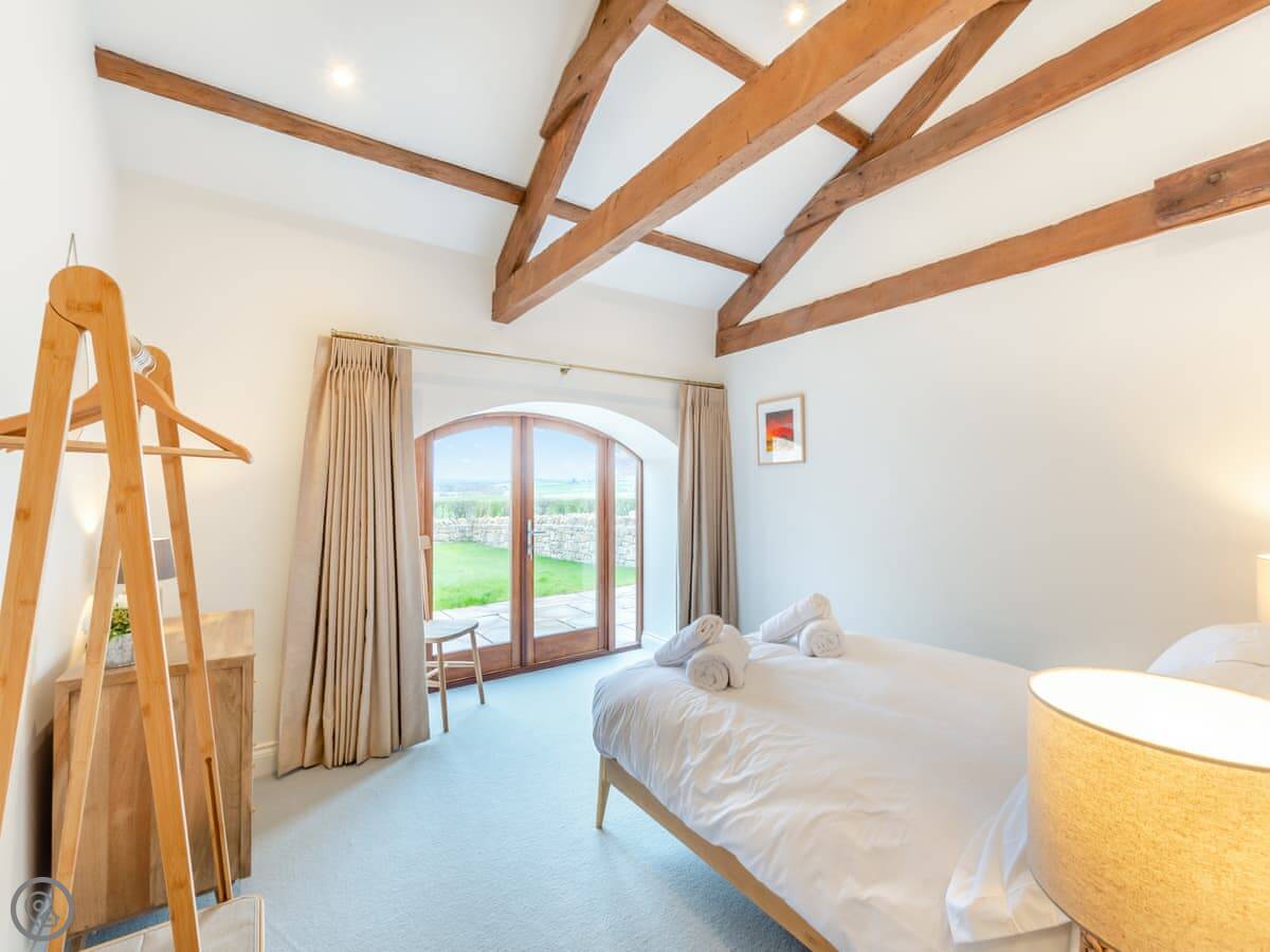 It sleeps nine people. Four bedrooms and three bathrooms, so that should stop any arguments. Two of the doubles are on the ground floor. They both look out at the hills. One of them has its own shower room. Upstairs, there’s another double with an en-suite shower room, and a triple bedroom. The main bathroom is upstairs too, with a bath and a shower. The place has a 4 Star rating, so it's comfortable and well fitted out. The ceilings are high with open beams. Be careful if you're tall. There’s a big dining table that's good for everyone to sit around.