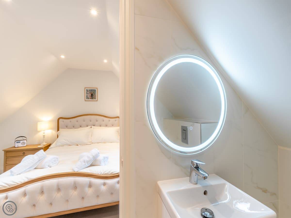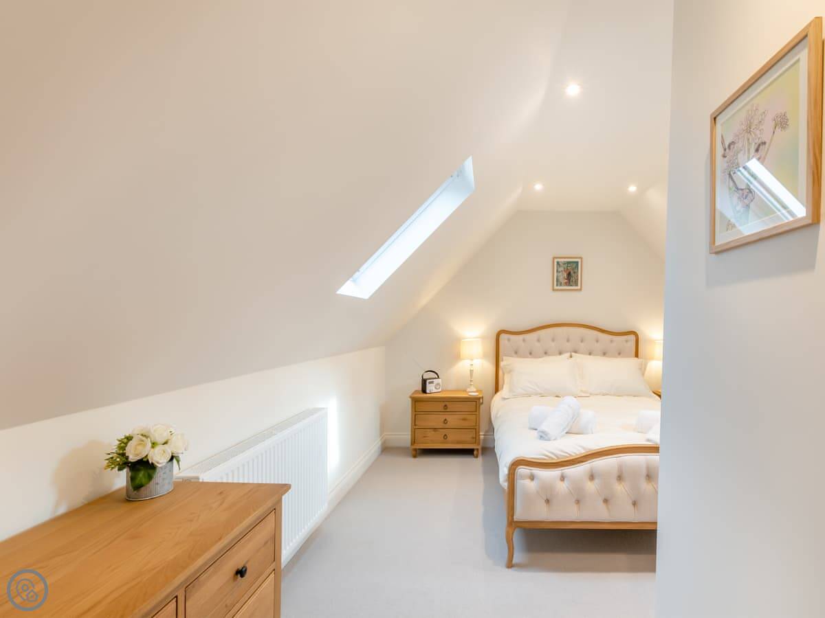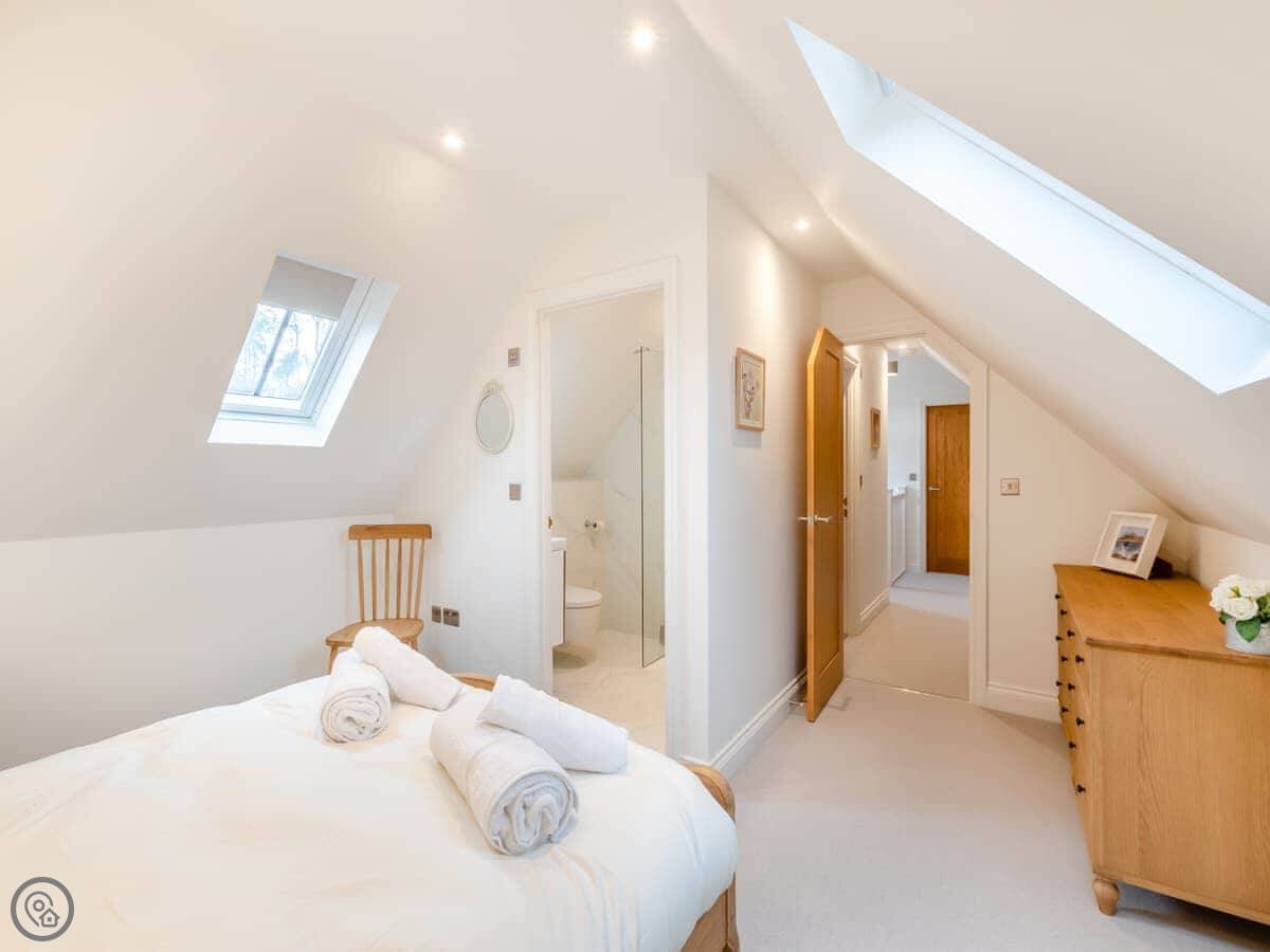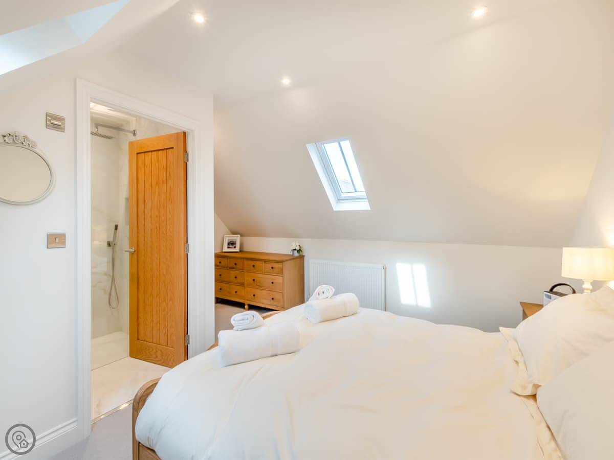 It sleeps nine people. Four bedrooms and three bathrooms, so that should stop any arguments. Two of the doubles are on the ground floor. They both look out at the hills. One of them has its own shower room. Upstairs, there’s another double with an en-suite shower room, and a triple bedroom. The main bathroom is upstairs too, with a bath and a shower. The place has a 4 Star rating, so it's comfortable and well fitted out. The ceilings are high with open beams. Be careful if you're tall. There’s a big dining table that's good for everyone to sit around.