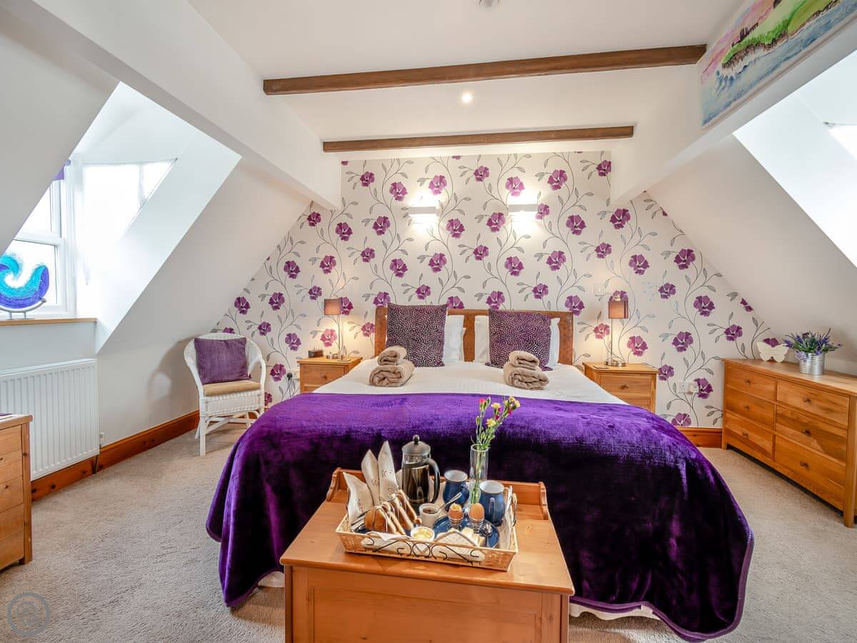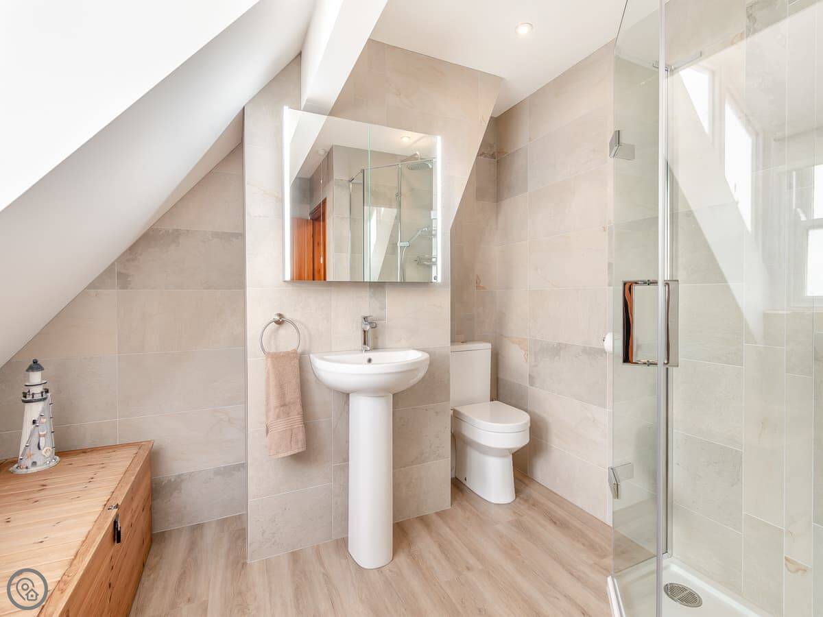 You come in into the kitchen, which is open to the dining area. The main living room is separate, with a gas fire. There's also a toilet on the ground floor. Upstairs, there's a second sitting room with a great view of the harbour and the sea. It's got a TV and an Xbox. On that floor there's a kingsize bedroom with sea views and a twin room, plus a family bathroom with a bath and a separate shower. Up another floor is the third bedroom, which has a kingsize bed, a single bed, and really good views over the town.