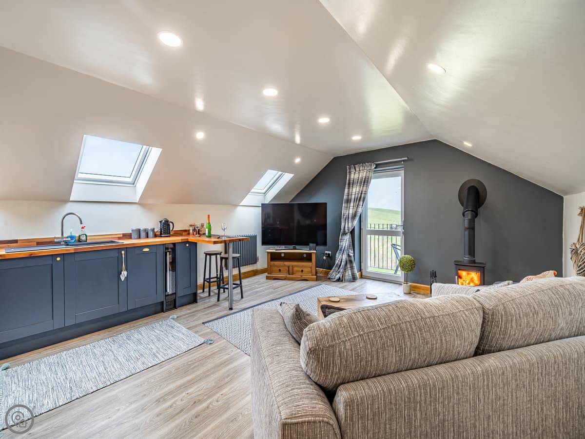 Upon arrival, you will discover a gated entrance, private parking awaits directly outside the property for up to two cars. Step into this stunning holiday home with vaulted ceilings and Vexlus windows throughout, oozing luxury from top to bottom. The owners have refurbished the property with comfort and style in mind. Rita’s Roost provides accommodation for up to four guests, with one double bedroom and additional sleeping arrangements on a double sofa bed in the living room. Wander upstairs to be greeted by a cosy reading room with a chair and drawers, the perfect place to relax and unwind in after a day exploring the local area. Stroll through to find an open plan design kitchen and dining area where you will find a well-equipped kitchen/dining room for rustling up your best dishes ready to savour at the breakfast bar or on the balcony whilst absorbing the stunning views. Not fancy cooking? Then venture out to find some local restaurants and eateries? After dinner, make your way through to the living room and curl up on the sumptuous sofas in front of the wood burner as your favourite show or movie plays out on the Smart TV. A large family bathroom can be found on the same floor benefitting from a bath with a shower over, and a pedestal wash hand basin. Relax on the balcony and absorb the amazing views. When sleep calls, you can find your double bed to sink down and rest your head after a long day exploring the local area. Treat your loved ones to an unforgettable and luxurious stay at Rita’s Roost.