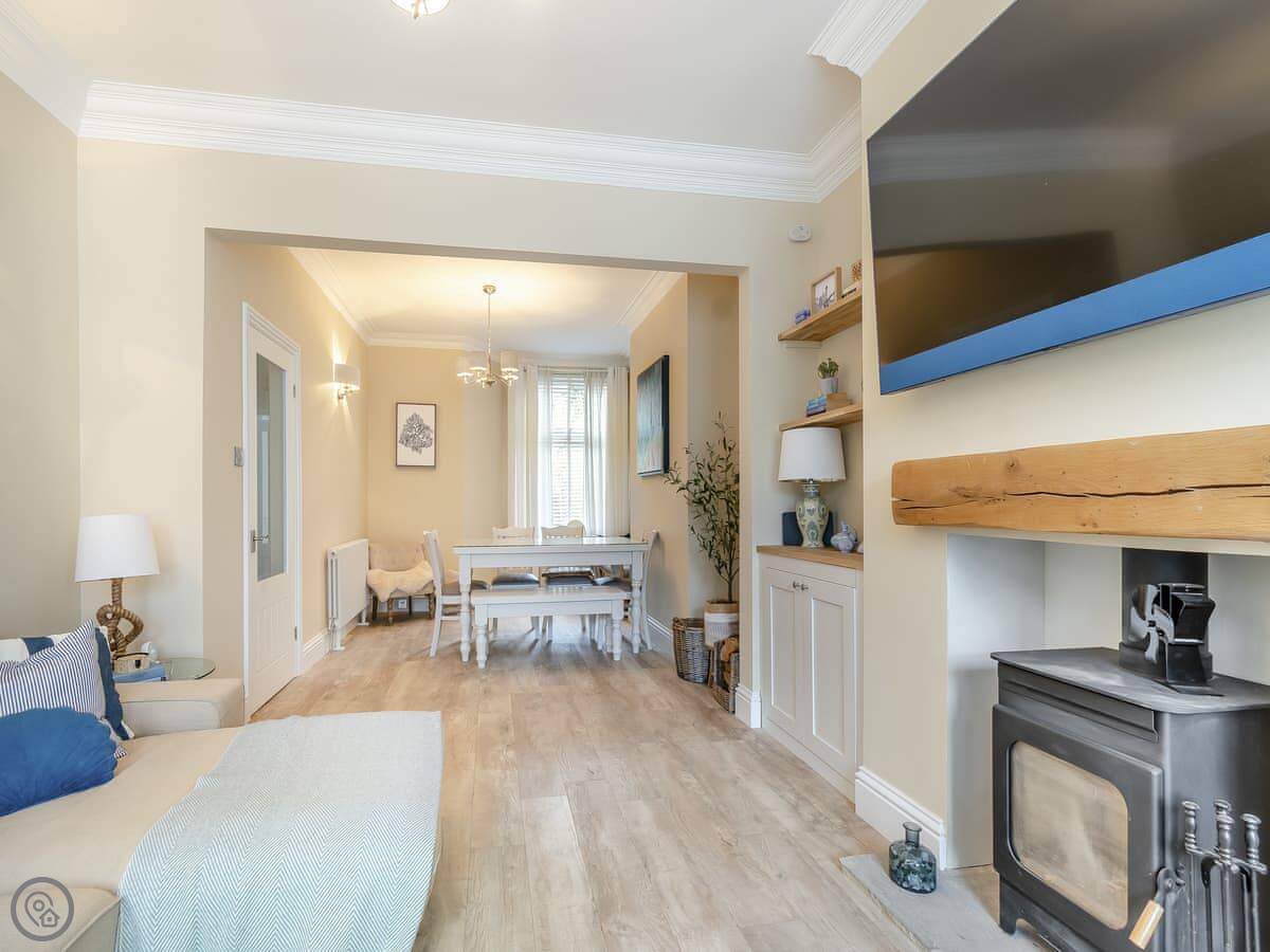 On arrival, steps lead you up through the tiered garden to the front door. Stepping inside, the hallway leads you to the open plan living and dining area at the front of the property, and the kitchen at the rear. The open plan living area is a great size for entertaining in an evening, you can play board games at the large dining table or relax on the large corner sofa in front of the glow from the wood burner, as you have a movie night together. The kitchen is also spacious and enjoyable, with everything needed to create all of your favourite family meals. A back door from the kitchen leads you into the back garden, with steps leading up to the raised patio area, with outdoor seating. Up on the first floor, you have three wonderful bedrooms to choose from: the master kinsize bedroom has a dressing table in the bay window as well as an en-suite shower; a double bedroom; and a triple bunk room which has a double bed on the bottom and single bed on top. The bunk room also has a full-sized cot in the bay window, perfect for infants. Each room has a wardrobe for all of your belongings. The house bathroom is modern and inviting with a walk-in shower. The house can accommodate up to seven guests in total, perfect for families or even up to three couples travelling together. Your furry friend is welcome to join you, Scarborough is a fabulous destination for dogs, with many scenic walking trails, plus many of the bars and cafes in this area welcome dogs.