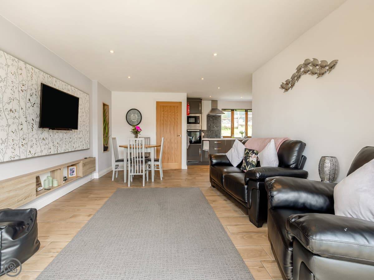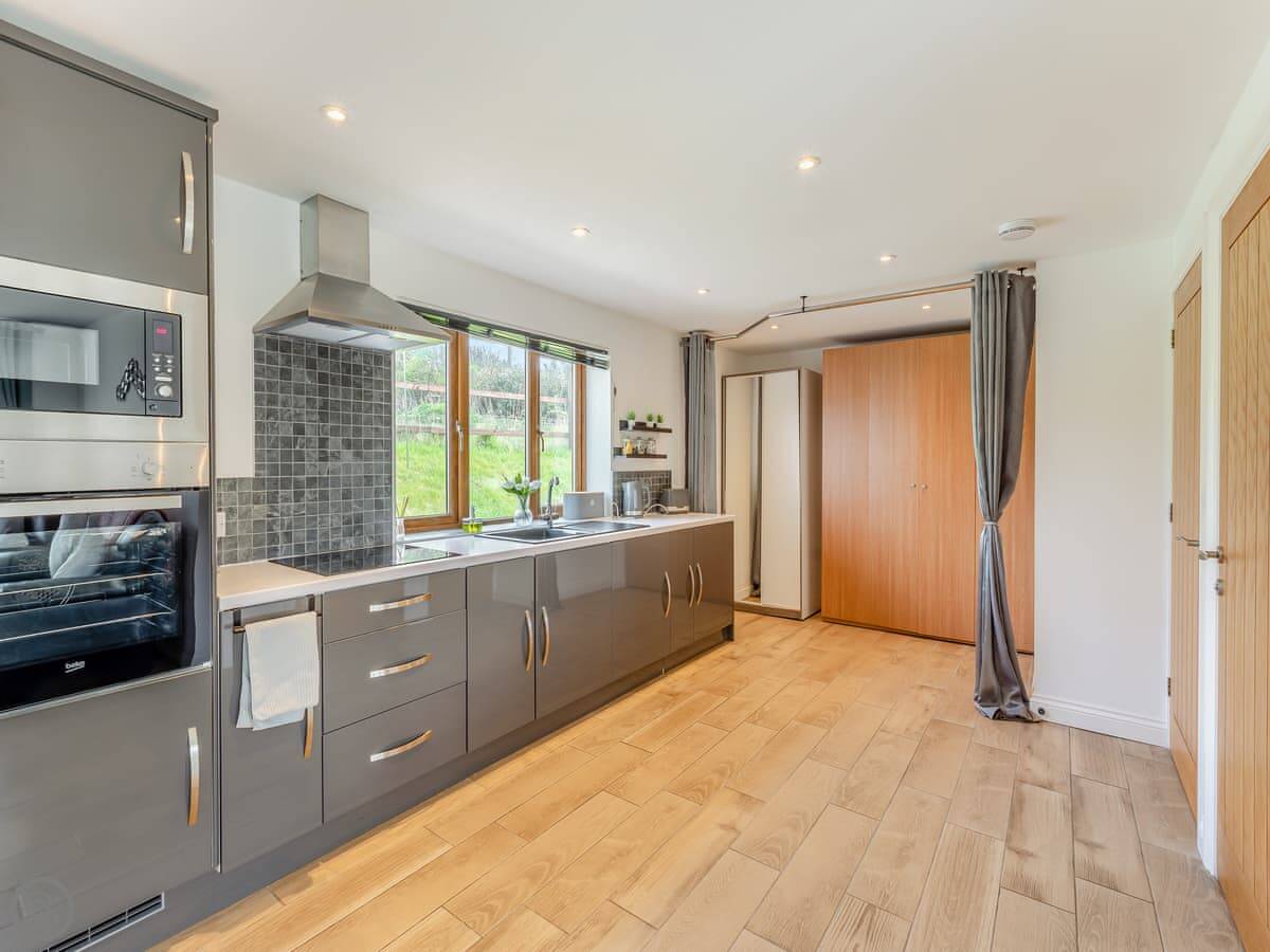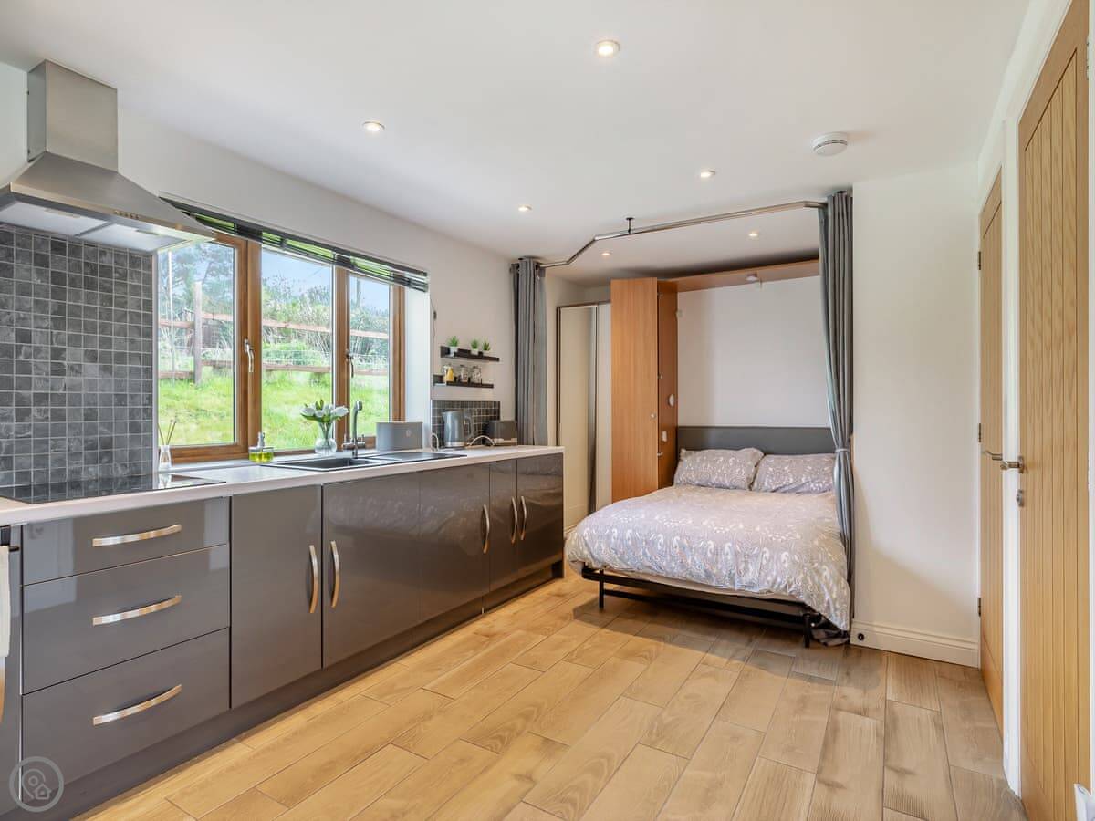 Both properties are identical layouts inside, enjoying underfloor heating throughout and with a spacious open plan living, kitchen and dining areas. The gorgeous kitchens are very well equipped with everything you will need during your stay, including a handy washer/dryer. The living room has comfy sofas, Smart TV to catch up on your latest box set and large French doors leading to your private enclosed garden which has a lovely patio area and artificial grass allowing children and your four legged friends to enjoy the garden at any time of year. In Honey Bee you will find a kingsize bed while Bumble Bee has a double bed, both have an en-suite shower rooms with walk in showers, the en-suite is a ‘Jack and Jill’ bathroom which allows access from both the bedroom and main living area. A ‘Murphy’ pull down double bed is available in the main living area with curtain to separate, allowing four guests to comfortably enjoy these wonderful retreats in the country. Opposite the parking area you will find the owner’s 4-acre field for walking the dogs and enjoying the views.