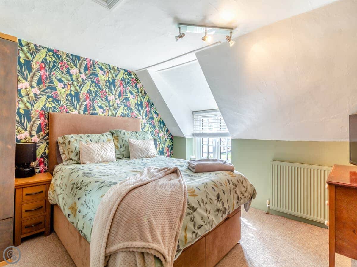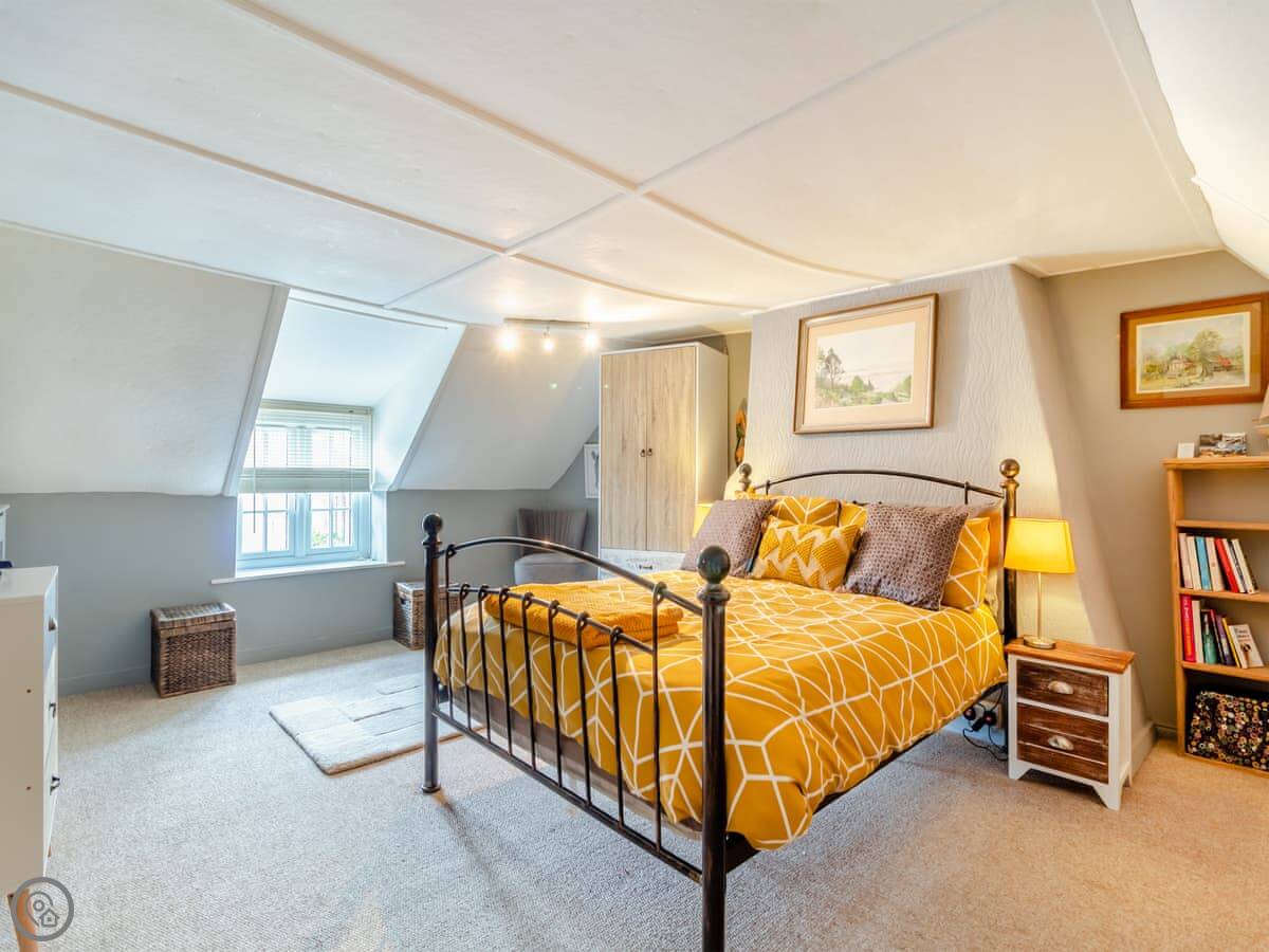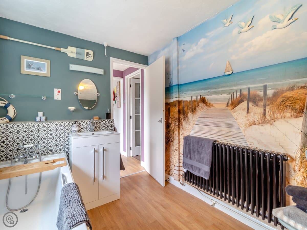 It sleeps four people. Two bedrooms, one bathroom. The bathroom is downstairs and has both a bath and a separate shower. The bedrooms are upstairs. The stairs are the original ones. They're quite steep and a bit narrow.