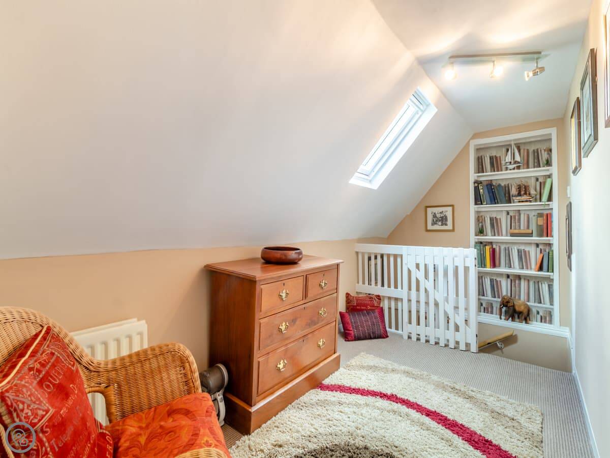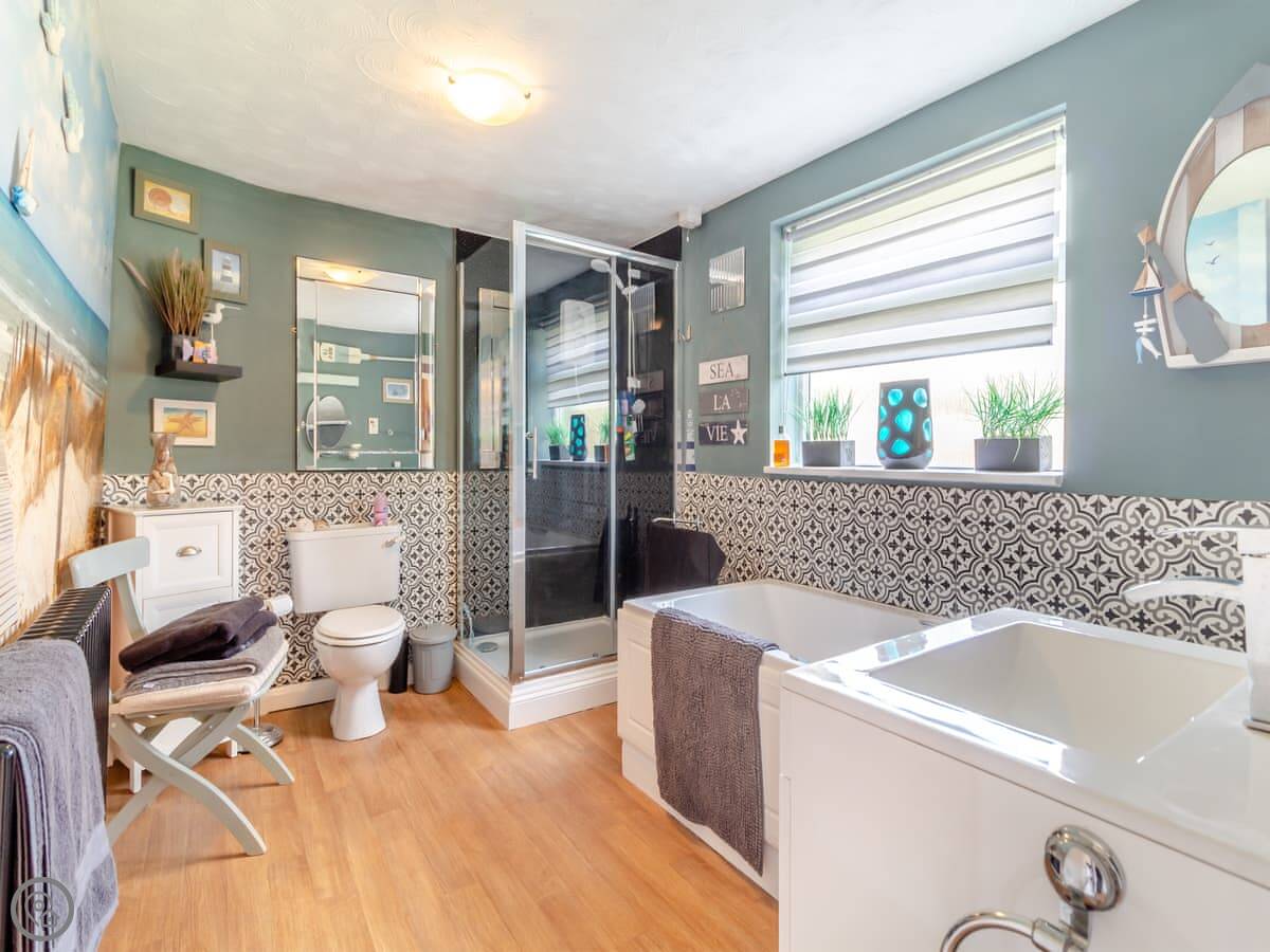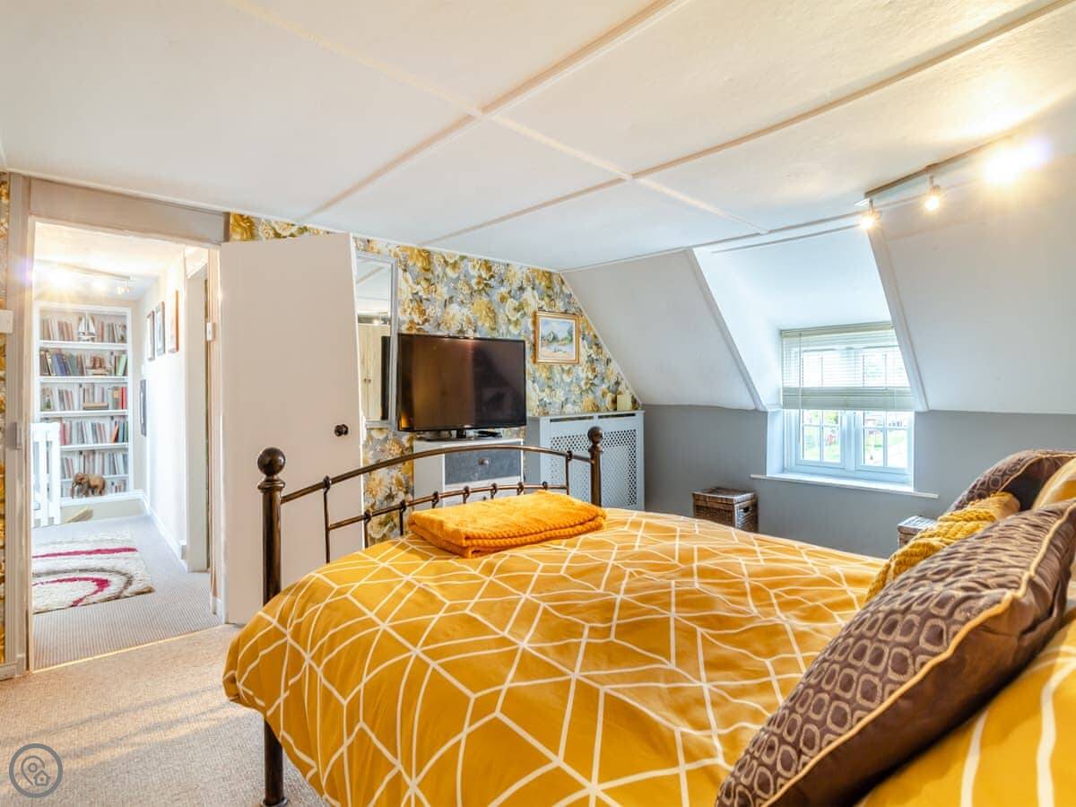 It sleeps four people. Two bedrooms, one bathroom. The bathroom is downstairs and has both a bath and a separate shower. The bedrooms are upstairs. The stairs are the original ones. They're quite steep and a bit narrow.
