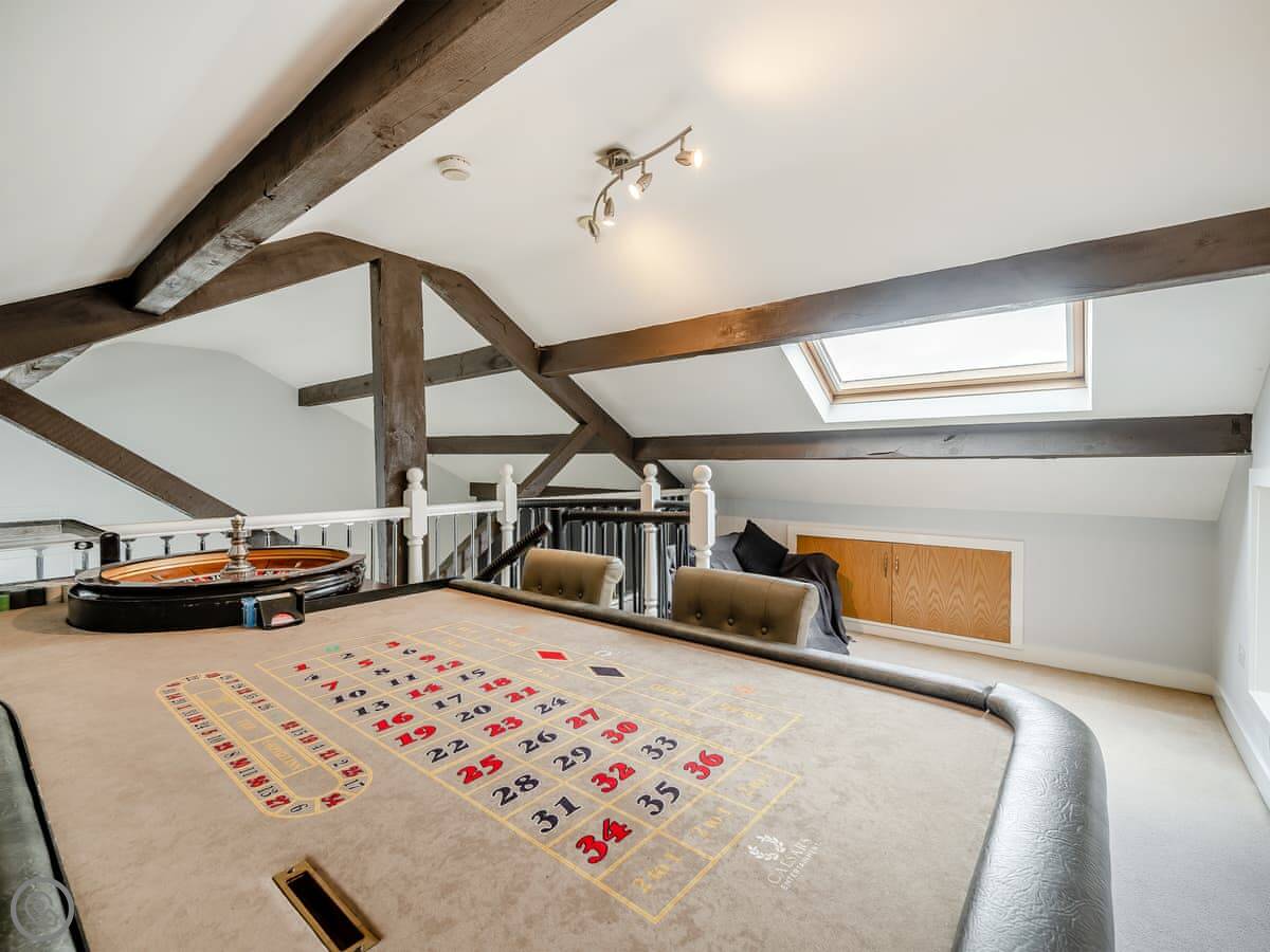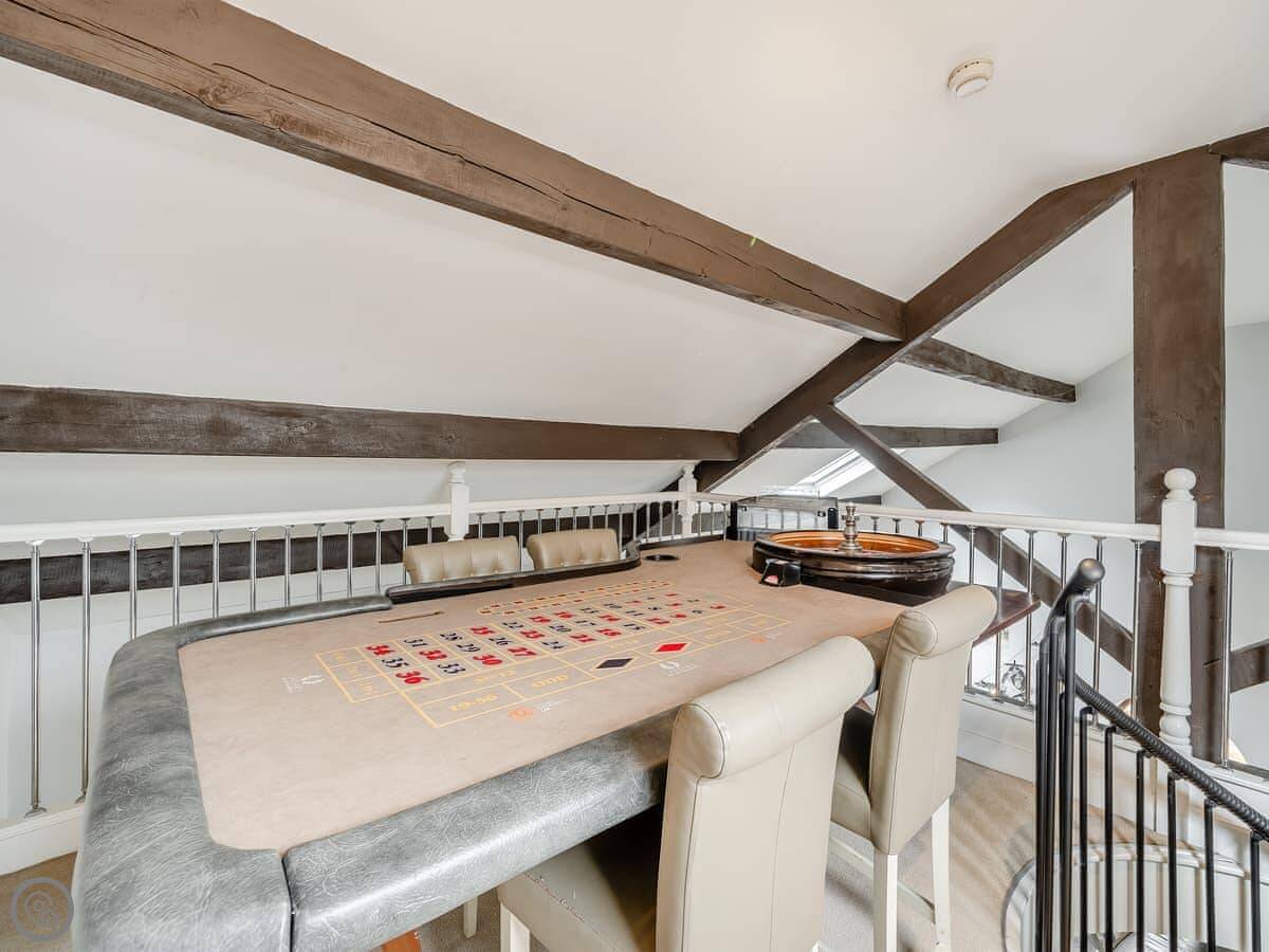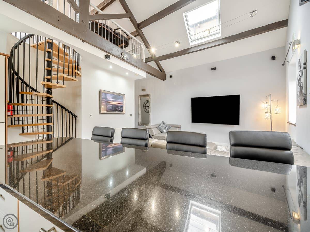 The layout is open-plan kitchen and living room. The main quirk is the spiral staircase in the living room. It goes up to a mezzanine level where there's a casino table. It's just there if you fancy a game.