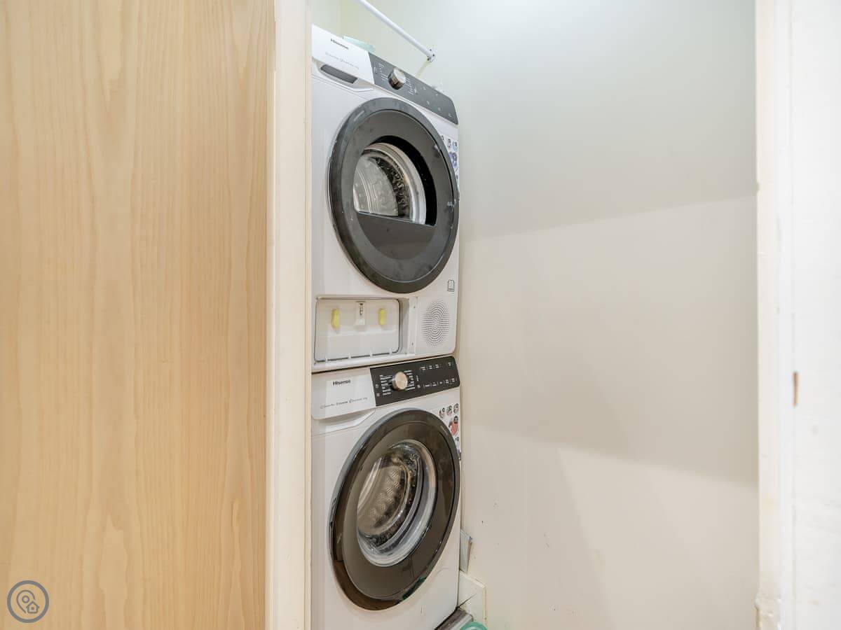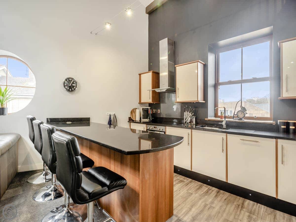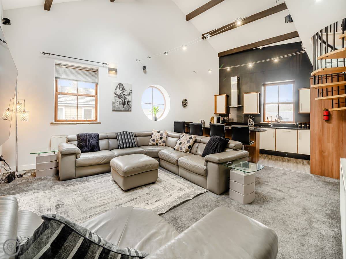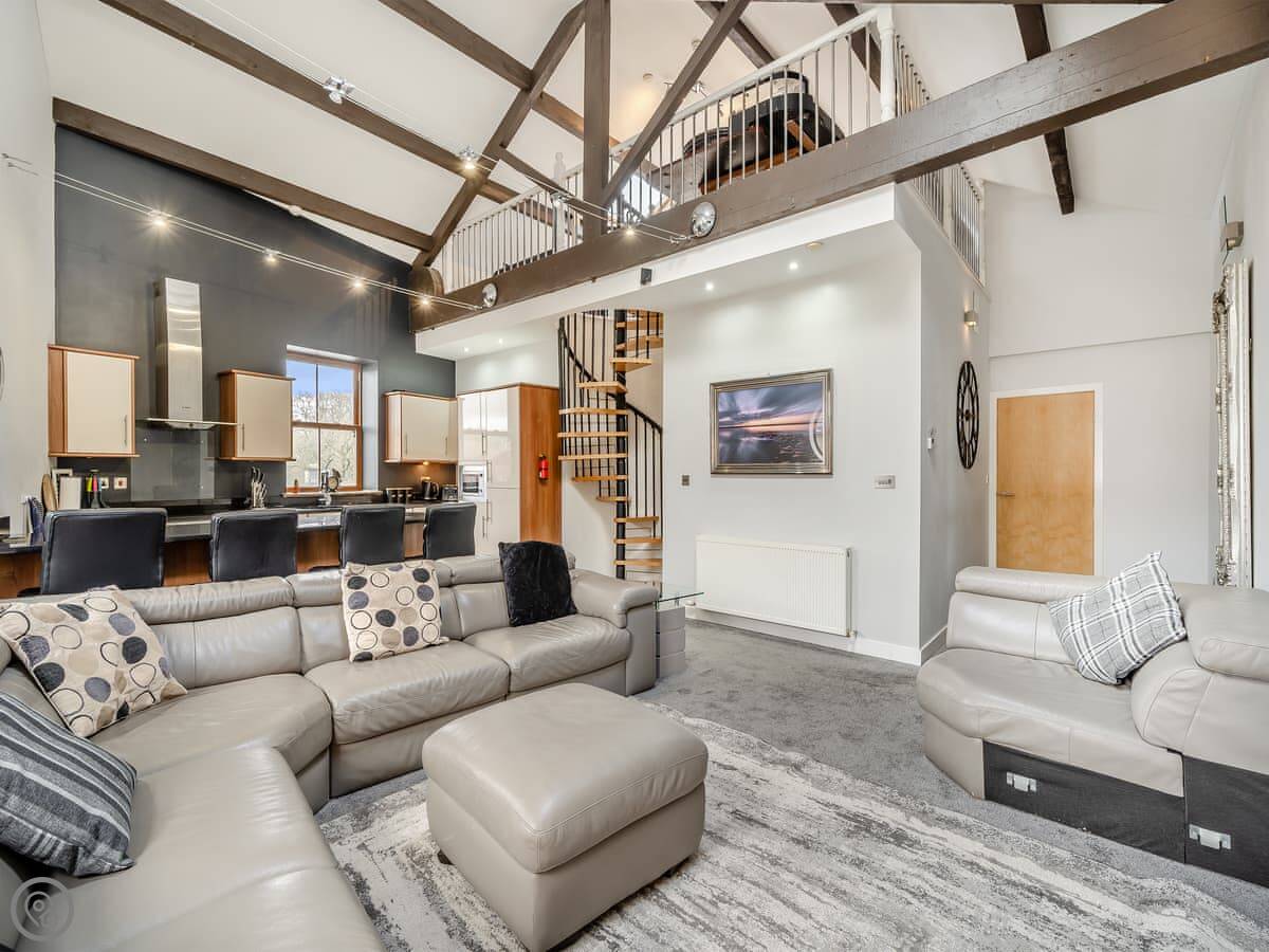 The layout is open-plan kitchen and living room. The main quirk is the spiral staircase in the living room. It goes up to a mezzanine level where there's a casino table. It's just there if you fancy a game.