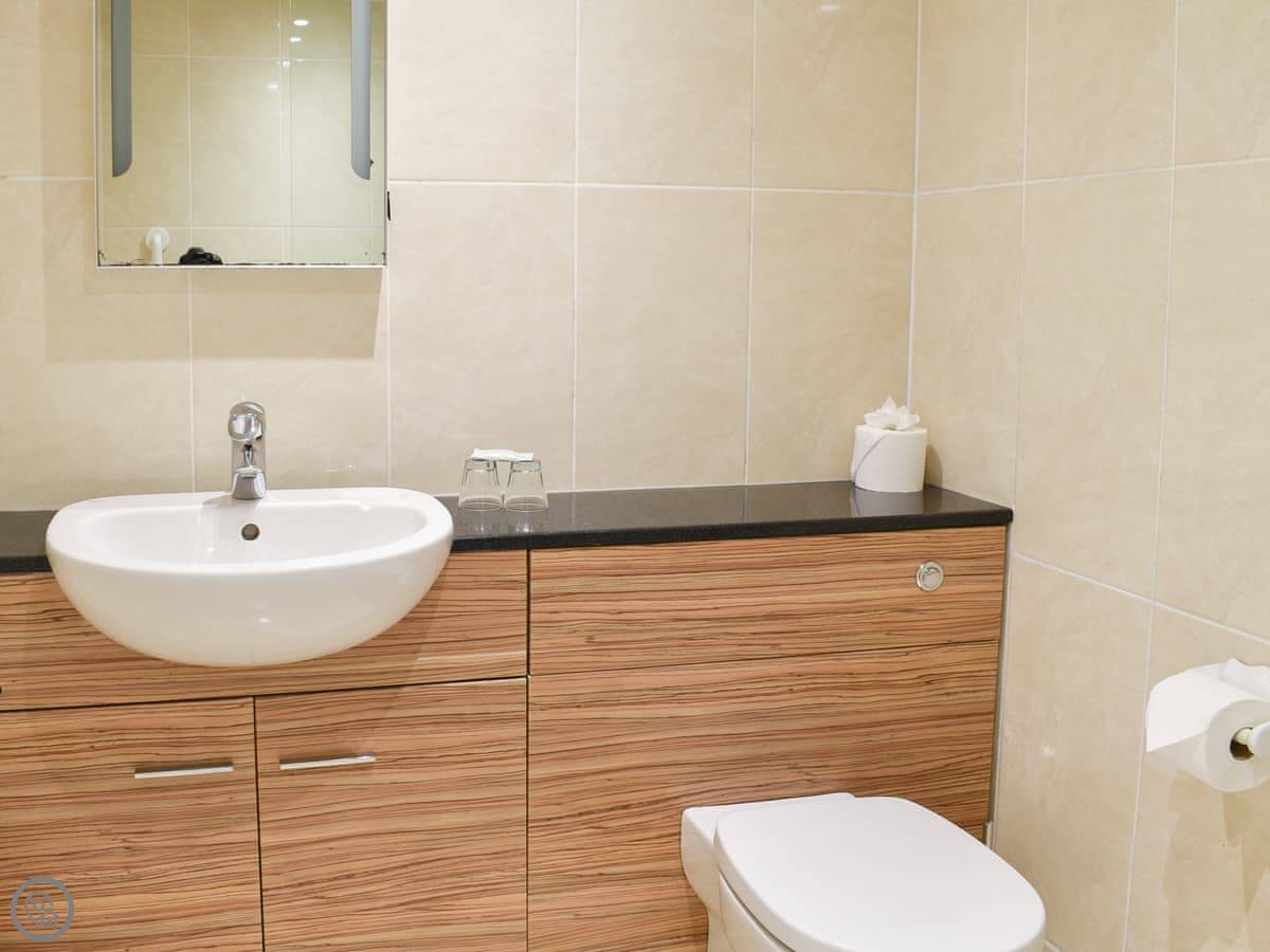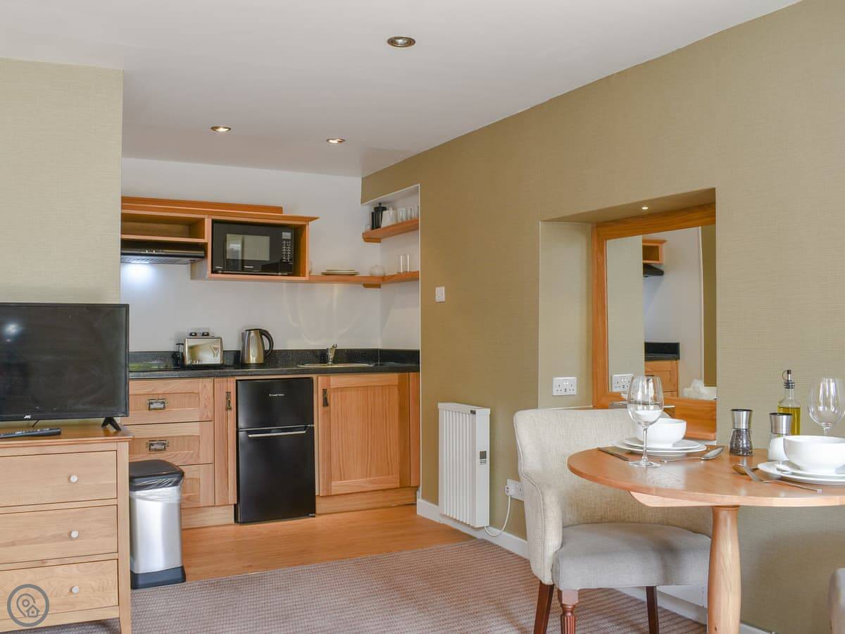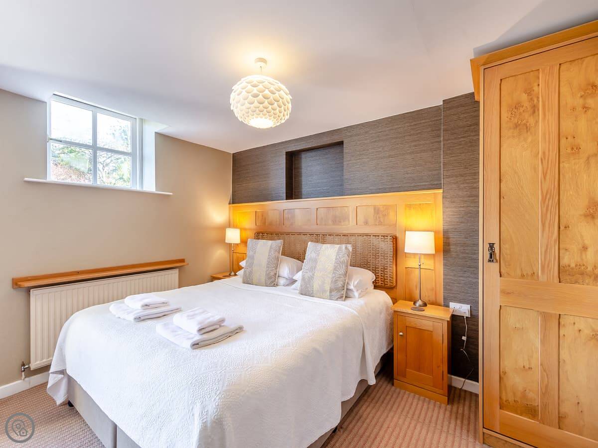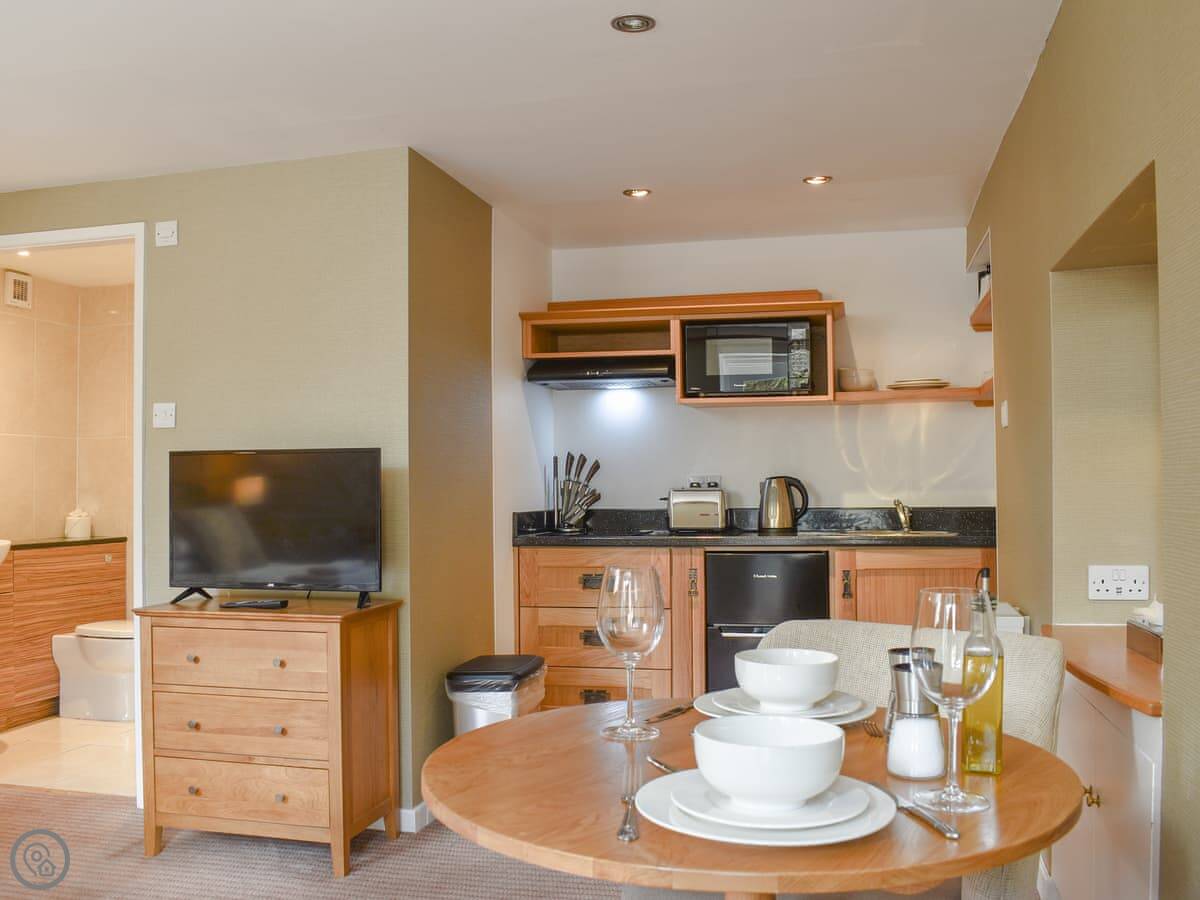 Juniper is on the Yewfield Estate, up on Hawkshead Hill. It's a one-bedroom apartment on the ground floor, sleeps two. It has a 4 Star rating. It's a single open plan room, so the bed is in the main space. It's a super kingsize bed, and you can see the TV from it.