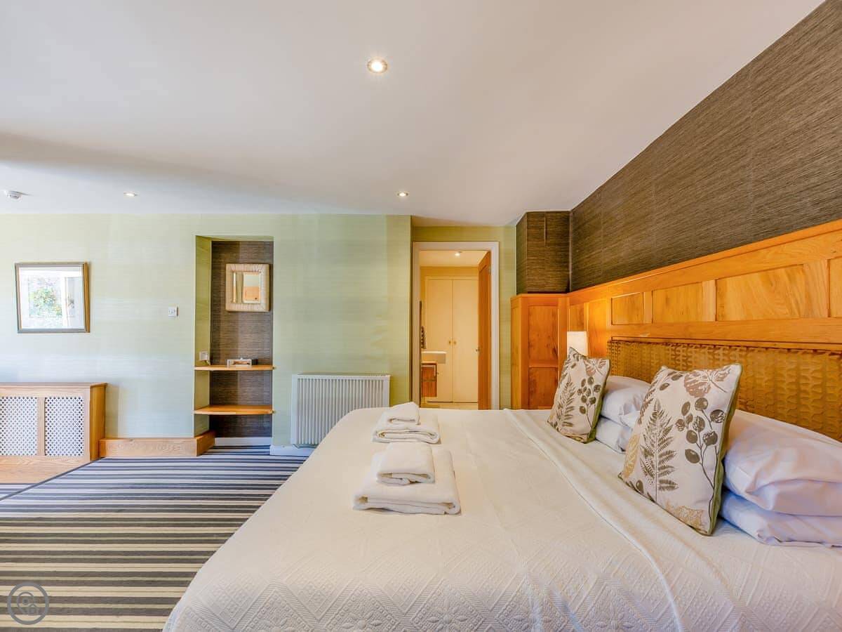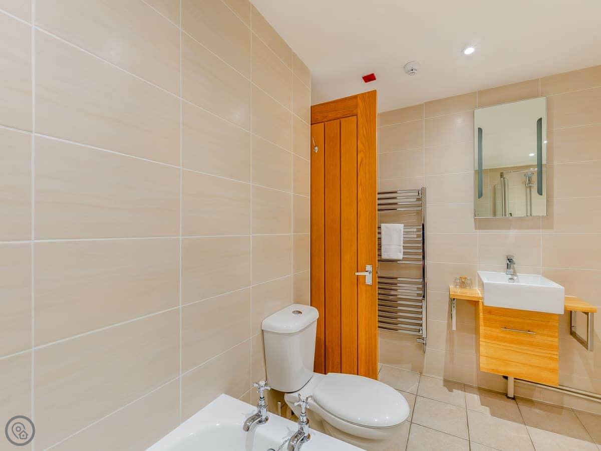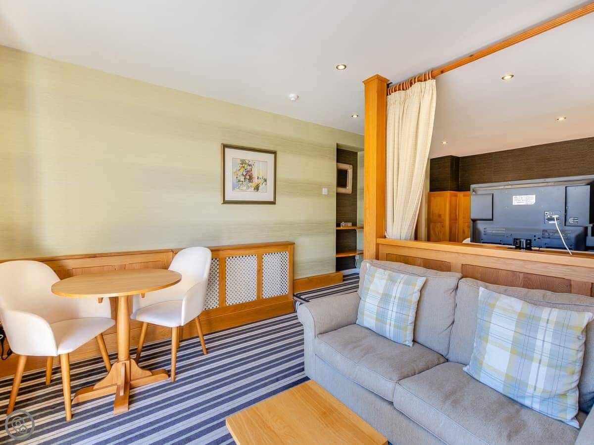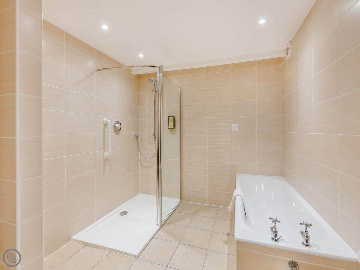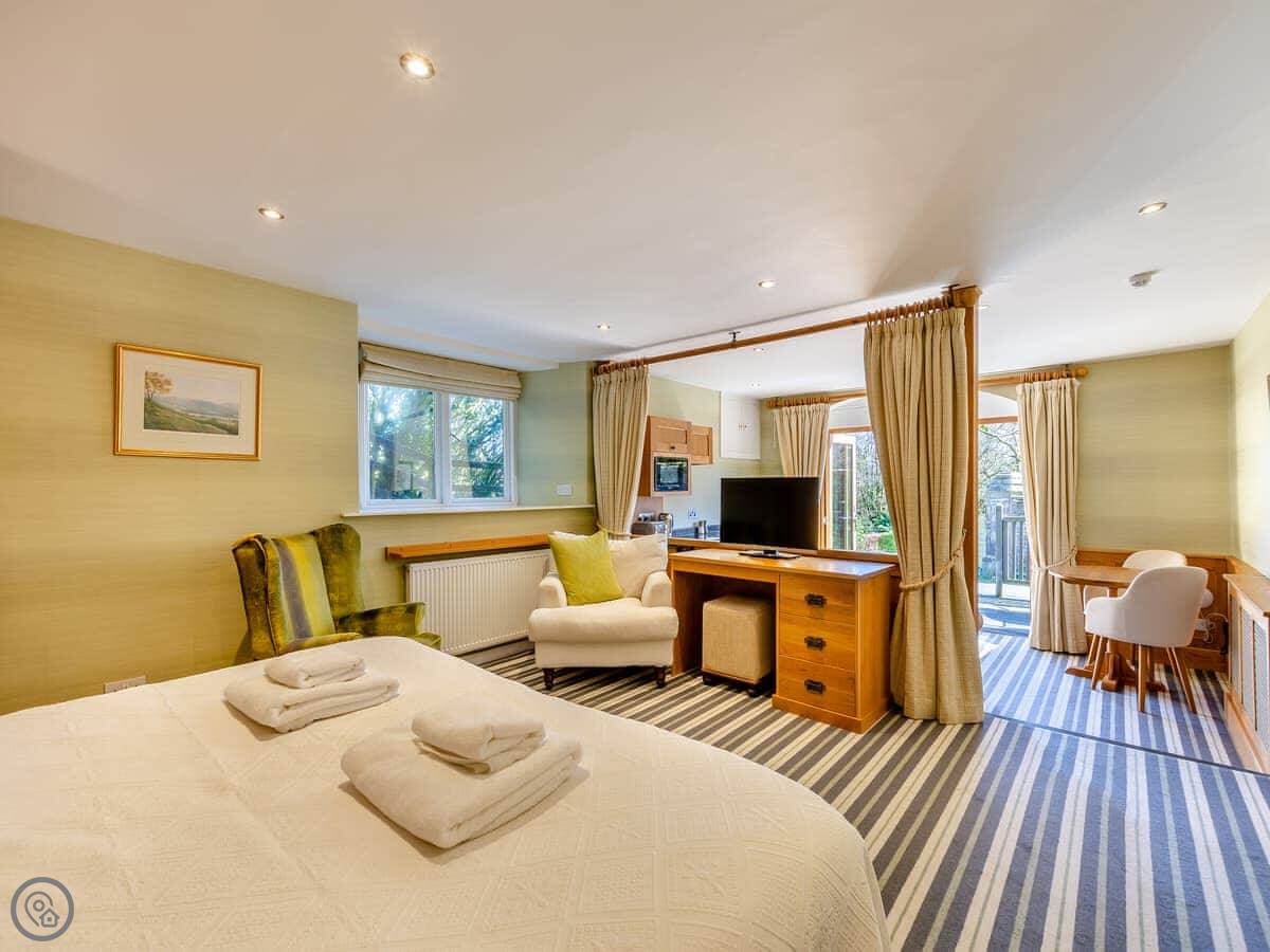 It's a space for two people. One bedroom, one bathroom. There's a super kingsize bed. The main room is open plan, so the living, dining, and sleeping areas are all together. The bathroom has both a bath and a walk-in shower.