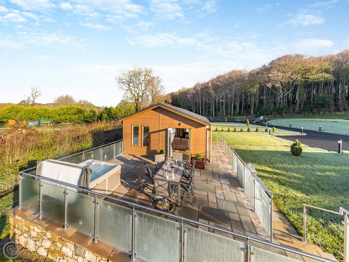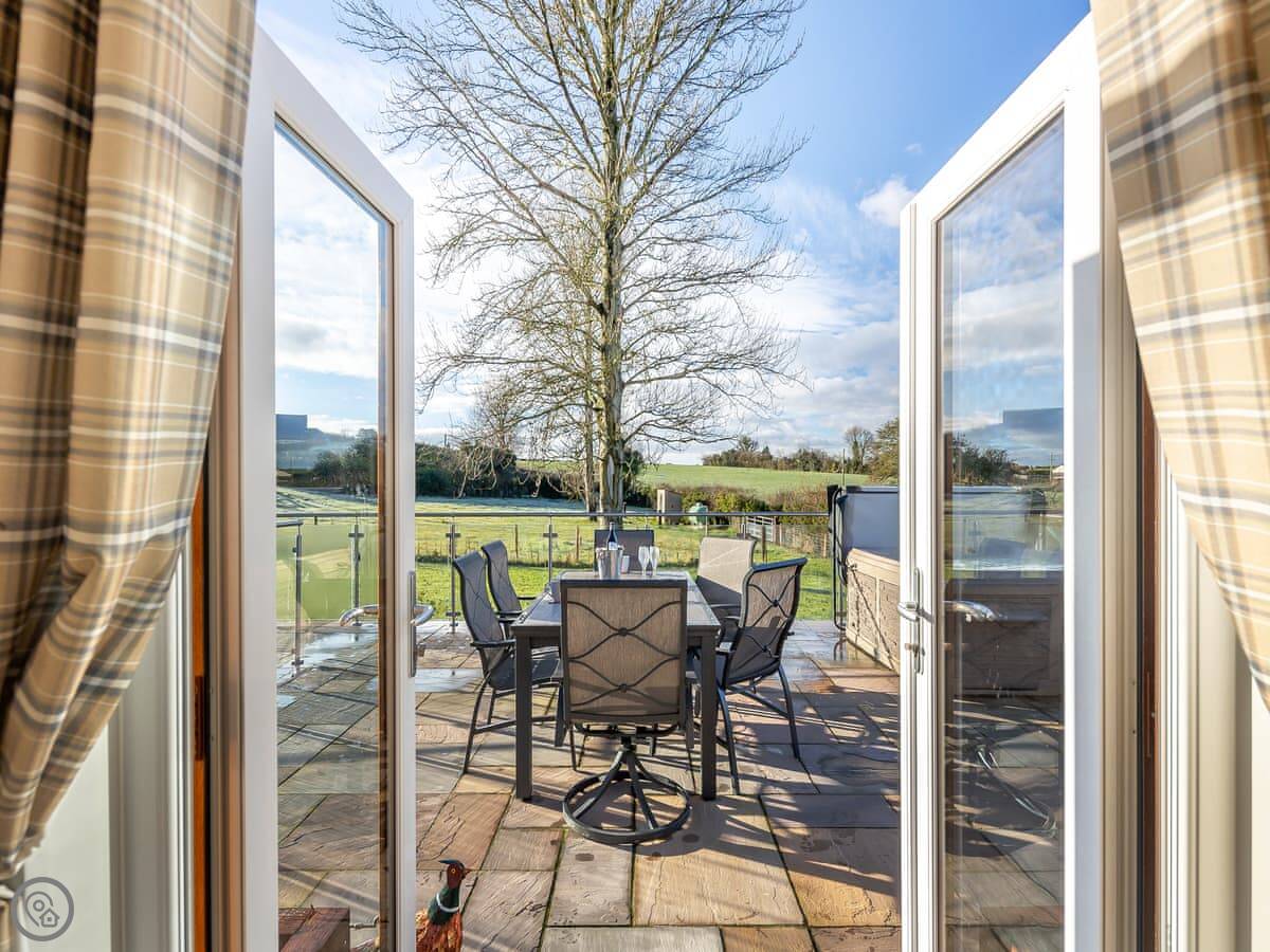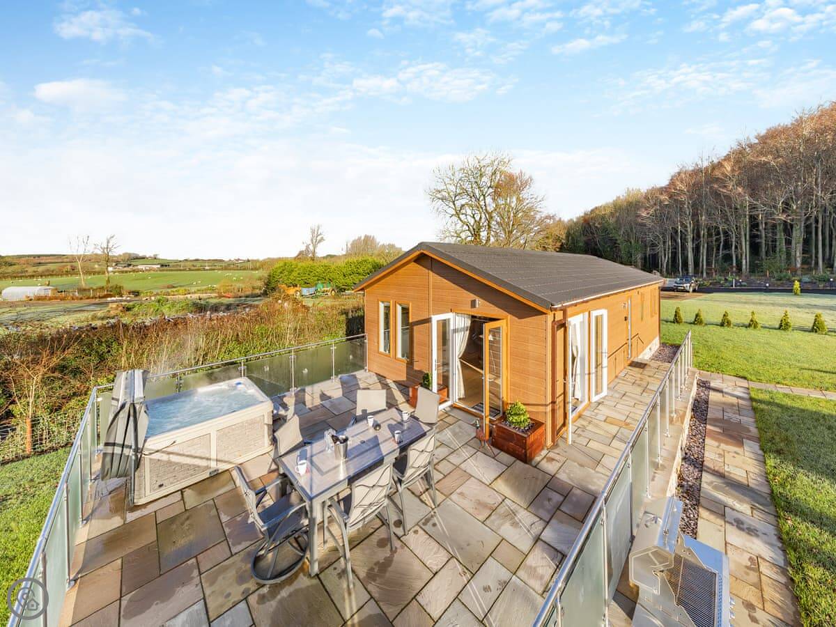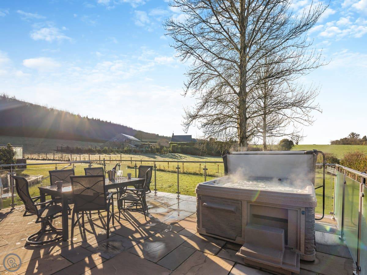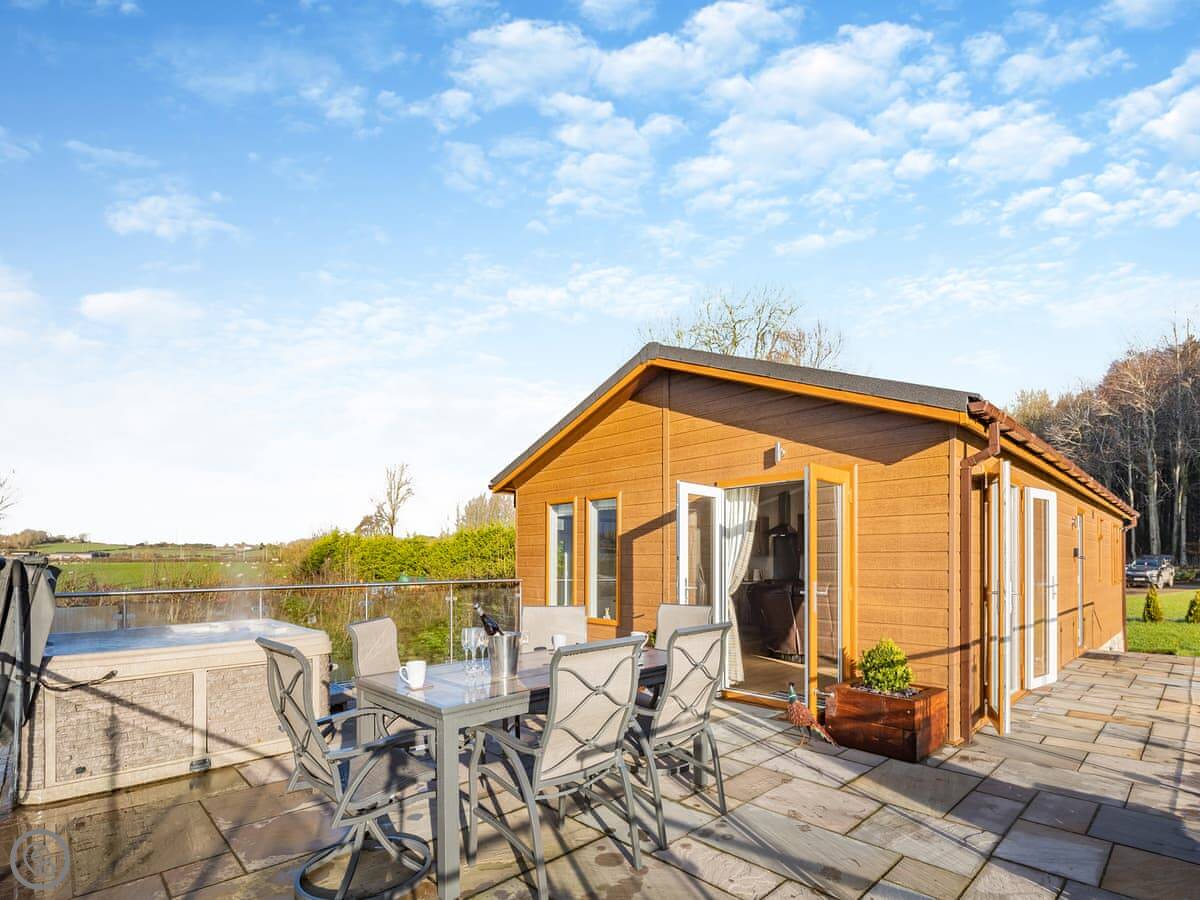 The setup is open plan. Patio doors open onto a big deck with a hot tub. You get garden furniture. The views are over fields. Inside, there's a kitchen that's got the usual things, a dining area, and a living space with a TV.