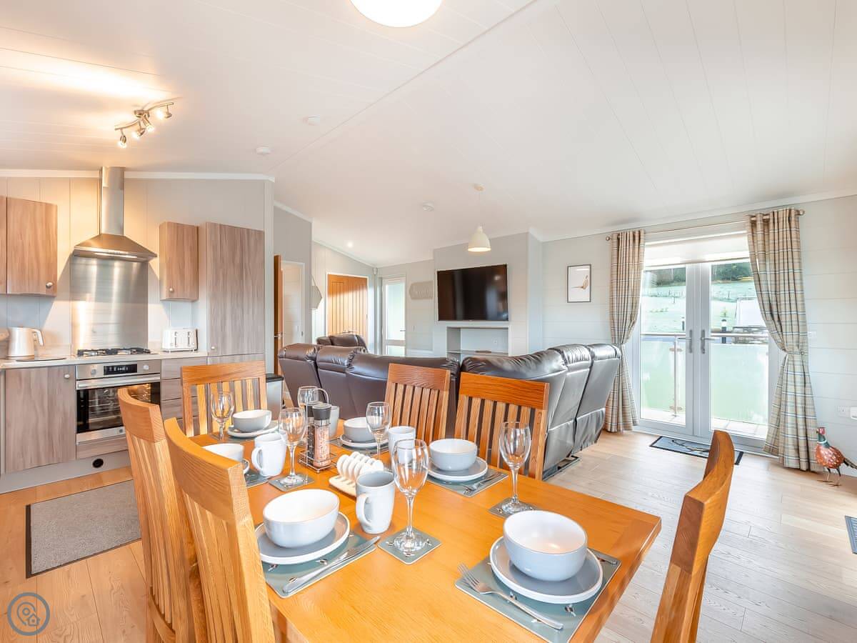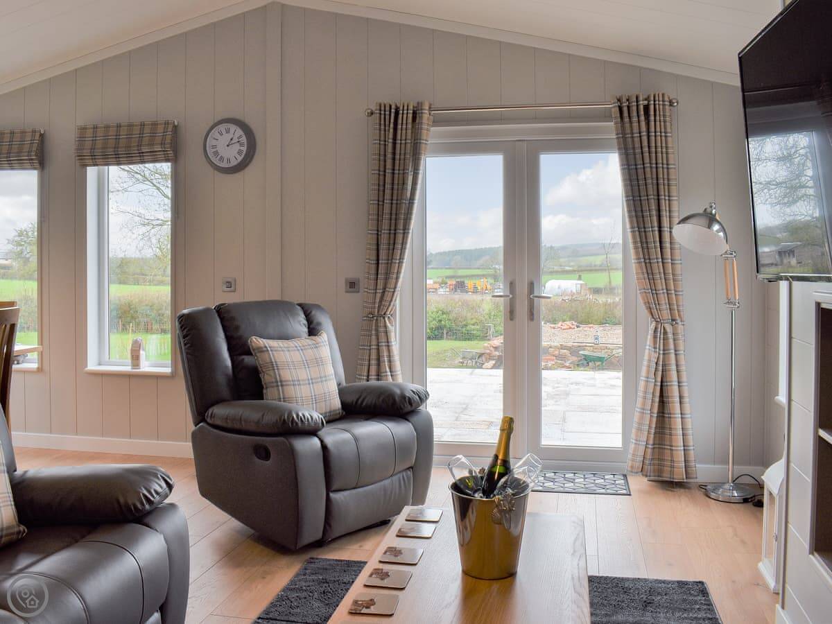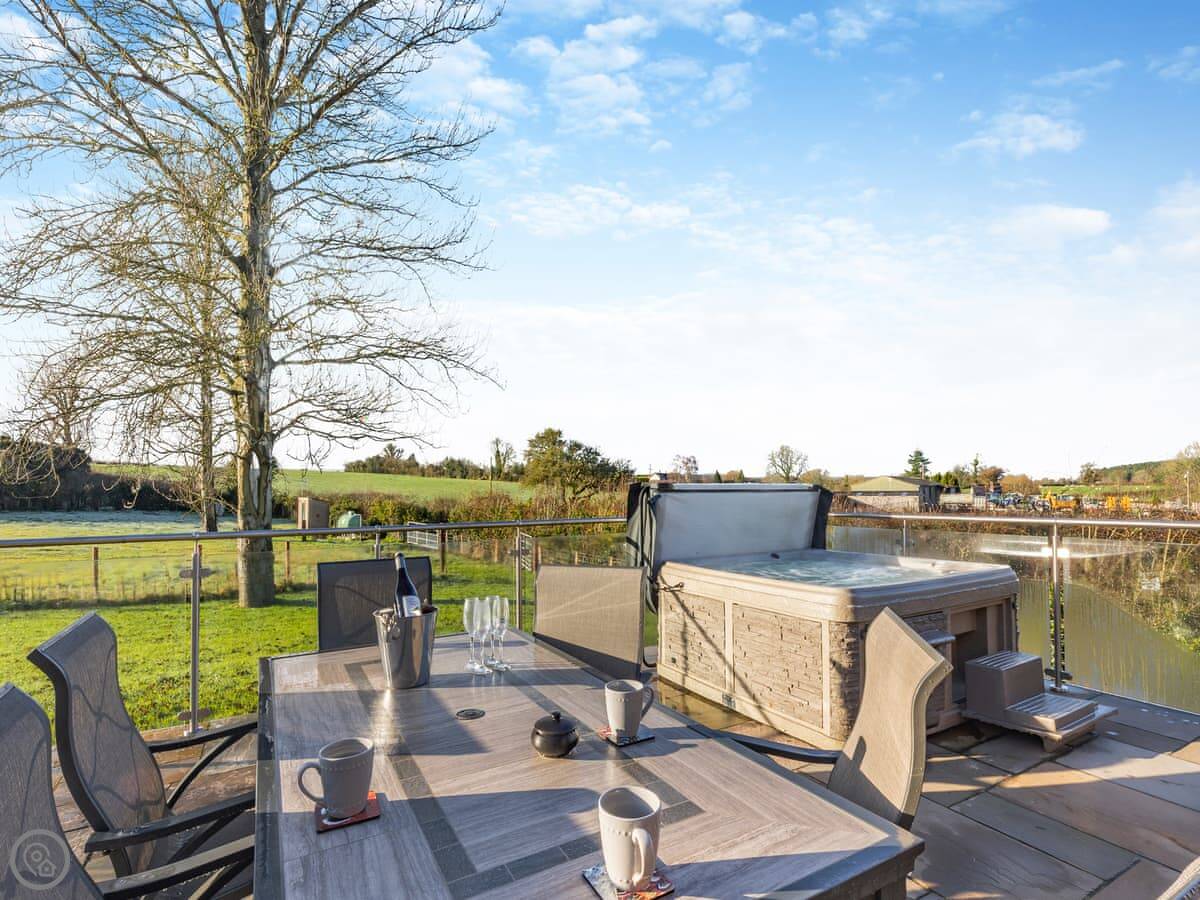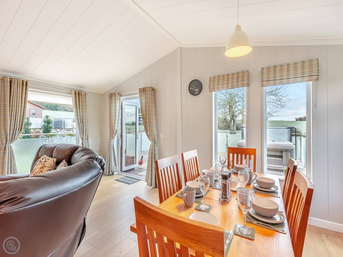 The setup is open plan. Patio doors open onto a big deck with a hot tub. You get garden furniture. The views are over fields. Inside, there's a kitchen that's got the usual things, a dining area, and a living space with a TV.