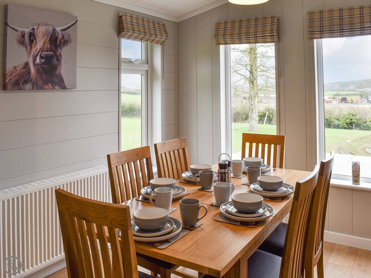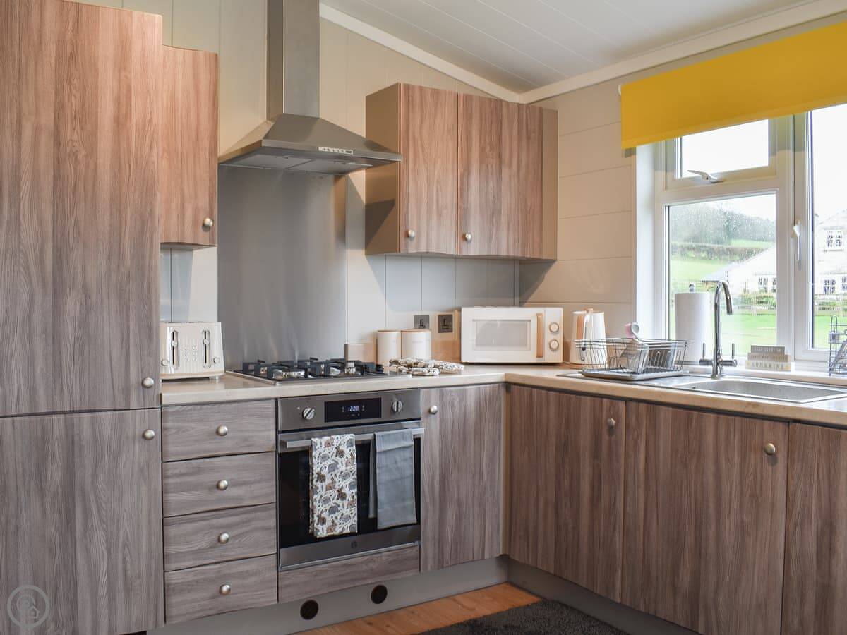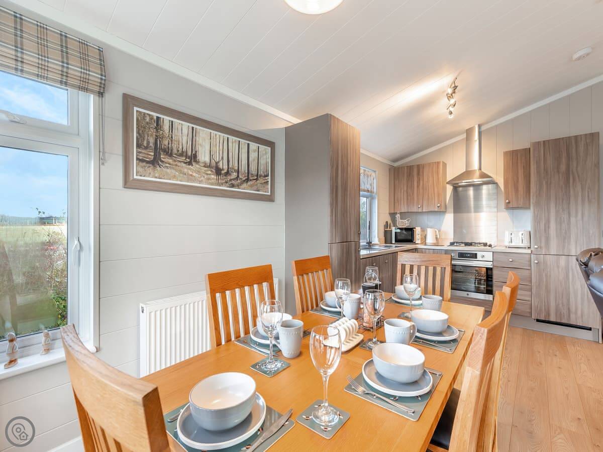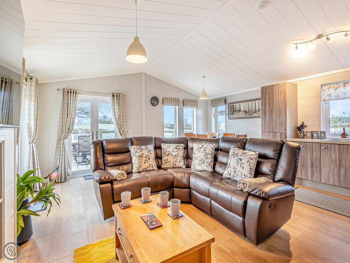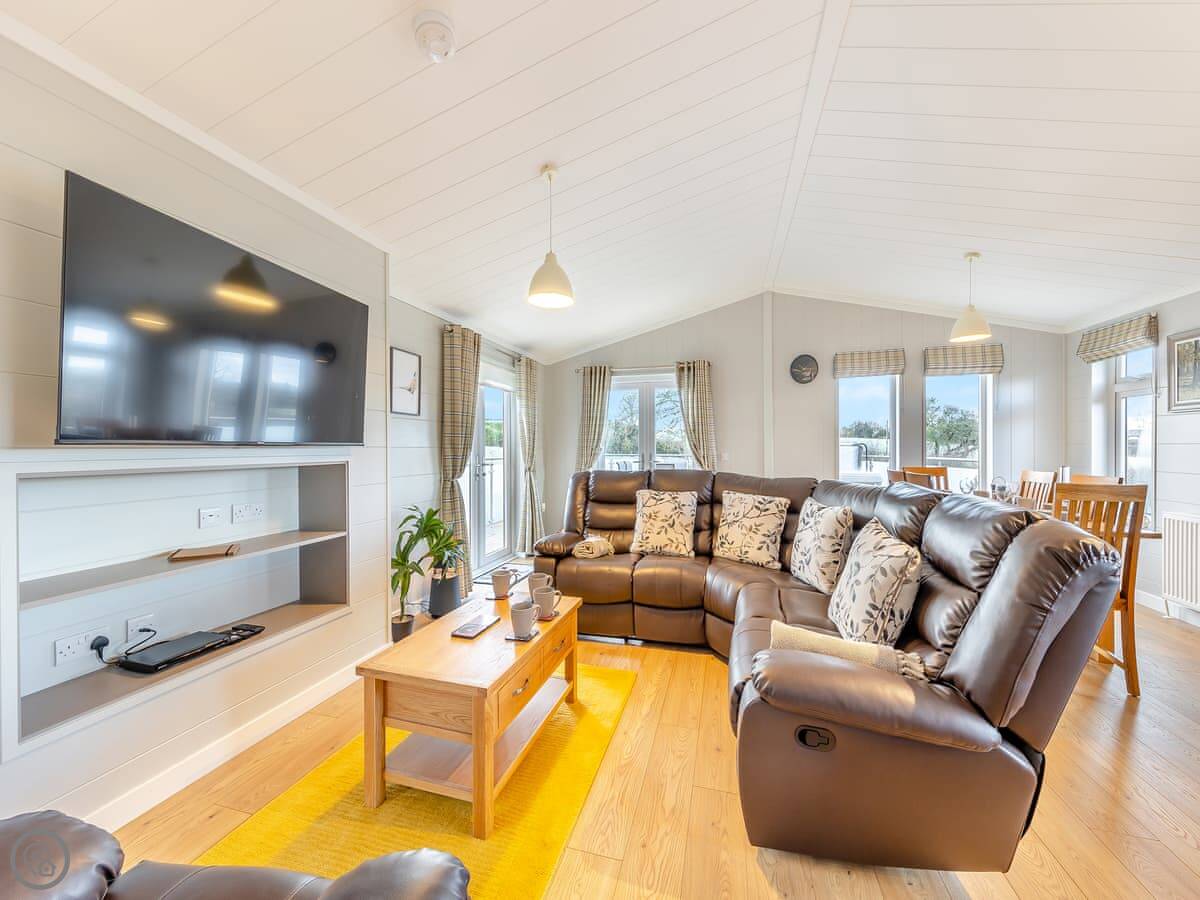 The setup is open plan. Patio doors open onto a big deck with a hot tub. You get garden furniture. The views are over fields. Inside, there's a kitchen that's got the usual things, a dining area, and a living space with a TV.