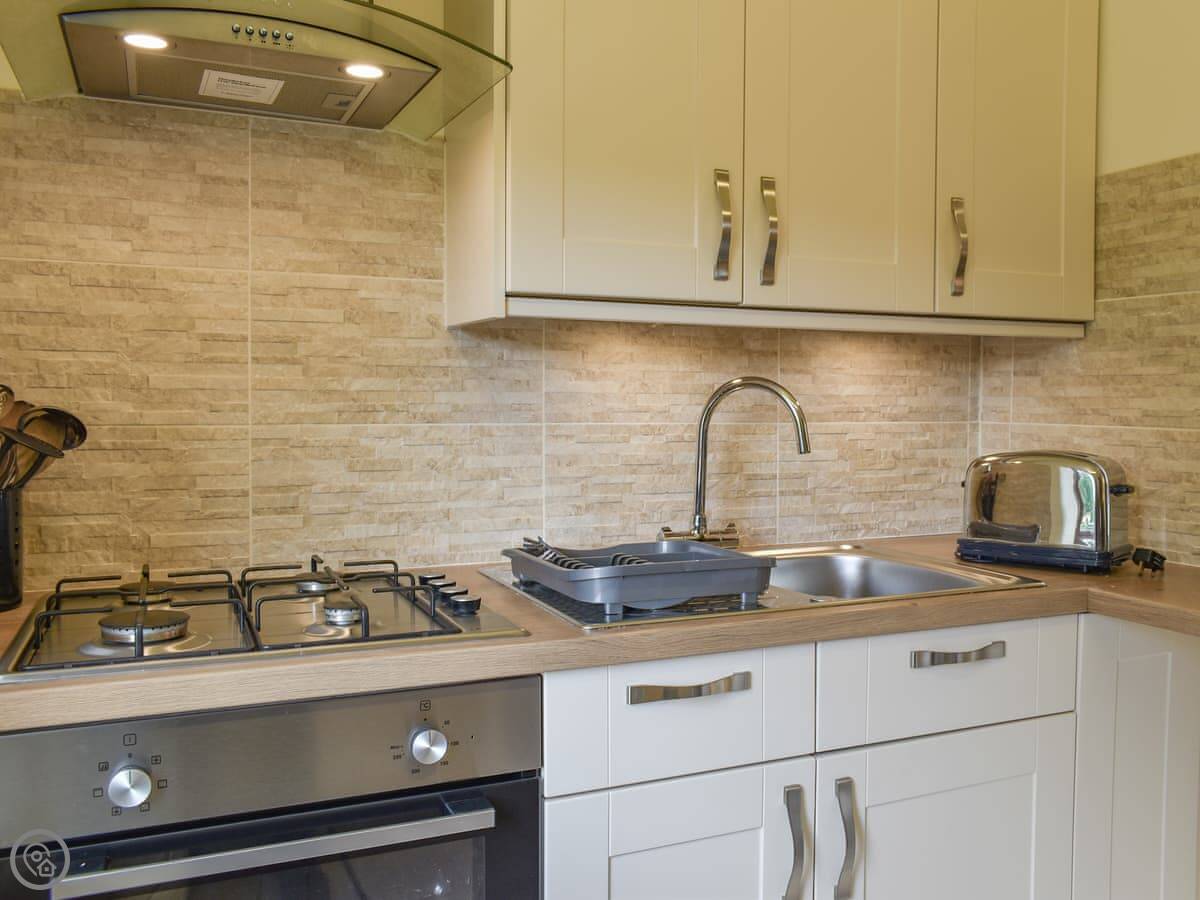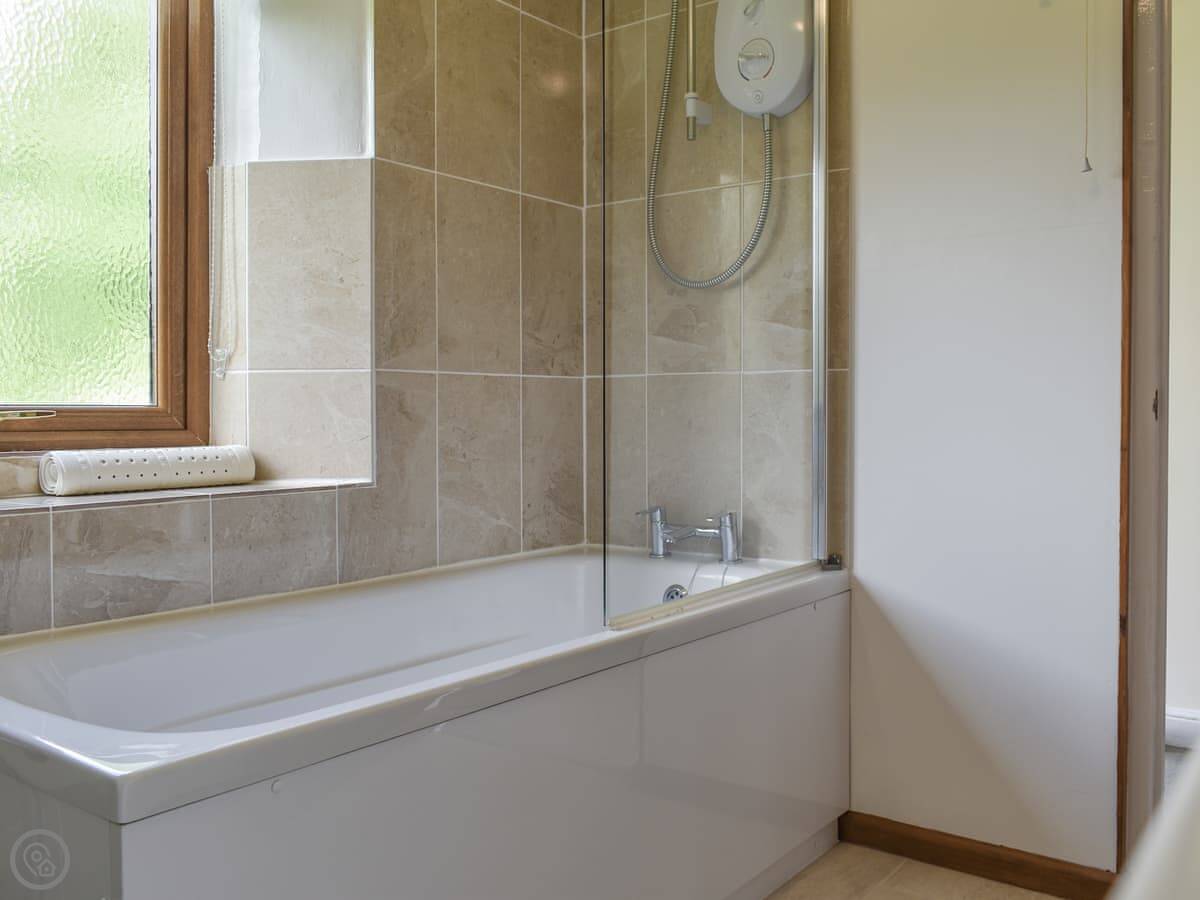 It's one bedroom, one bathroom. The bedroom has a double bed and the bathroom has a bath with an electric shower over it. The living space is all open plan. It's got everything you need, but it's compact. The best bit is the private deck. It catches the evening sun and looks out over the valley.