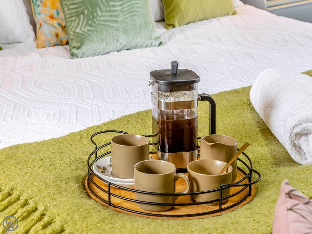 It sleeps six in three bedrooms. Each bedroom has its own bathroom or shower room. One has a super king bed, the other two have zip and link beds that can be either king-size or twins. There's a family bathroom with both a bath and a shower as well.