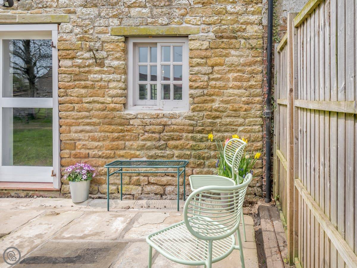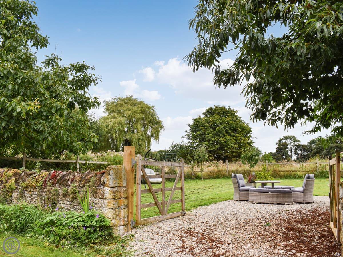 Downstairs is open plan: kitchen, dining and living area, with a wood burner. The kitchen is big and well-equipped. Doors open from the living area onto a small patio. Across a shared track there’s a private, enclosed paddock with garden furniture. It's a quiet spot, looking over fields.