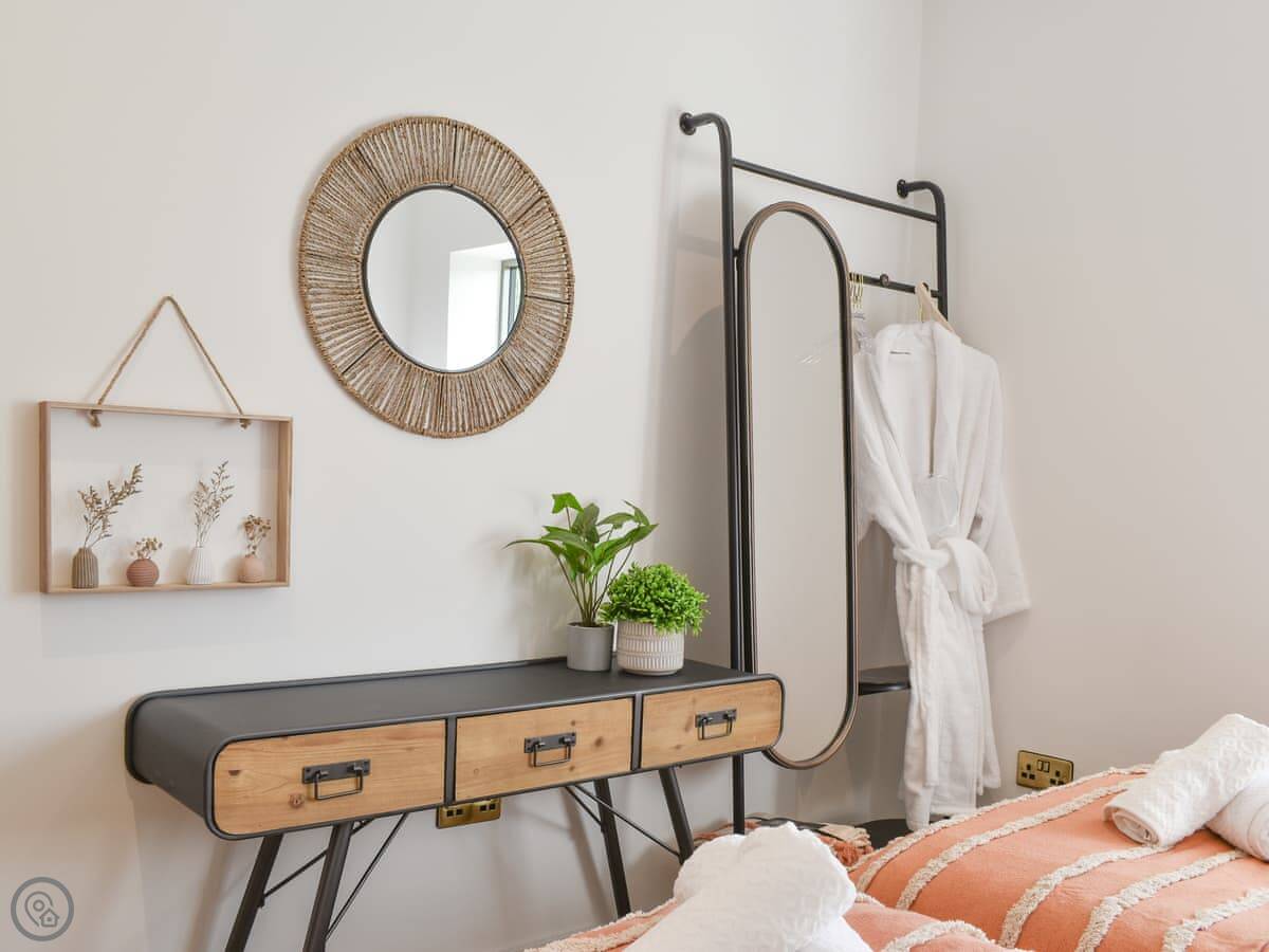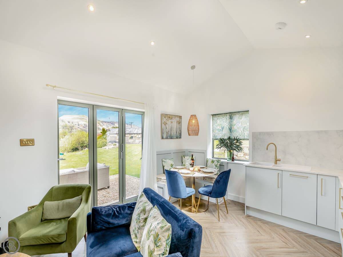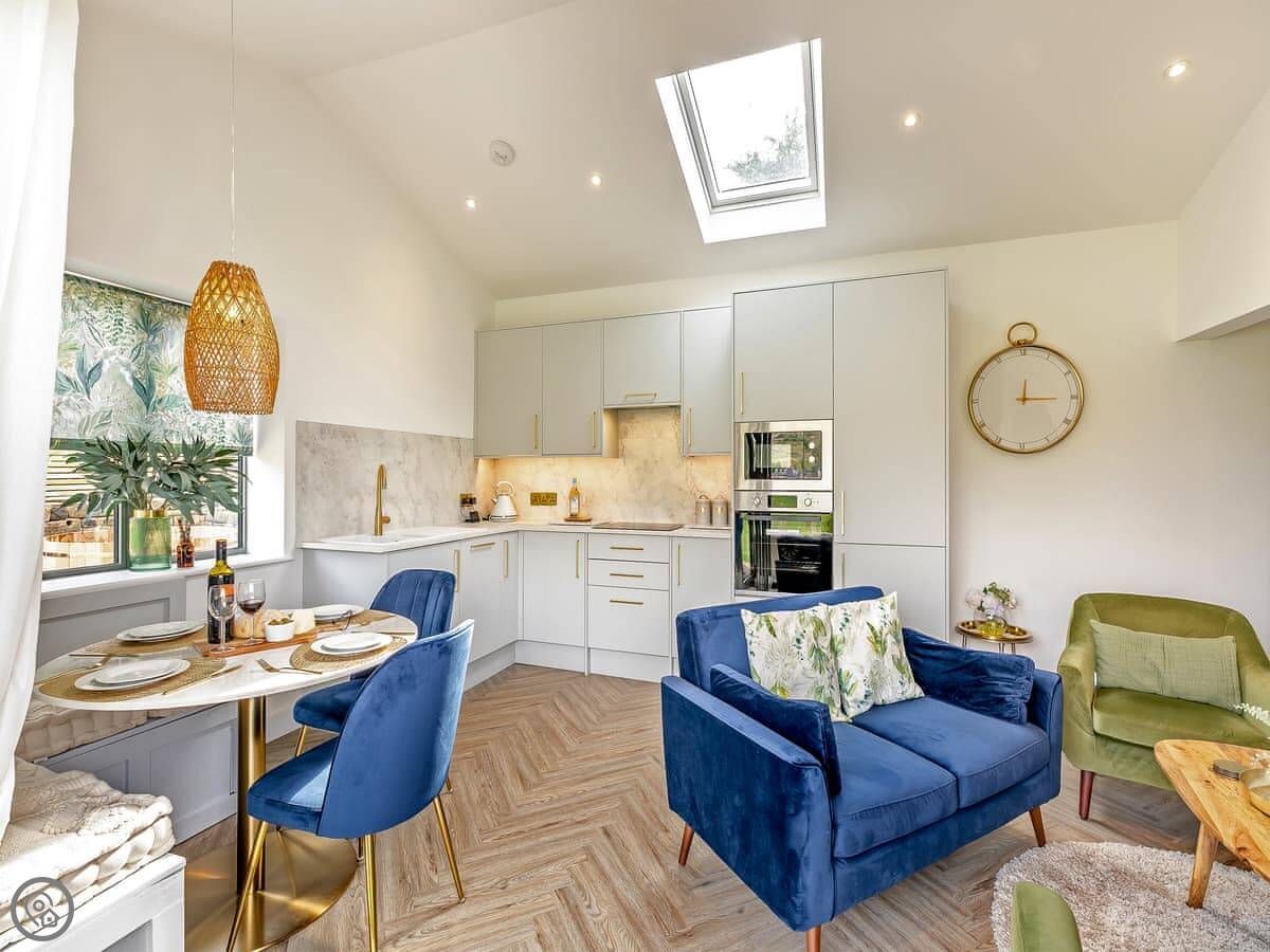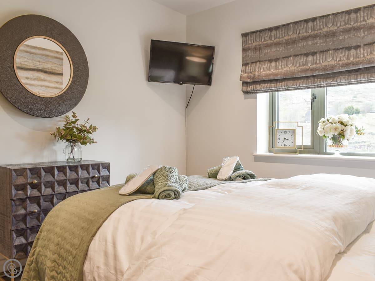 It sleeps four. Two bedrooms, one with a king bed and one with twins. One shower room. The main living space is all open plan, with underfloor heating and a wood burner. The shower is a good one.