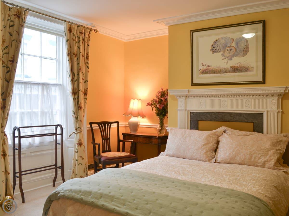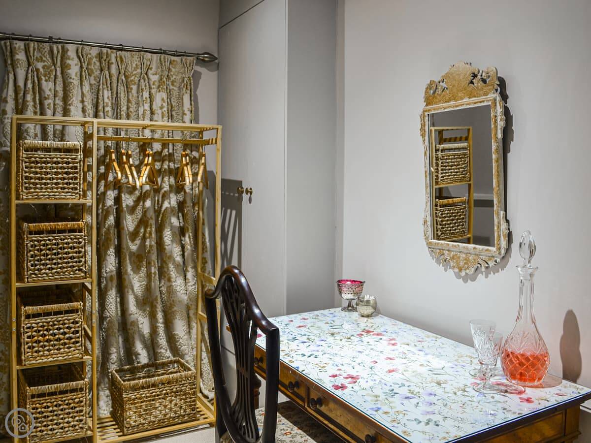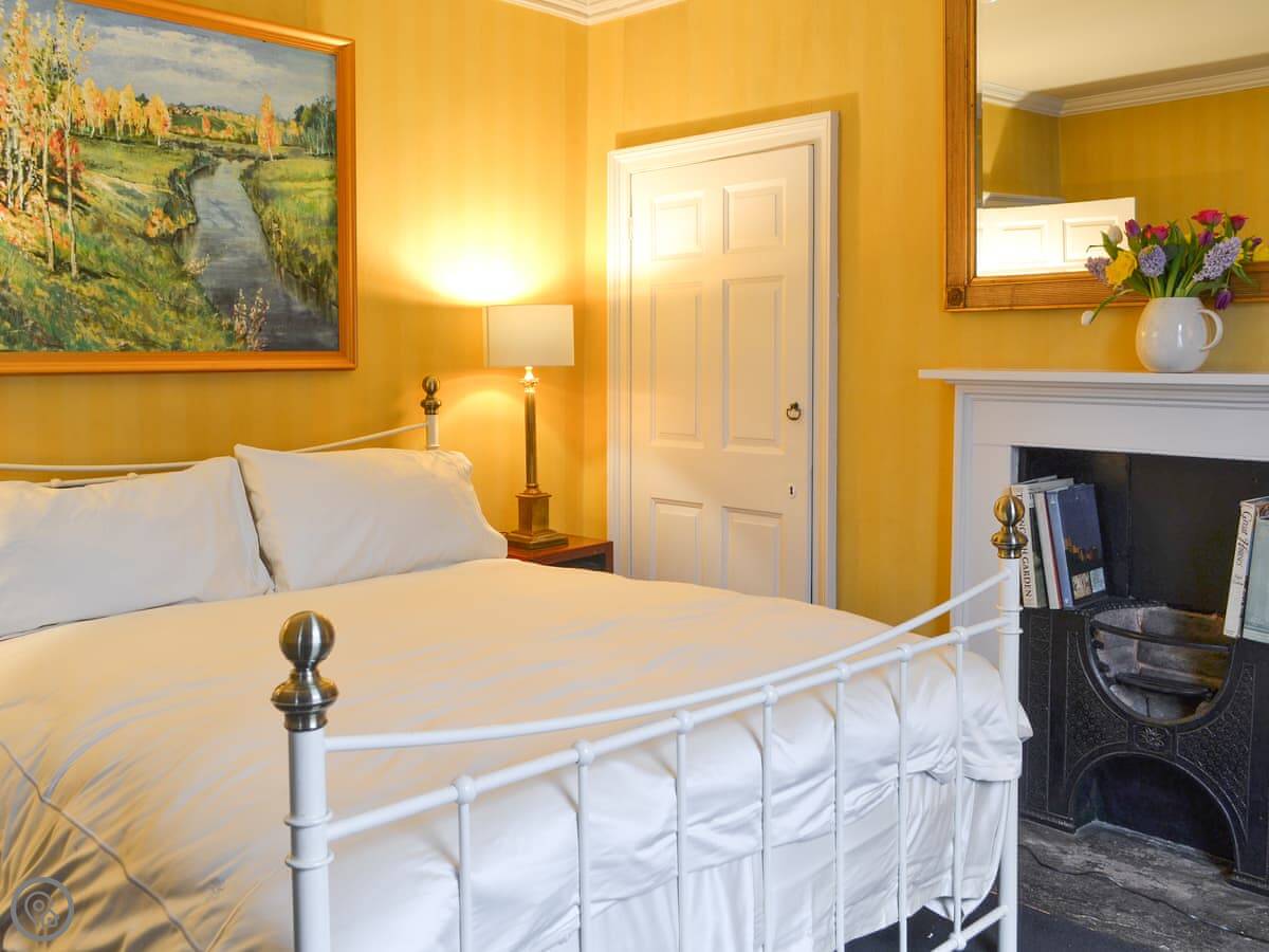 The layout is a bit different because it's old. You come in the front door to a hall. The kitchen and dining room are at the back. There's a walk-in pantry, which is original. One bedroom is on the ground floor, with a super king bed and a separate dressing room. Two of the bedrooms still have the original Georgian fireplaces.