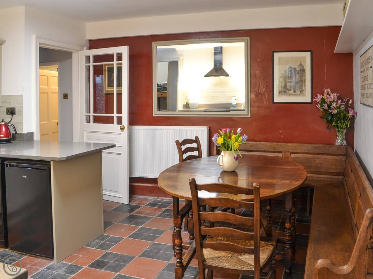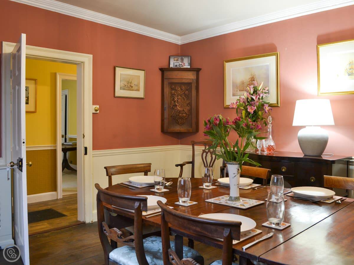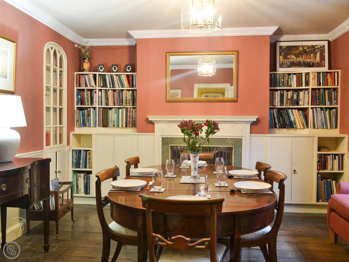 The layout is a bit different because it's old. You come in the front door to a hall. The kitchen and dining room are at the back. There's a walk-in pantry, which is original. One bedroom is on the ground floor, with a super king bed and a separate dressing room. Two of the bedrooms still have the original Georgian fireplaces.
