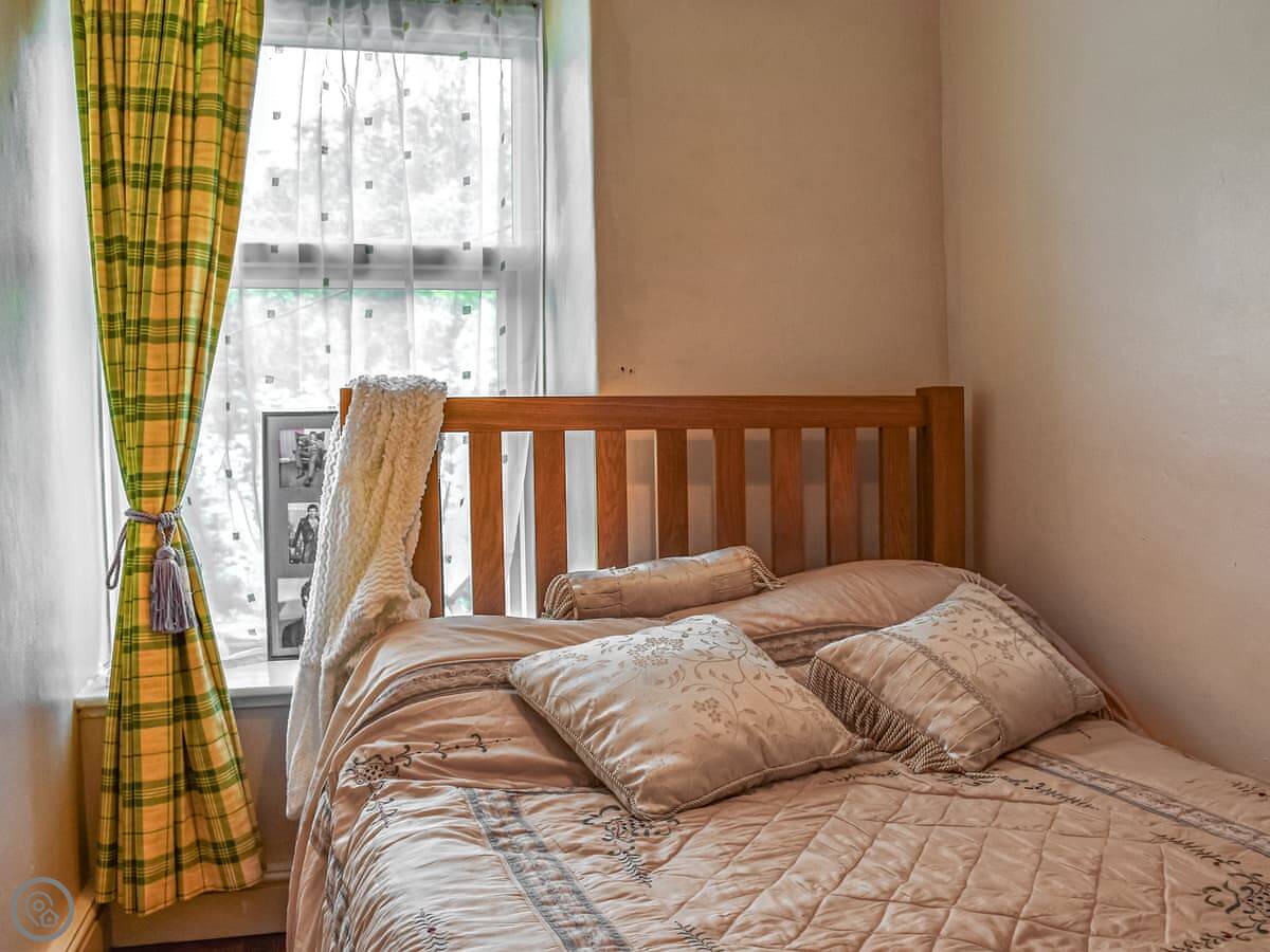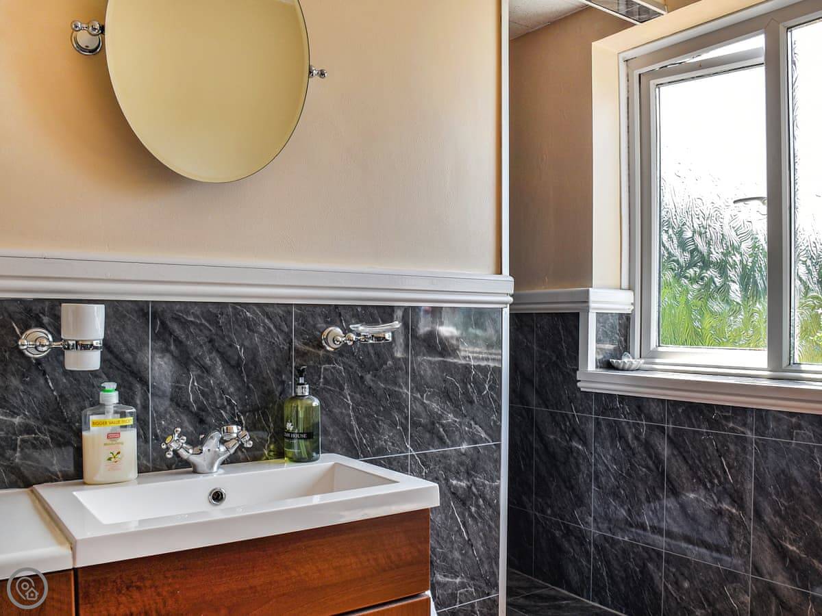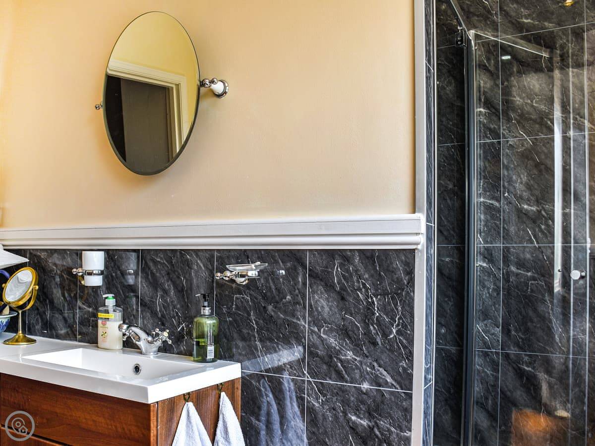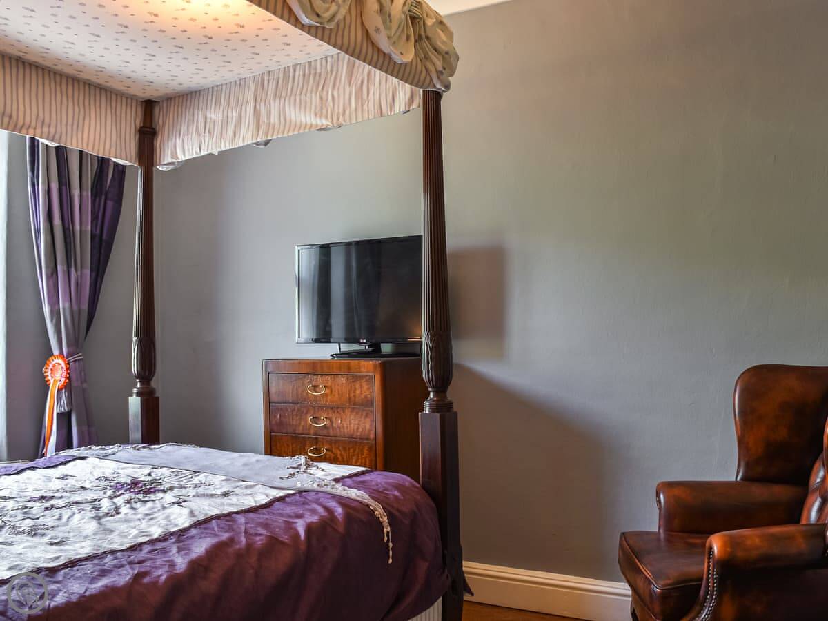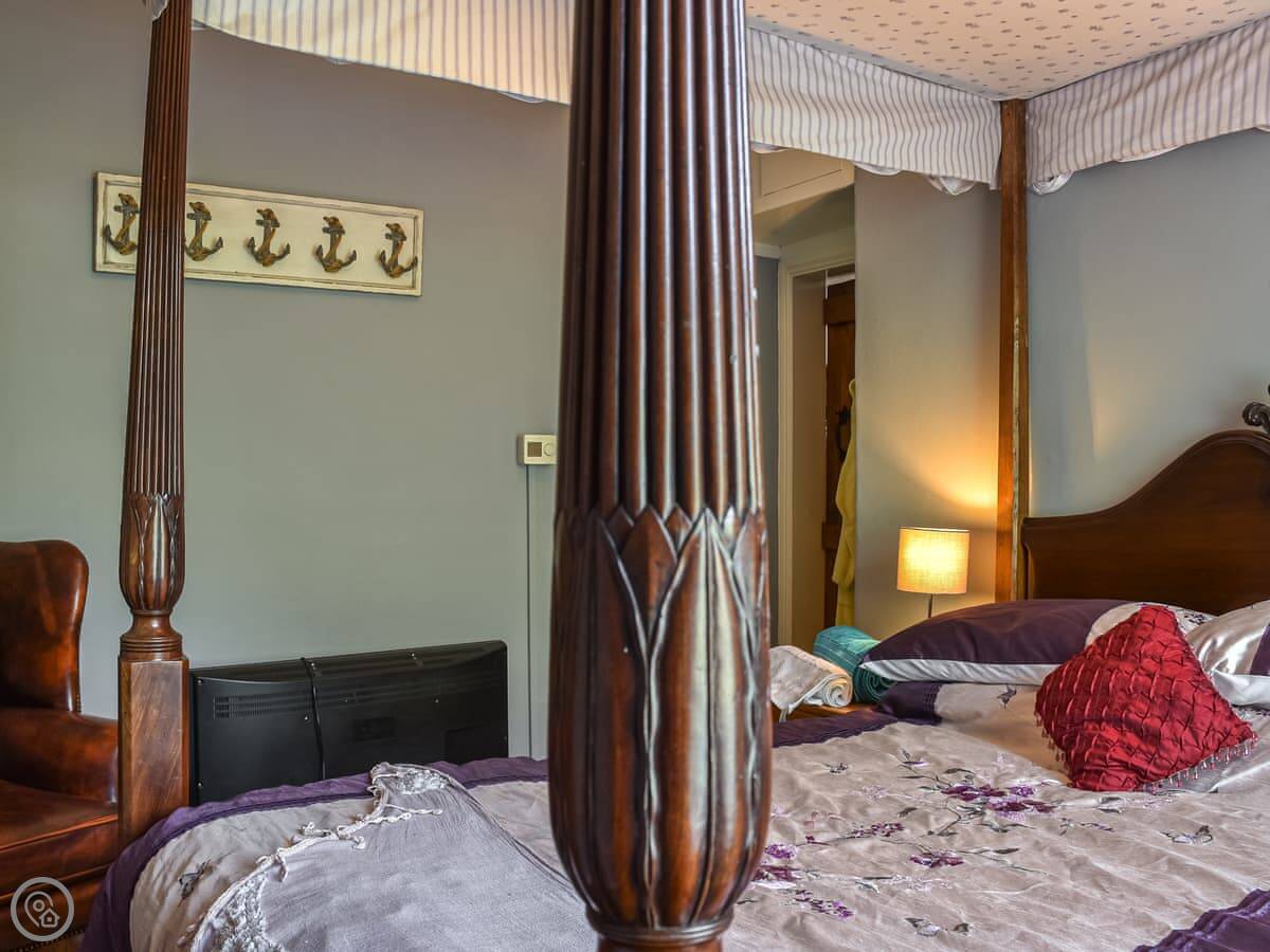 Upstairs, the main bedroom has a four-poster bed. Both bedrooms have TVs. The bathroom is a good size, with a walk-in shower.