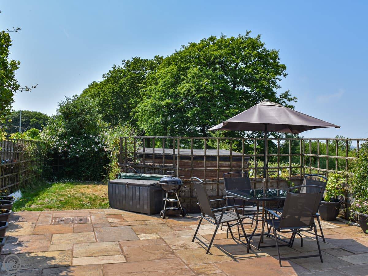 Outside, there's a patio area with a table and a BBQ. You look out over the garden and fields.
