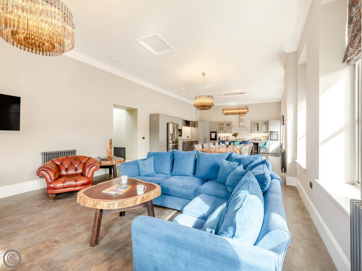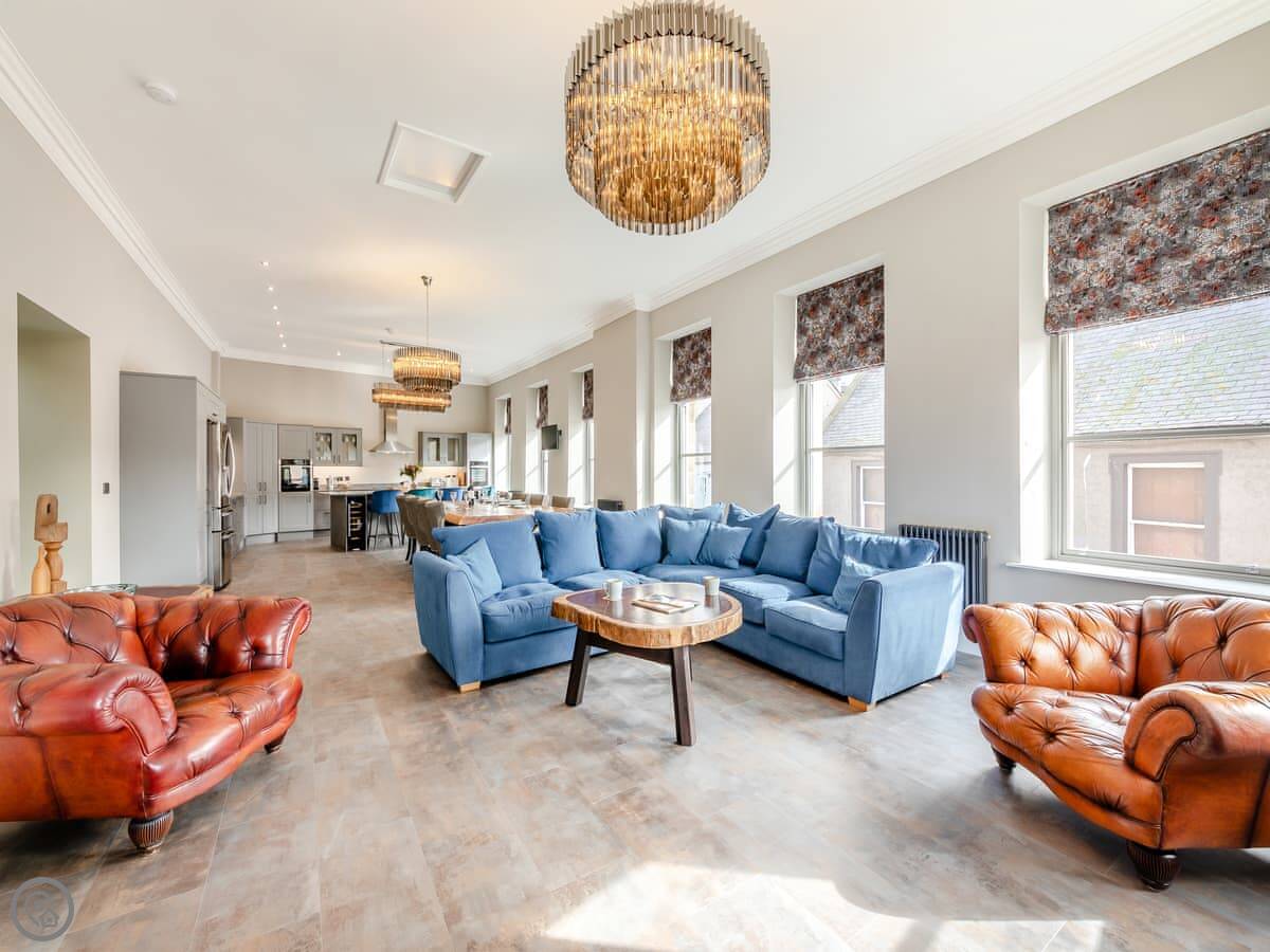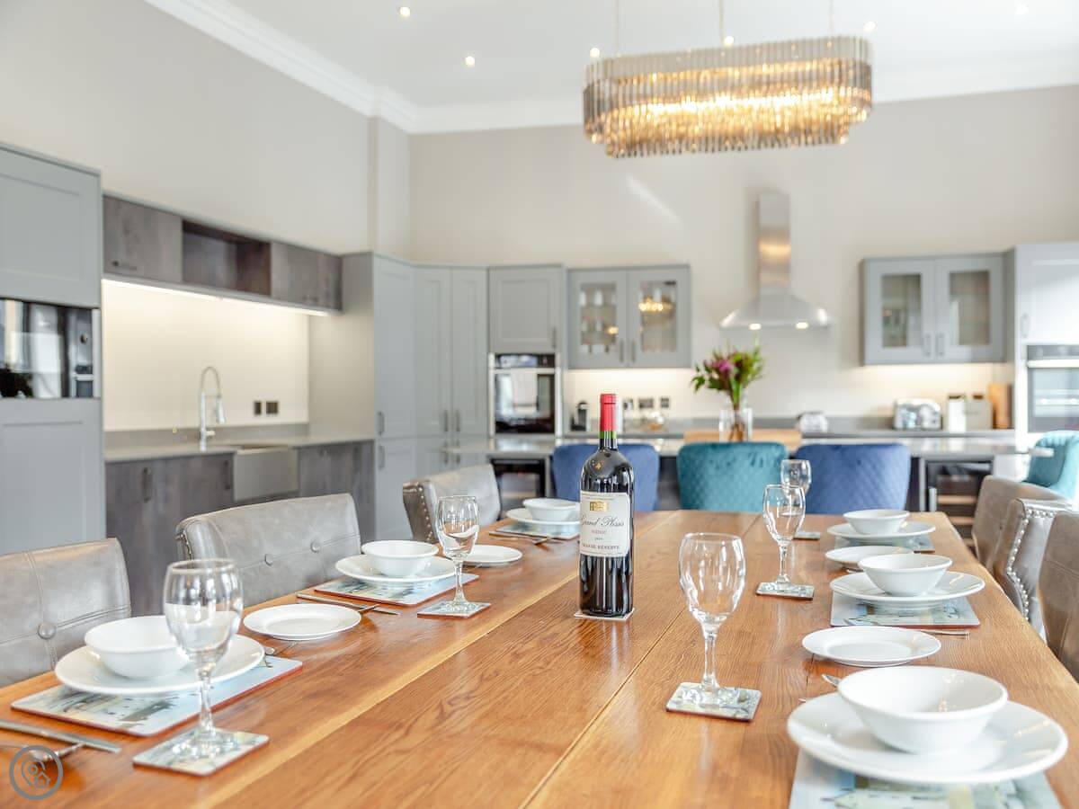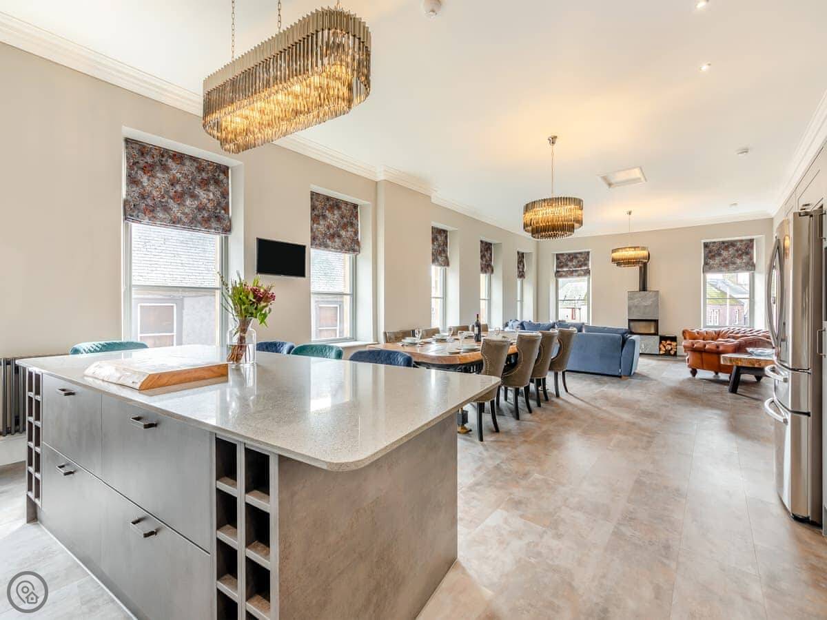 The main thing you'll notice is the space. It's a huge room, with the kitchen at one end, the dining area in the middle, and the sitting area with a wood burner at the other end. The ceilings are very high because it used to be a bank. The dining table is a big, solid piece made from old timber and iron. It seats everyone easily.