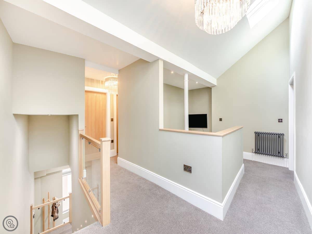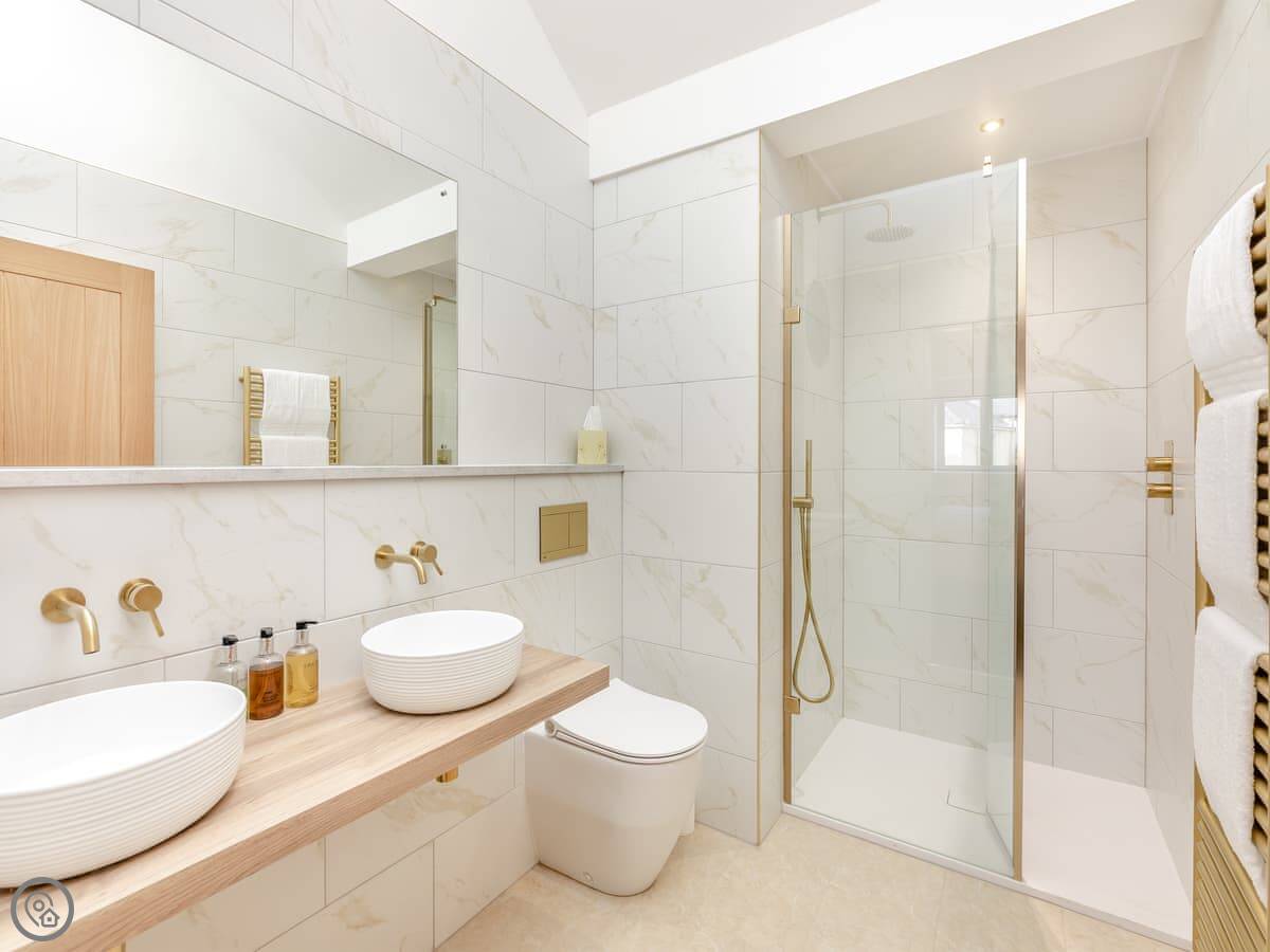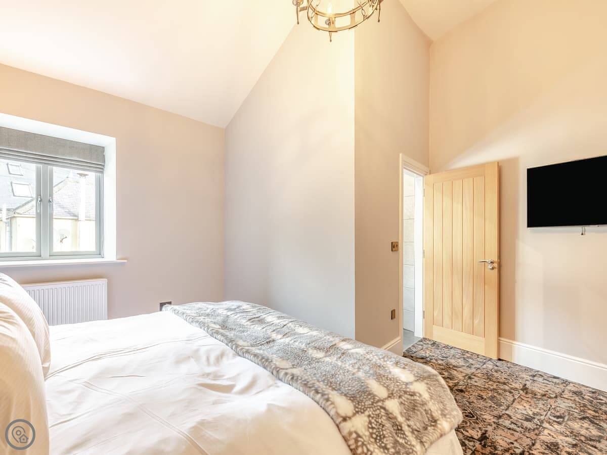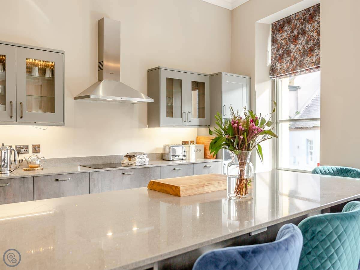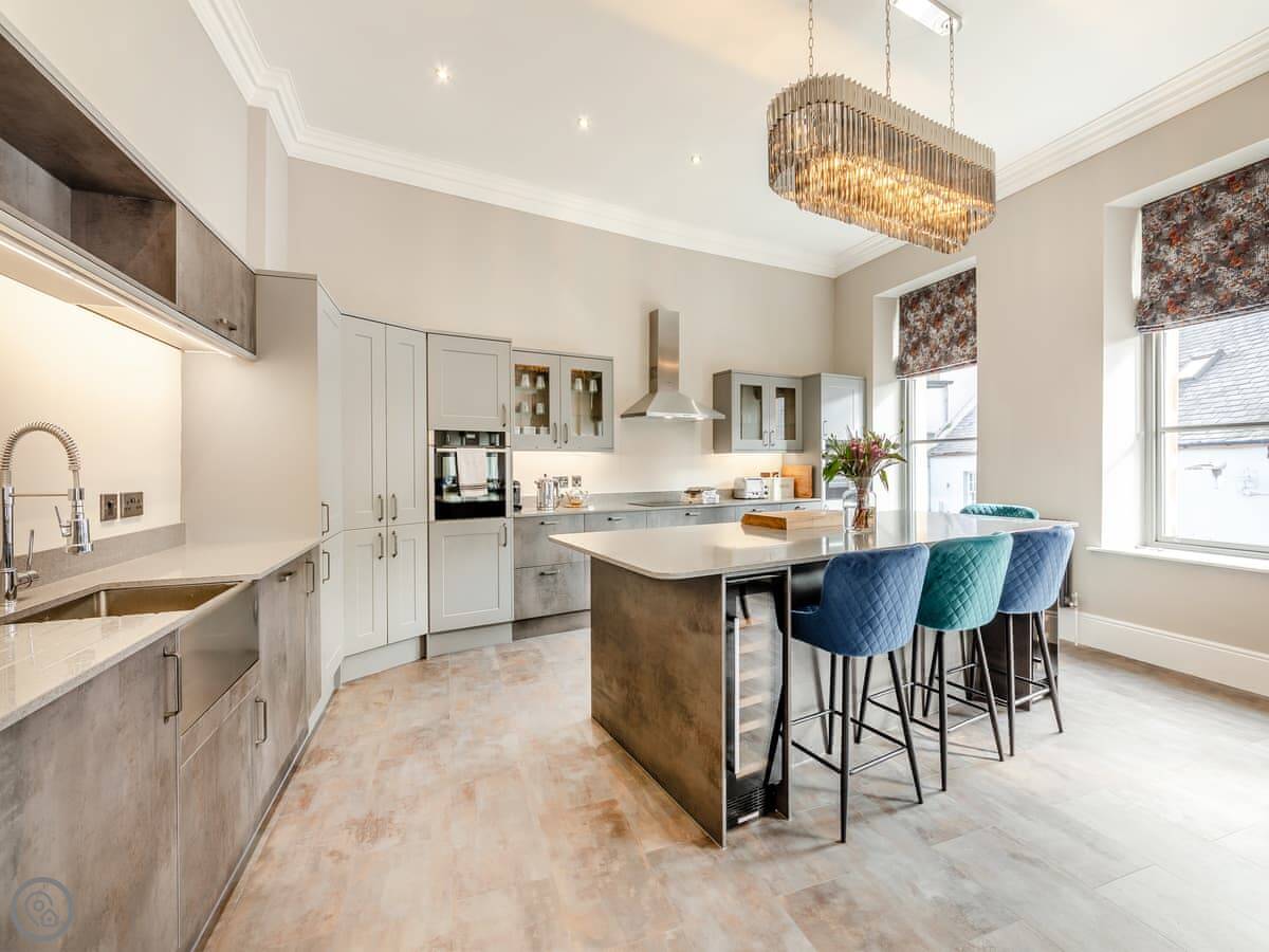 The kitchen's well equipped. There's an American fridge freezer with an ice maker, two ovens, a dishwasher, and a wine cooler. The bedrooms all have smart TVs. It's got a 5 Star rating, which means it's finished to a high standard.