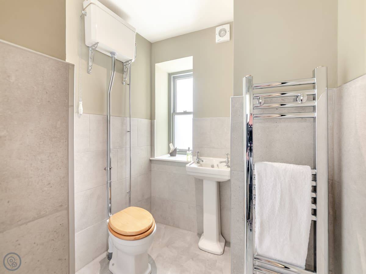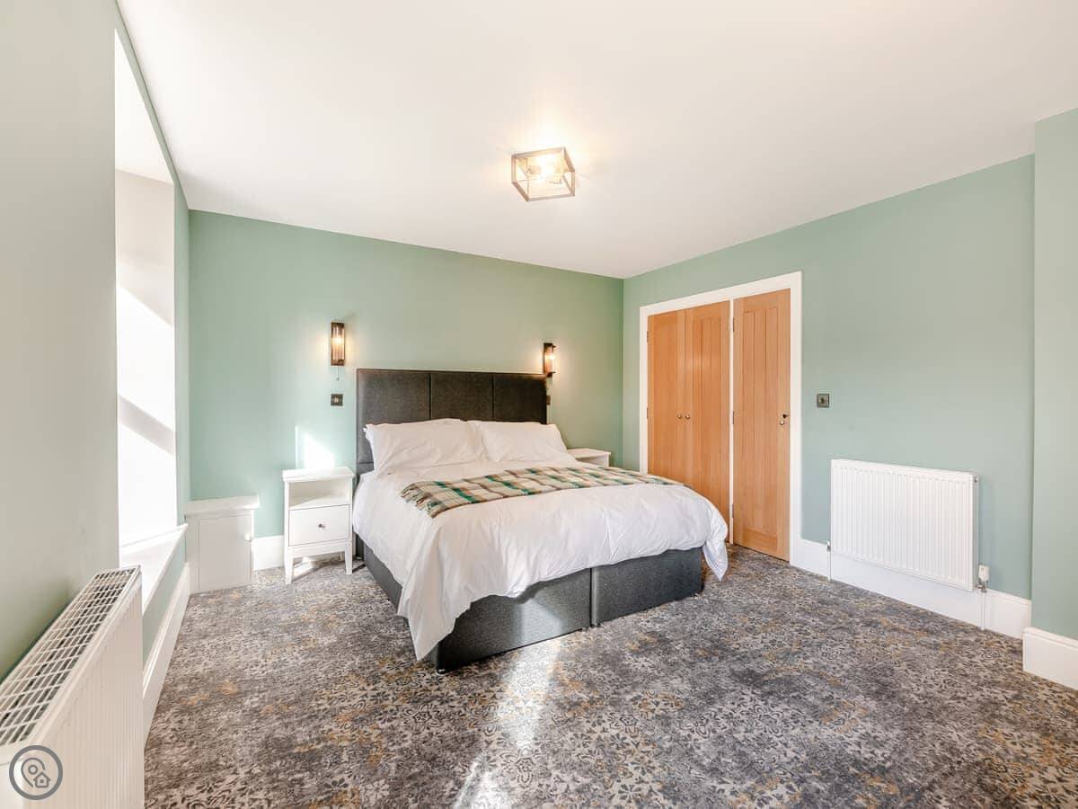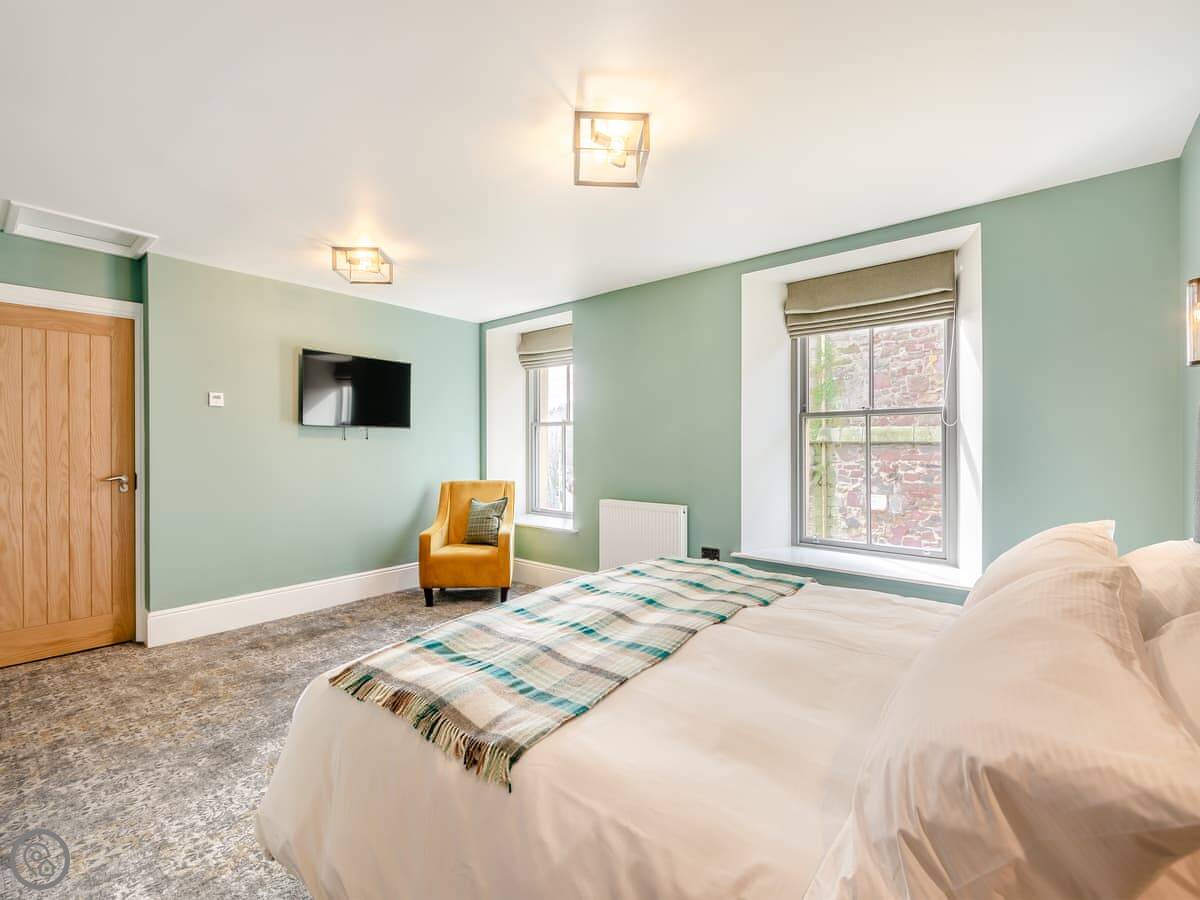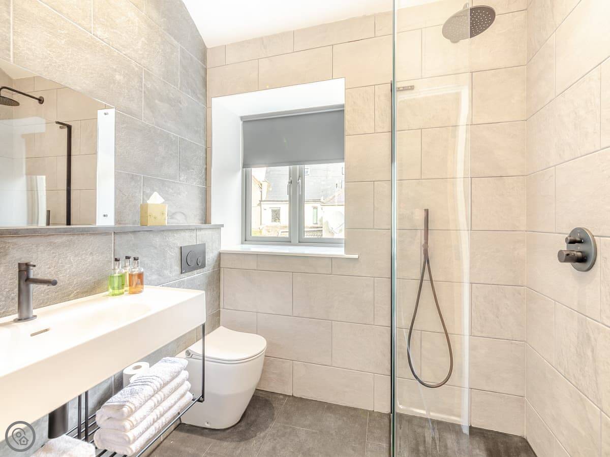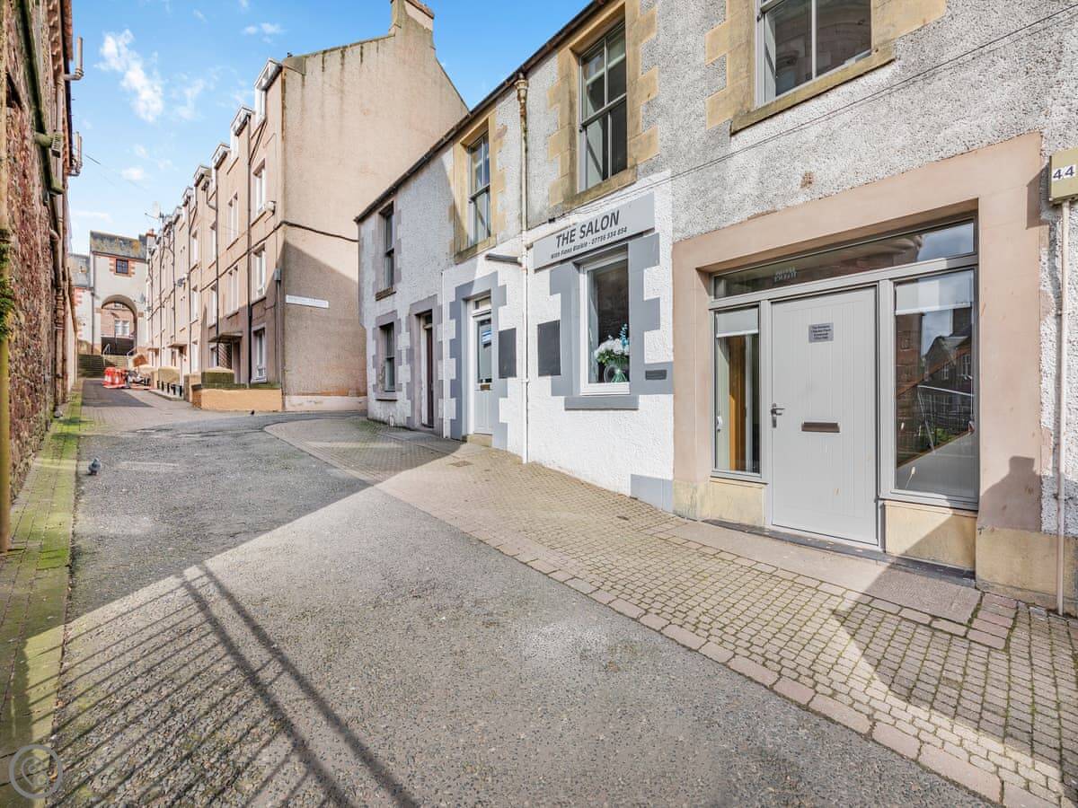 The Embassy is a flat on the top floor of the old bank building on the High Street in Eyemouth. It's got three bedrooms, each with a kingsize bed, and three bathrooms. Two of those are en-suite. There's parking for one car at the back, which is handy.