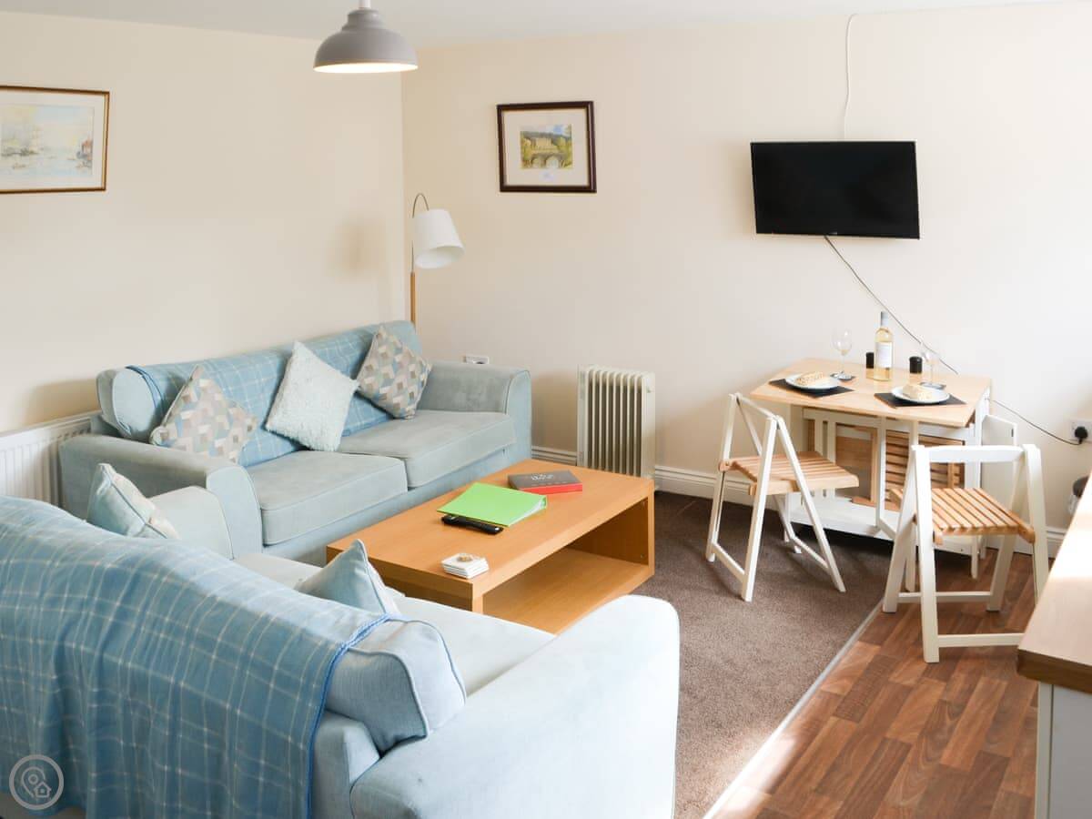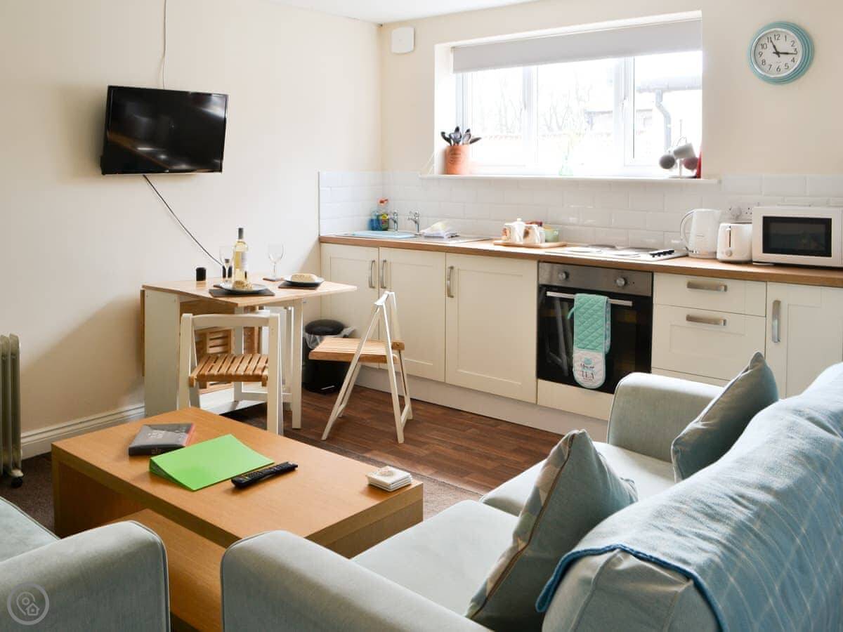 The bathroom is on the ground floor, which is handy. It's open plan living, so the kitchen and sitting area are together. There's a TV and WiFi. Bedding and towels are included. You can park on site.
