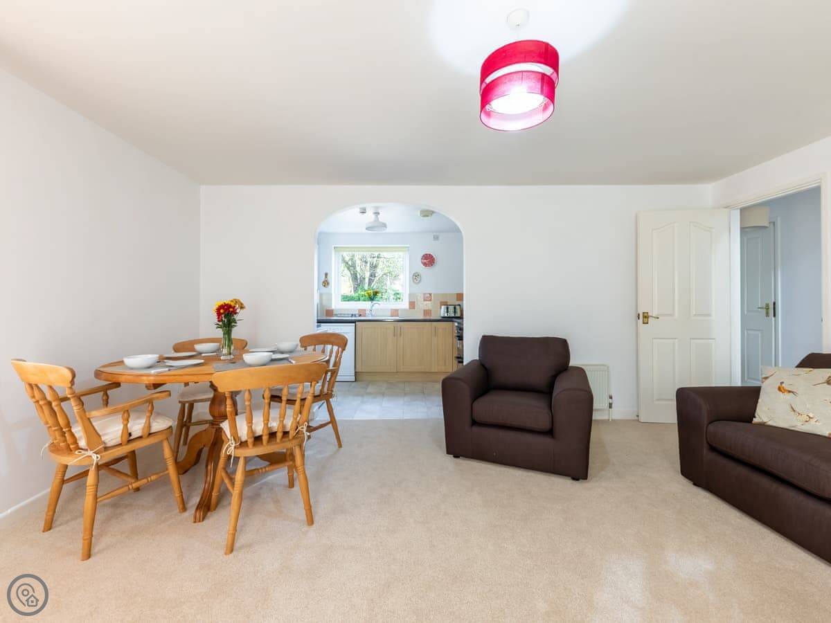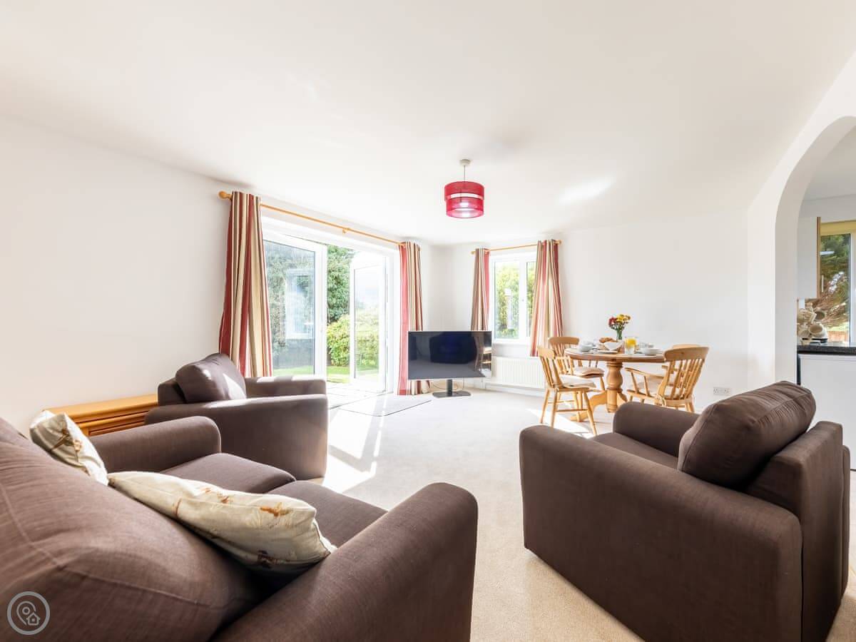 The main room is open plan, kitchen at one end, living area at the other. There are French doors out to the patio. The kitchen has a dishwasher and a coffee machine. There's a TV and wifi.