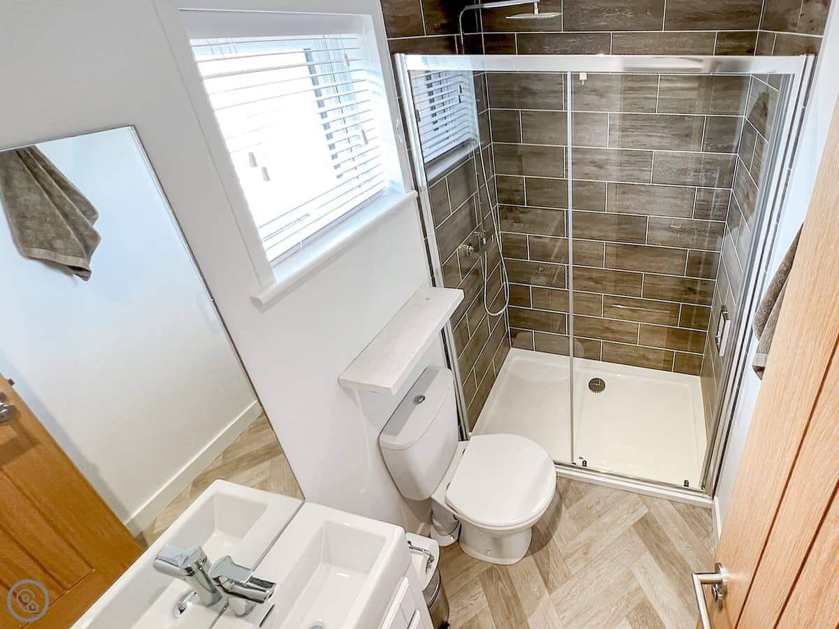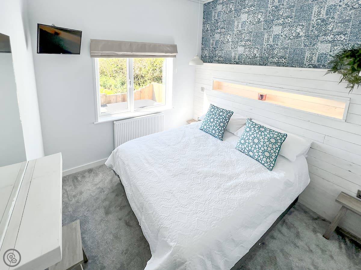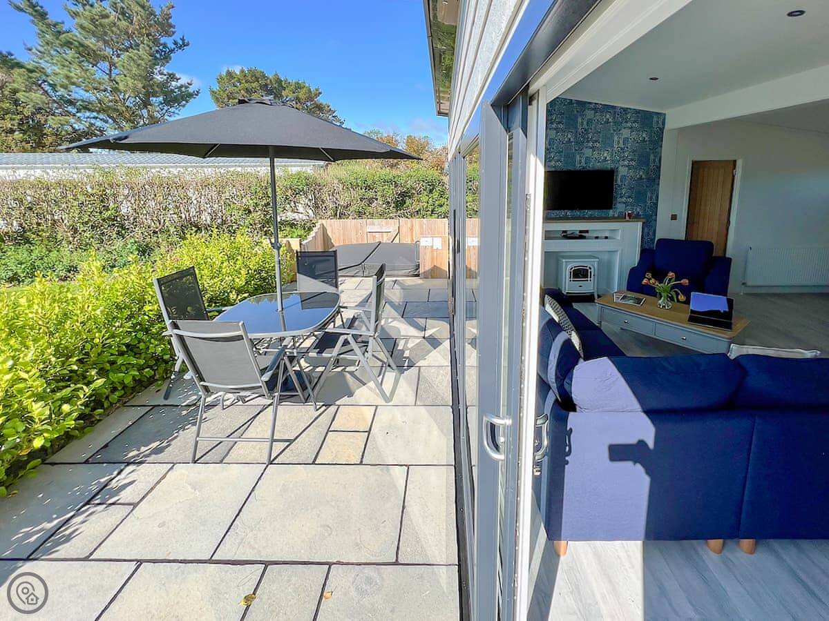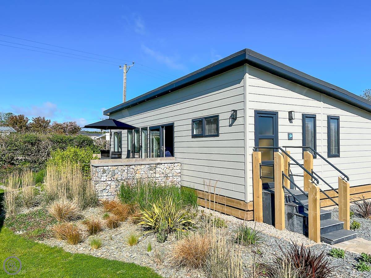 This is Hoburne. It's a lodge on a holiday park near St Mabyn in Cornwall. It's detached, so it's just you. There's a patio with a garden area and a hot tub.