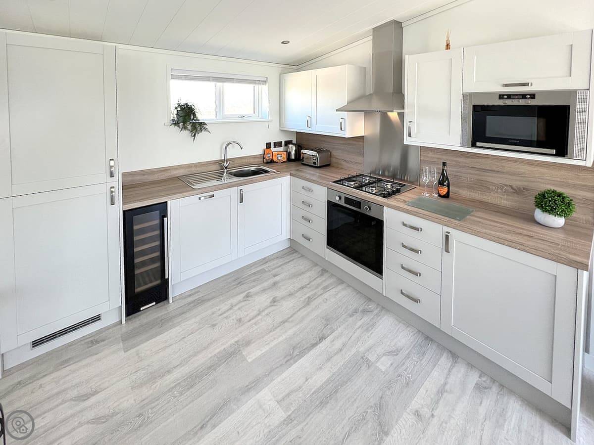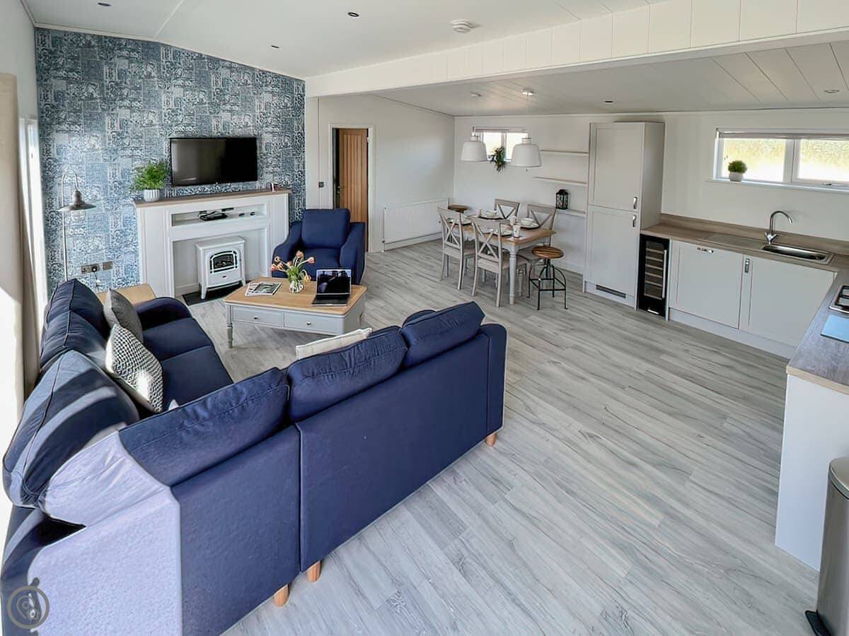 Inside, it's open plan. The kitchen has everything, including a dishwasher and a washing machine. There's a wine cooler if that's your thing. The living area has a TV and wifi. It's all very clean and comfortable.