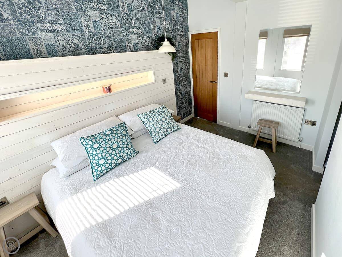 It sleeps four. Two bedrooms, both with their own bathrooms. One has a king size bed, the other can be either twin beds or a super king. It's a 5 Star place, so it's well kitted out and finished to a high standard. Everything's included, like bedding, towels, and utilities. There's parking right outside.