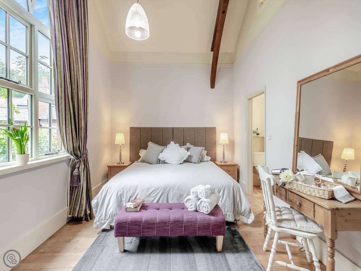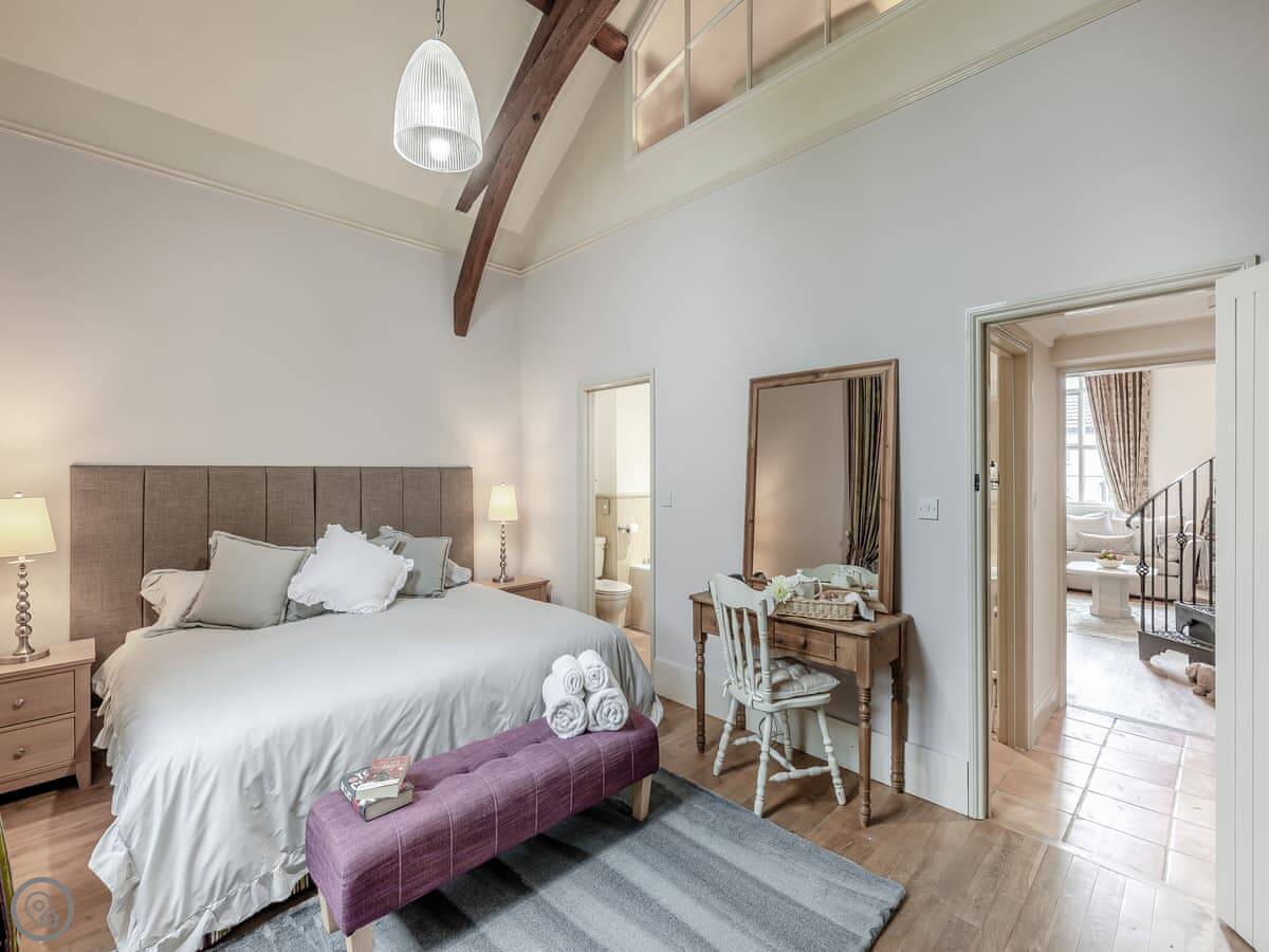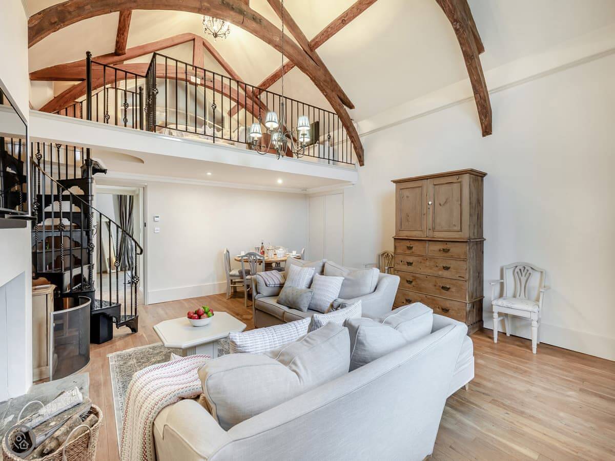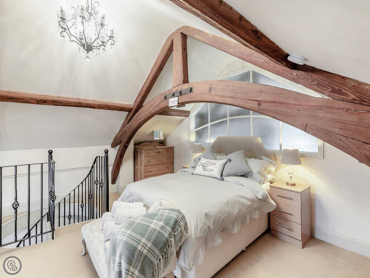 It sleeps four in two bedrooms. Both are double rooms with their own bathrooms. It has a 4 Star rating. The stairs to the second bedroom are a spiral staircase. They're steep.