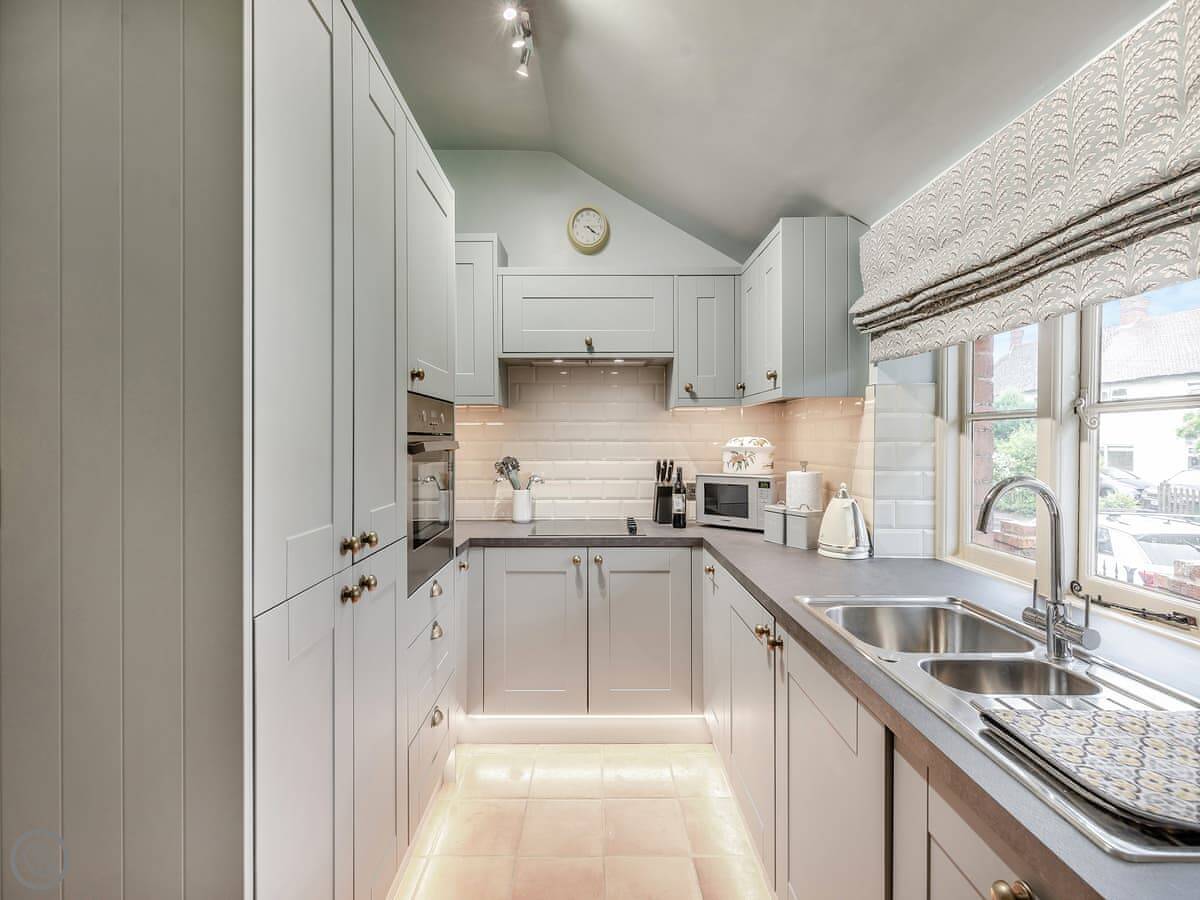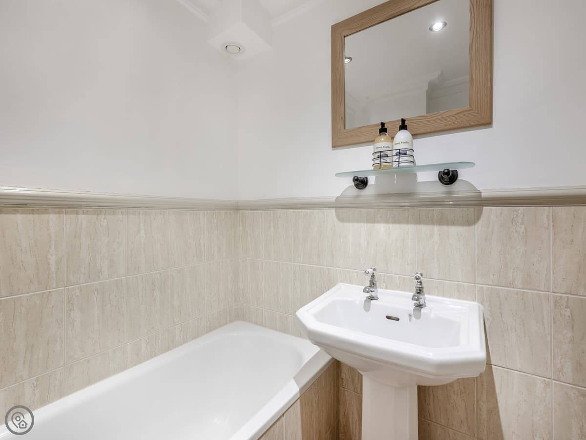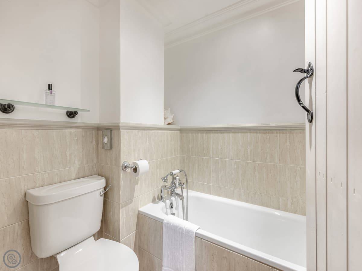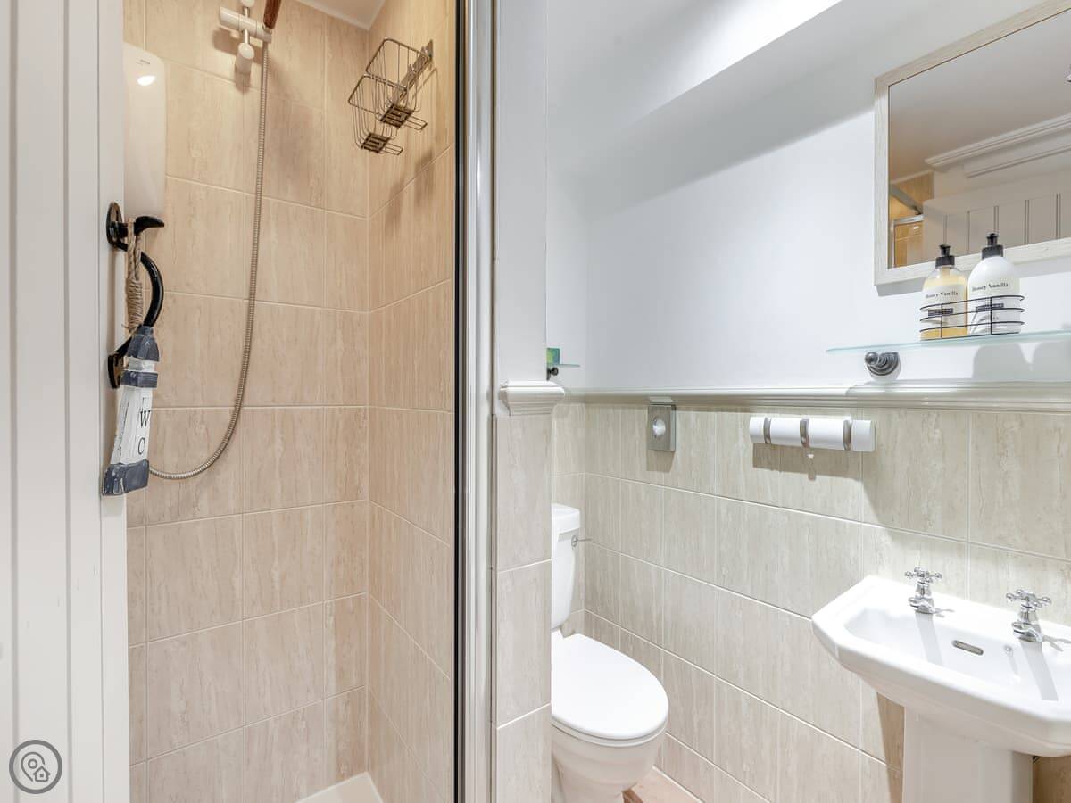 It sleeps four in two bedrooms. Both are double rooms with their own bathrooms. It has a 4 Star rating. The stairs to the second bedroom are a spiral staircase. They're steep.