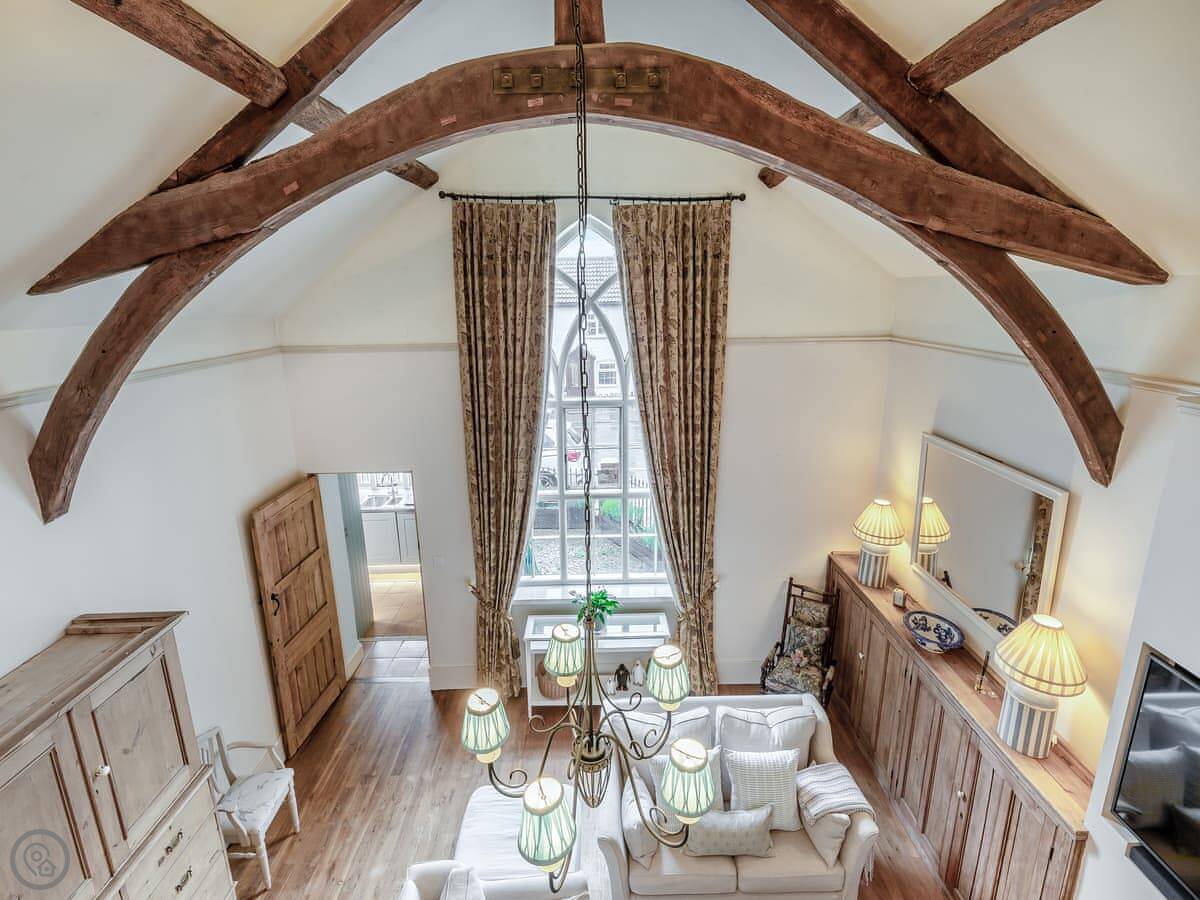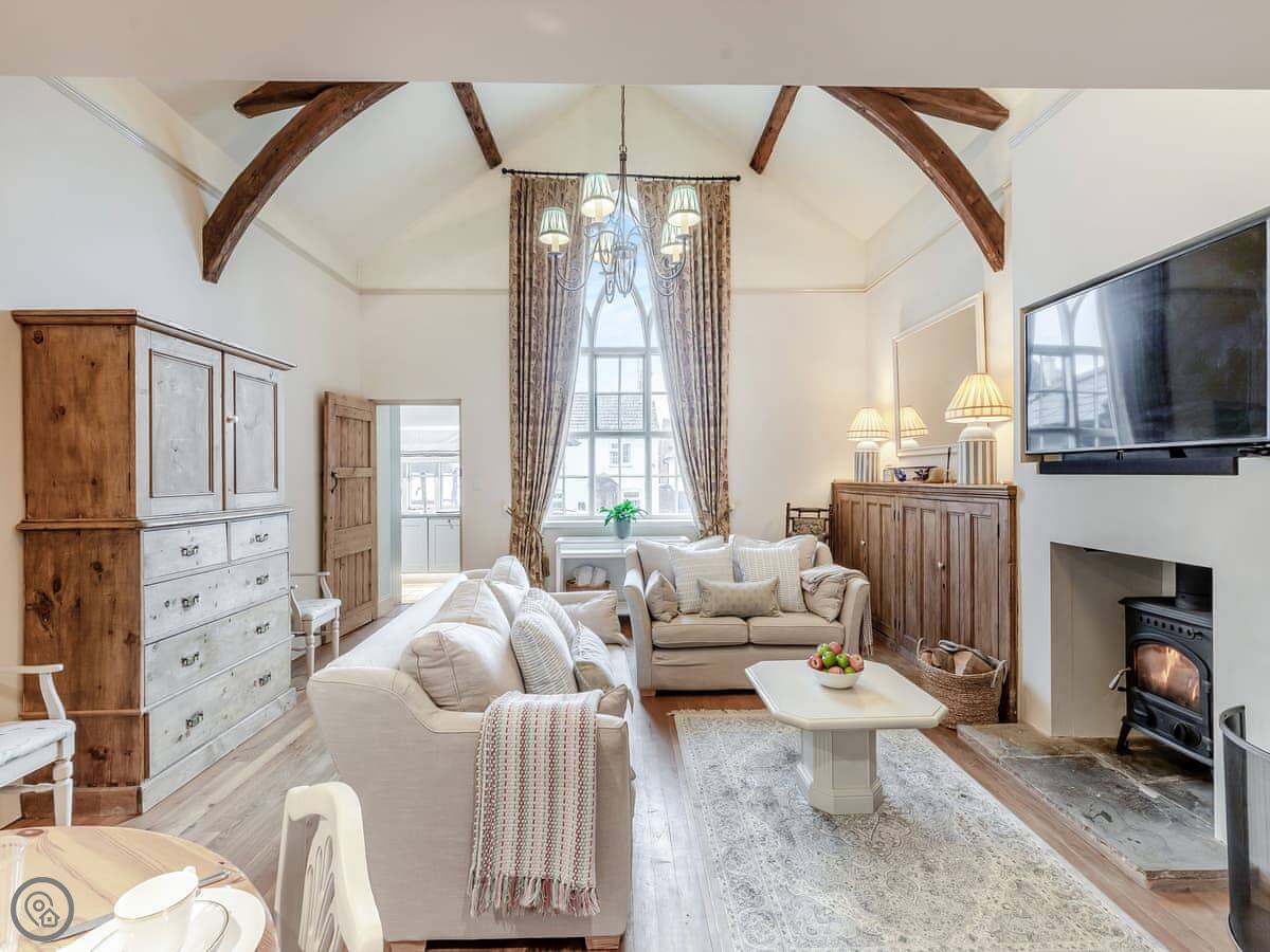 The main living space is big, with high oak beams and a wood burner. There's a large arched window that lets in a lot of light. The kitchen is off that room.