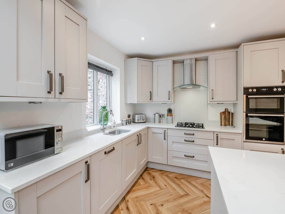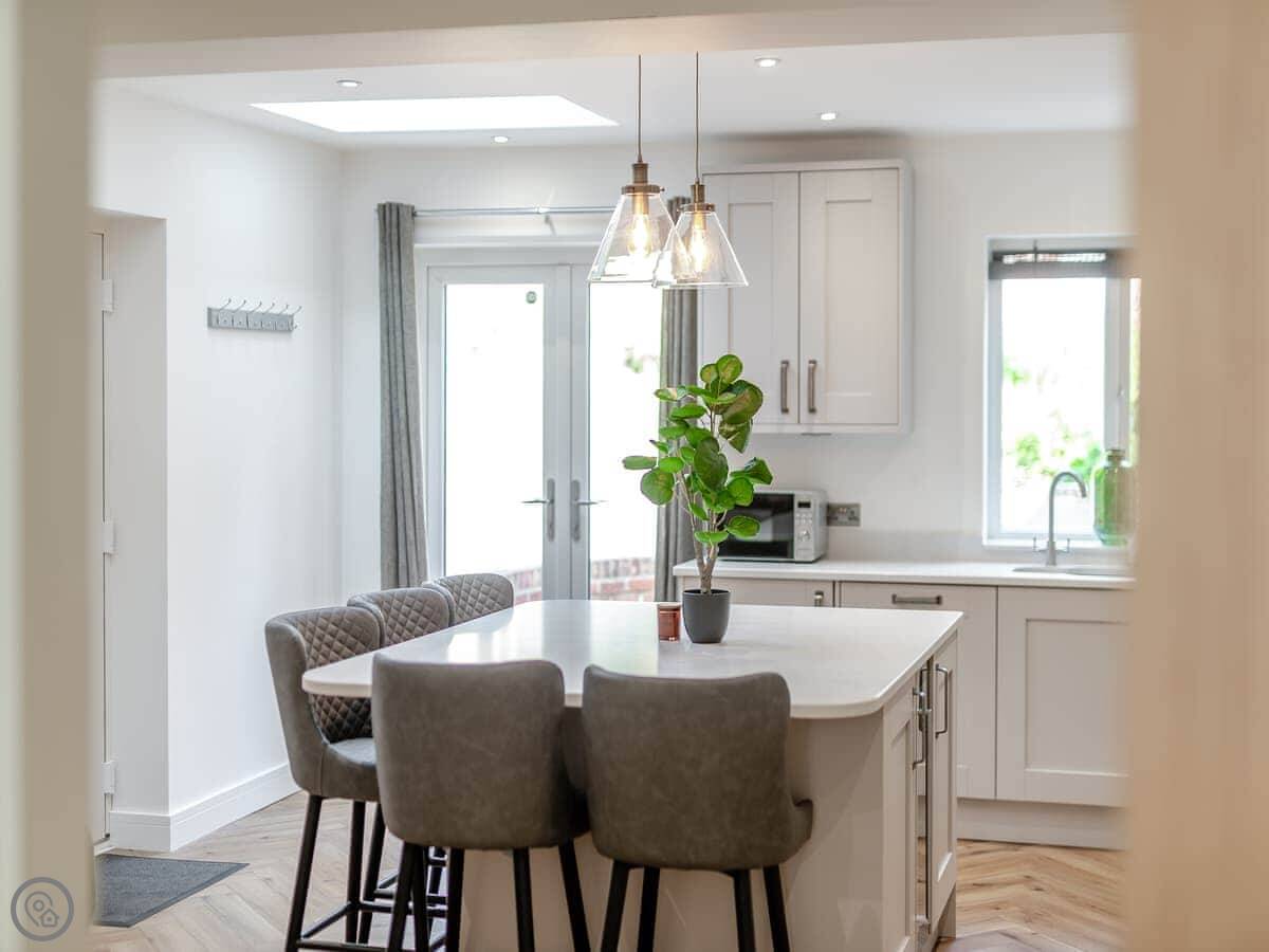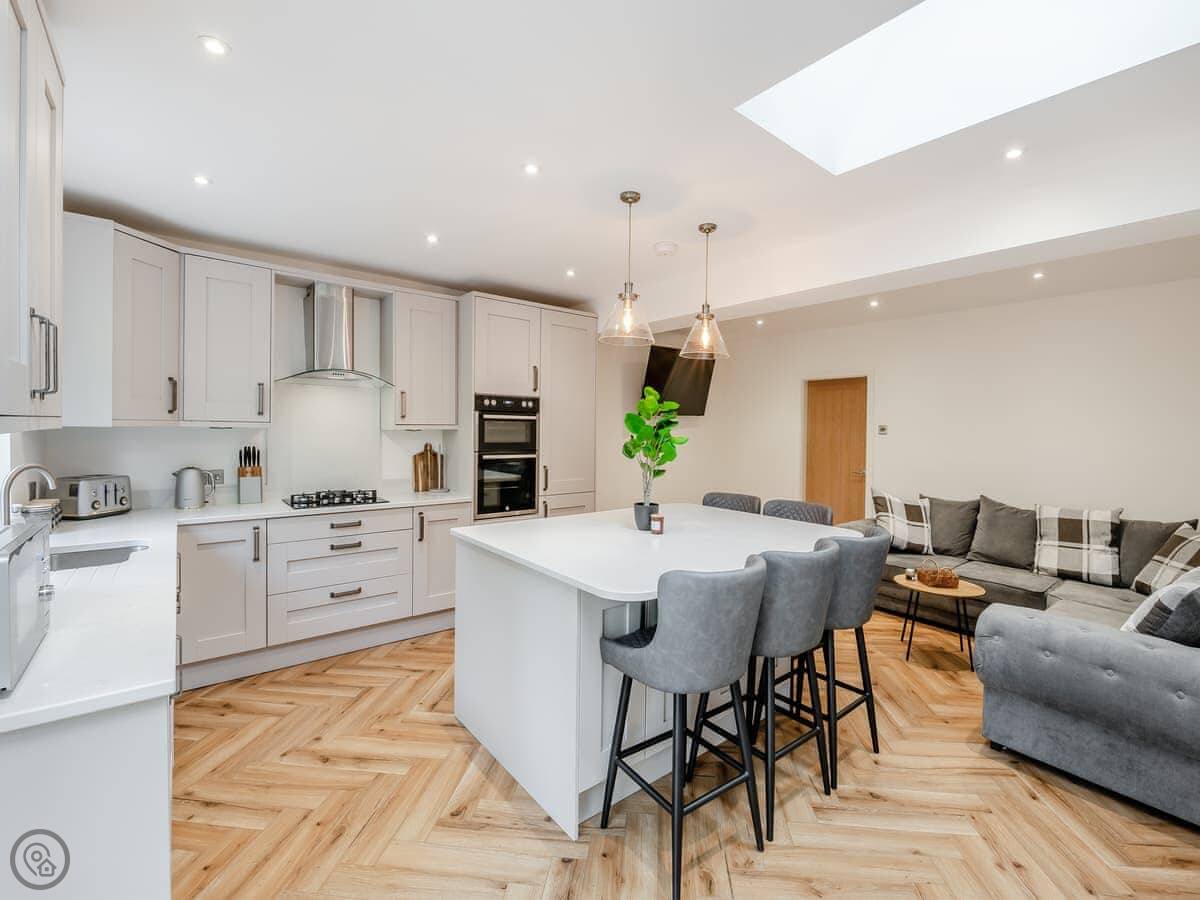 It sleeps six, in three bedrooms. There are two bathrooms, one is an en-suite to the main bedroom. It’s got a 4 Star rating. That means it’s well looked after, comfortable. It’s been renovated, so the kitchen is modern and there’s an open plan living area.