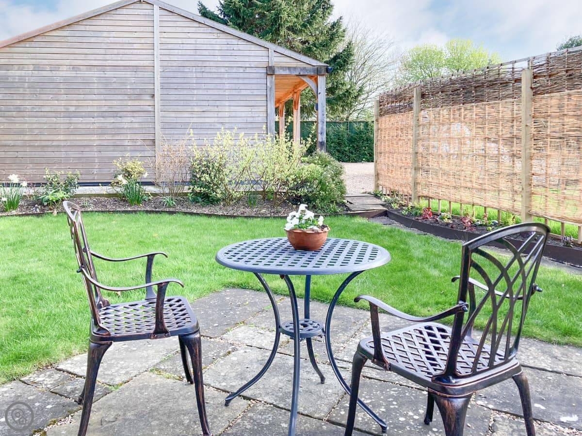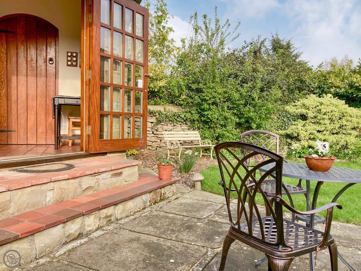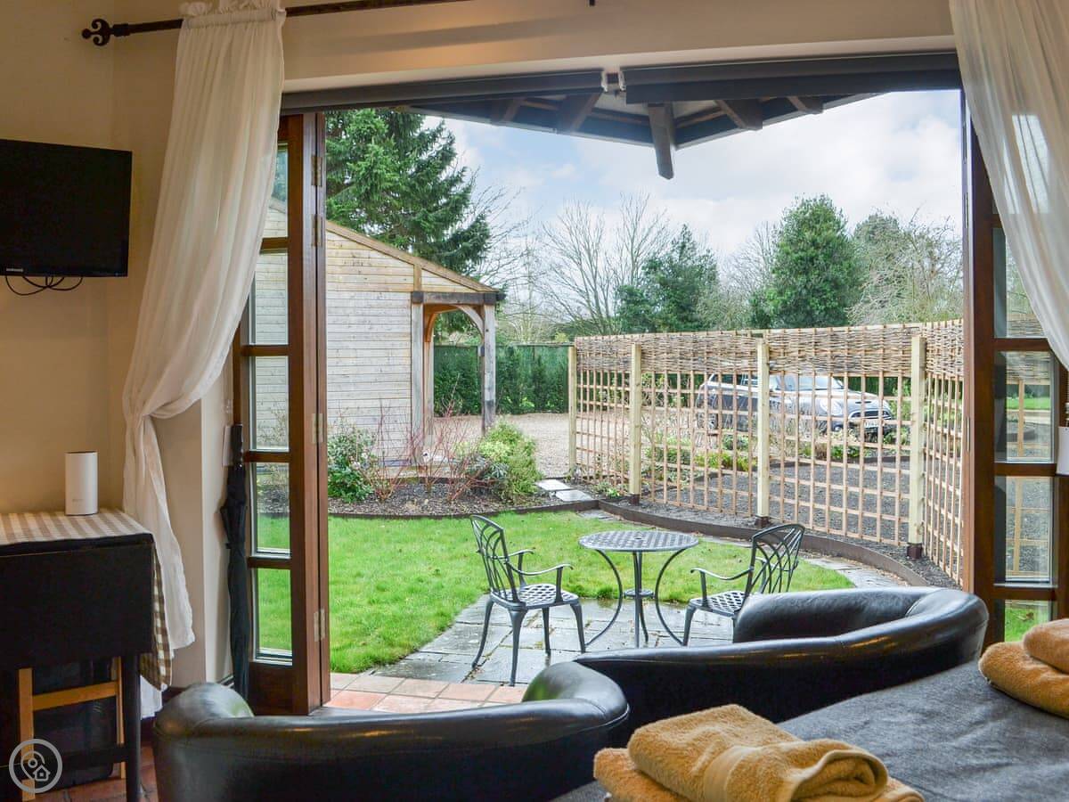 There are two steps up to get inside. The main doors are French doors which open straight out onto your own enclosed garden area. It's private out there, good for a coffee in the morning.